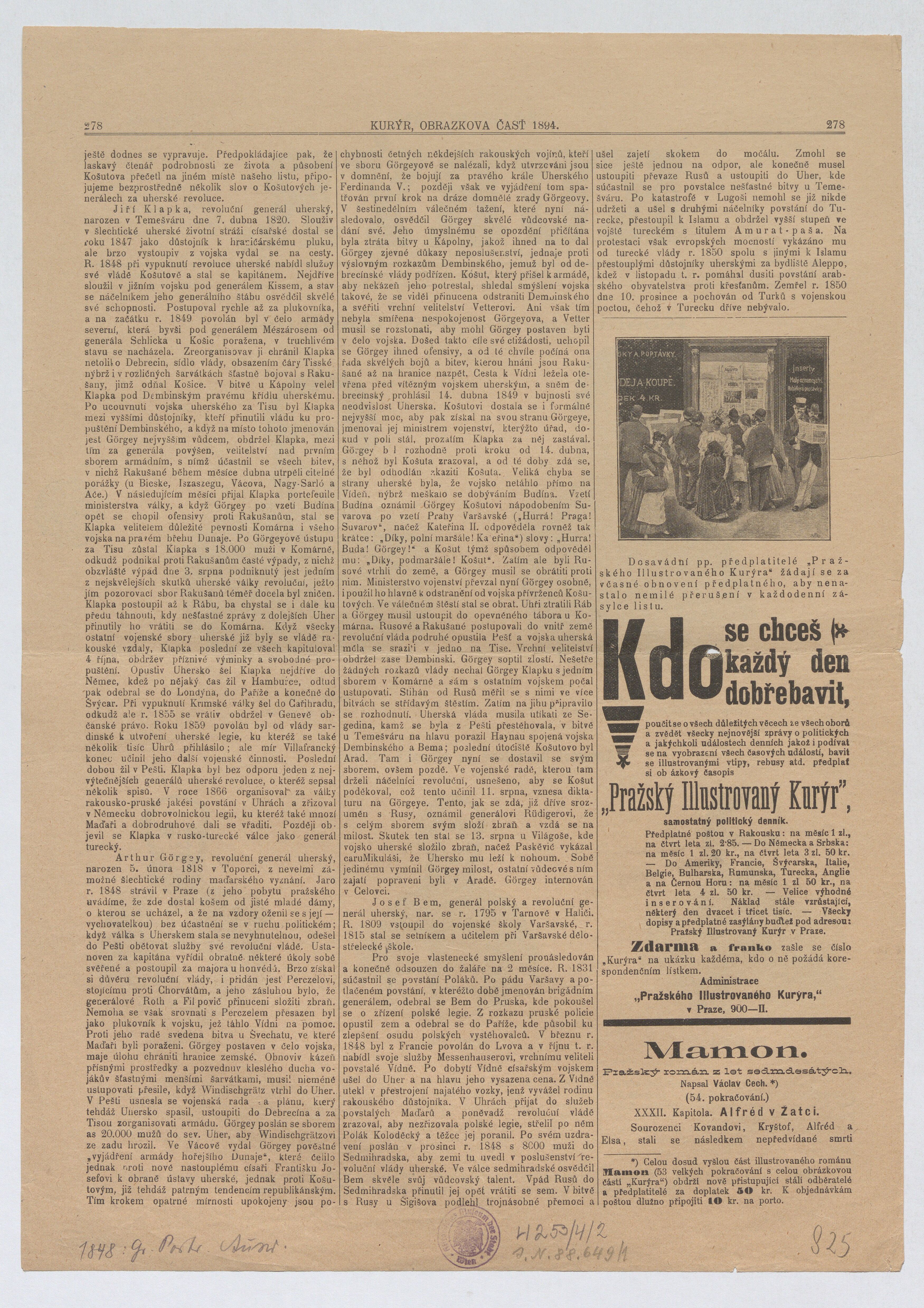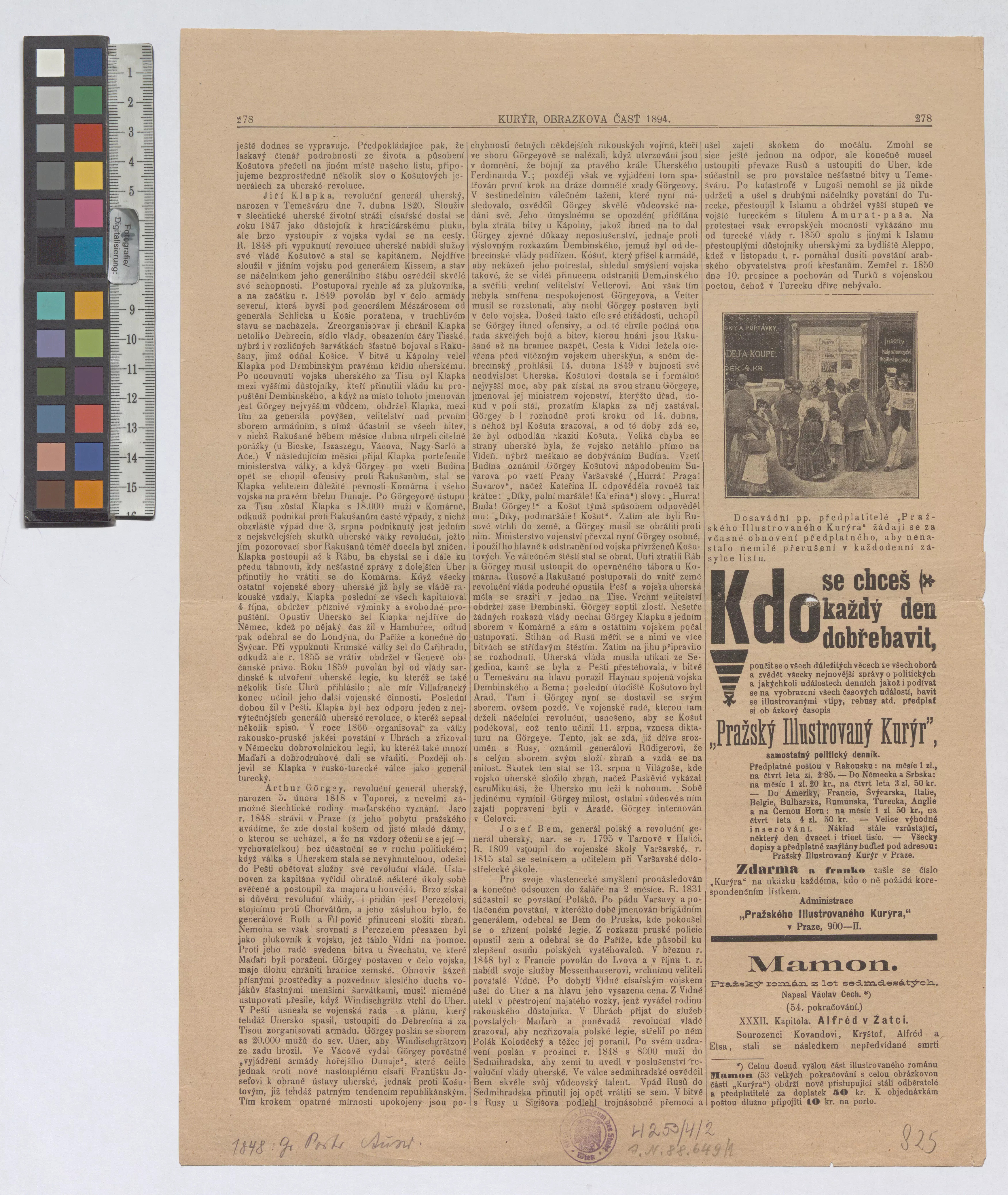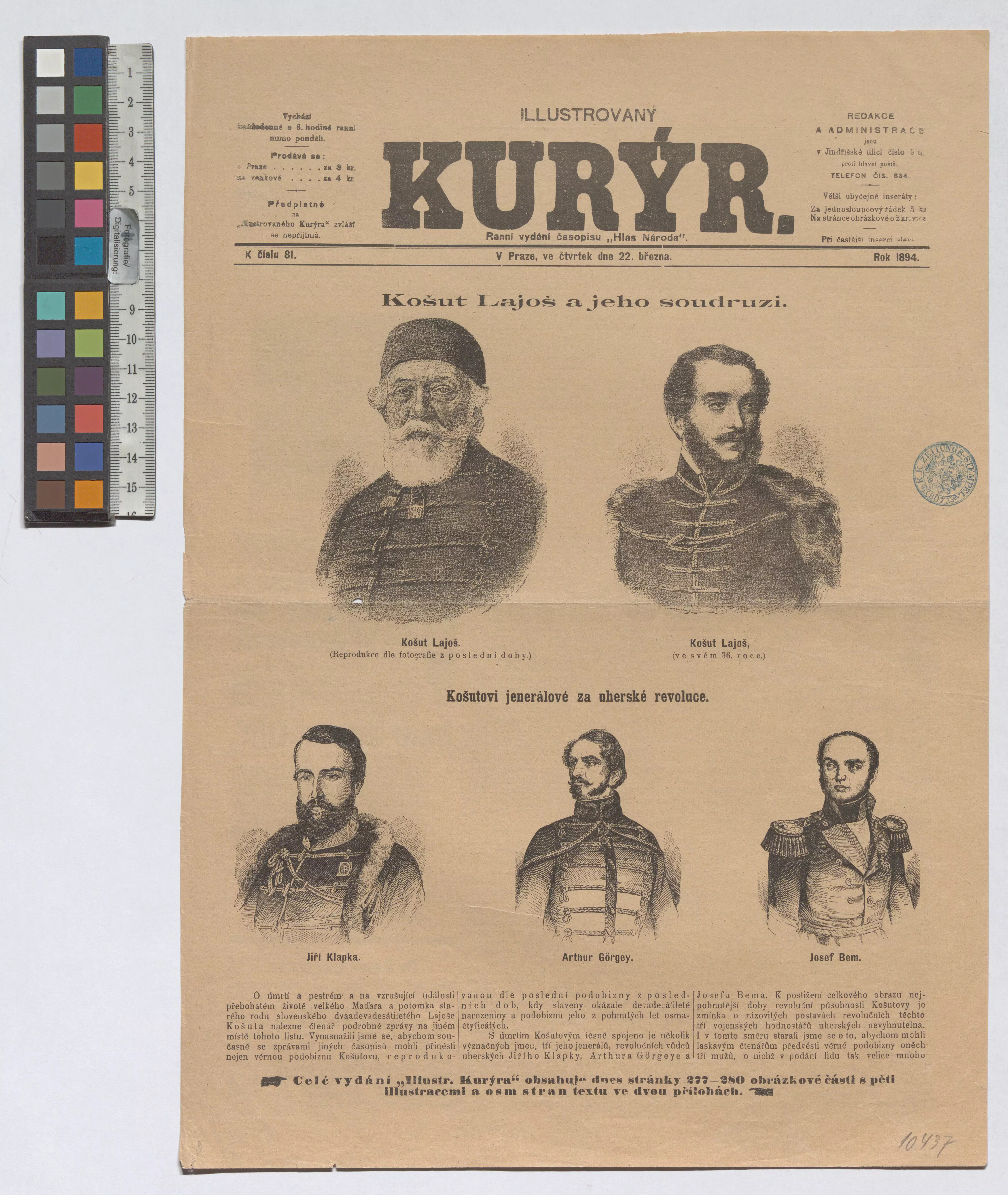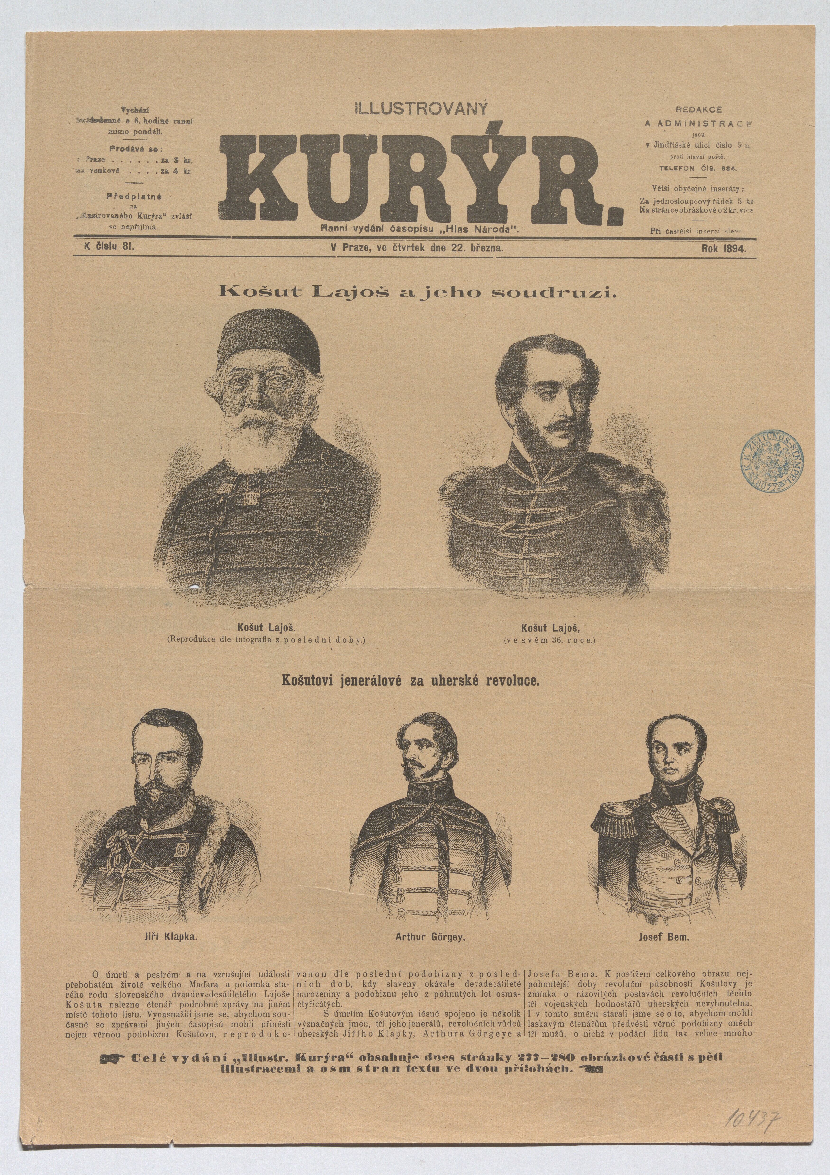 Titelseite der Prager Zeitung "Illustrovaný Kurýr" mit Proträts ungarischer Revolutionsführer: Lajos Kossuth als 36jähriger und 1894, Georg (Jiri) Klapka, Arthur Görgey, Josef (Józef) Bem