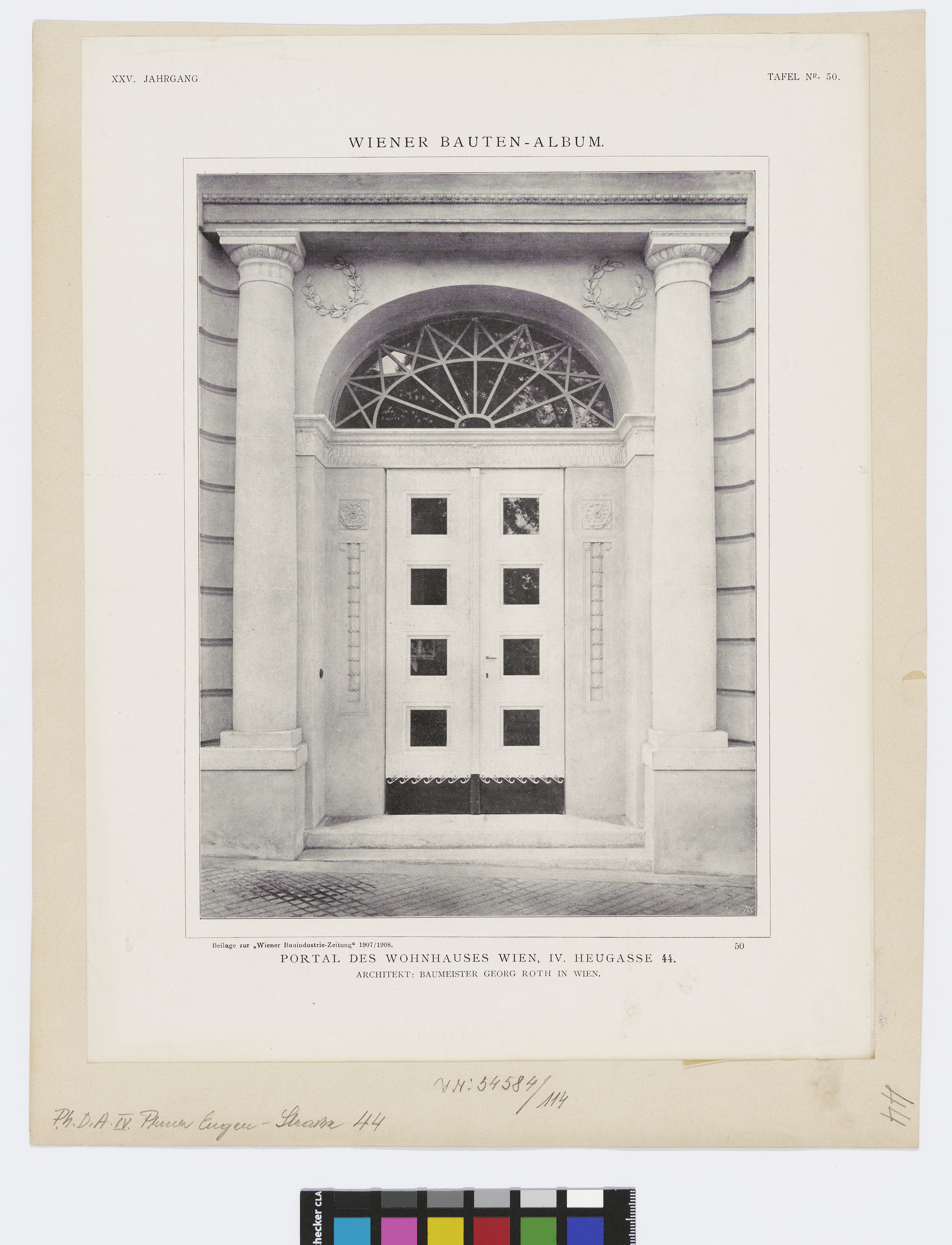 4., Heugasse 44 (heute Prinz-Eugen-Straße 44) - Portal (Wiener Bauten-Album, Blatt Nr. 50, Beilage zur "Wiener Bauindustrie-Zeitung" 1907/1908)