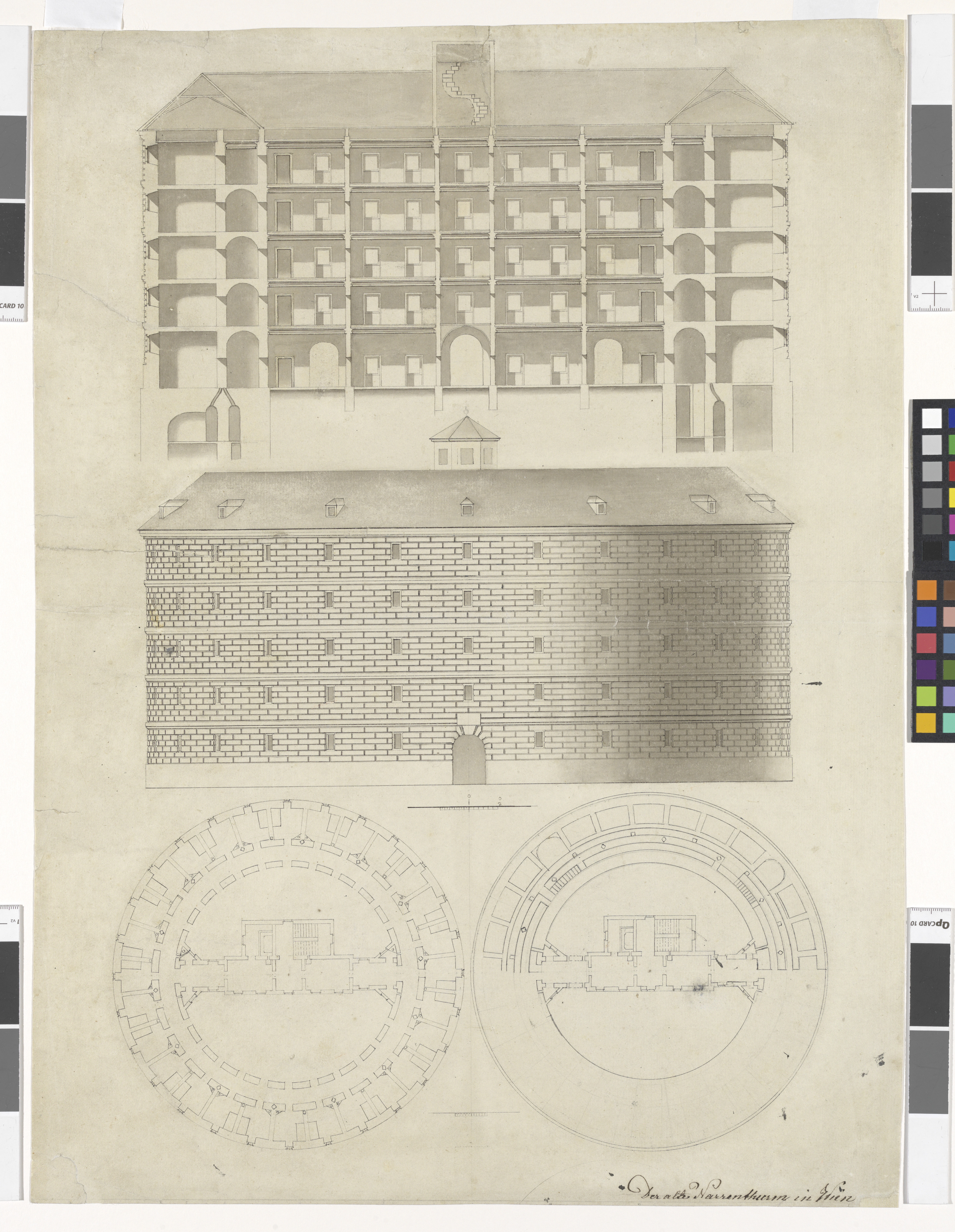 - 9., Spitalgasse - Allgem. Krankenhaus - "Narrenturm" - Grundrisse, Aufriss und Querschnitt