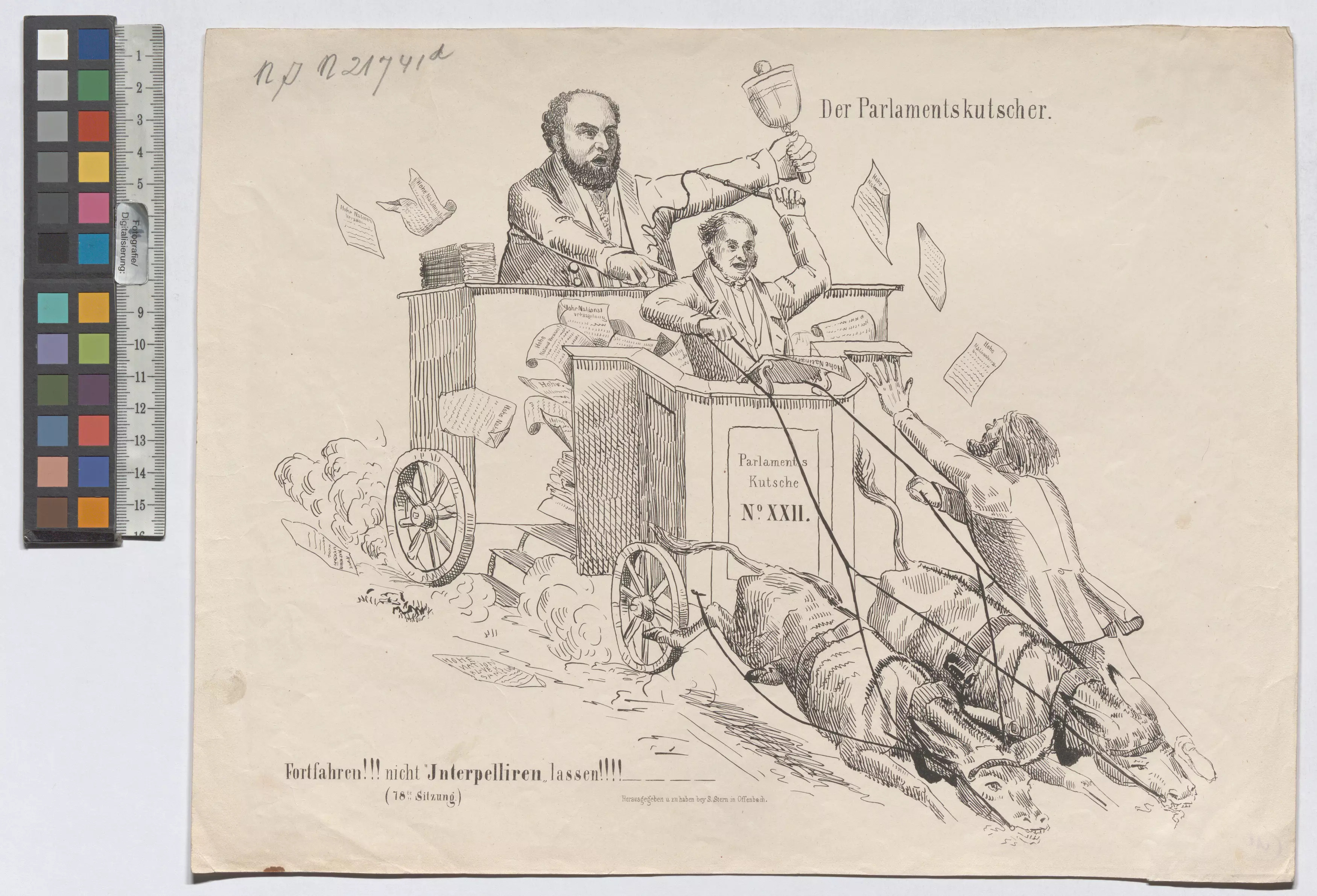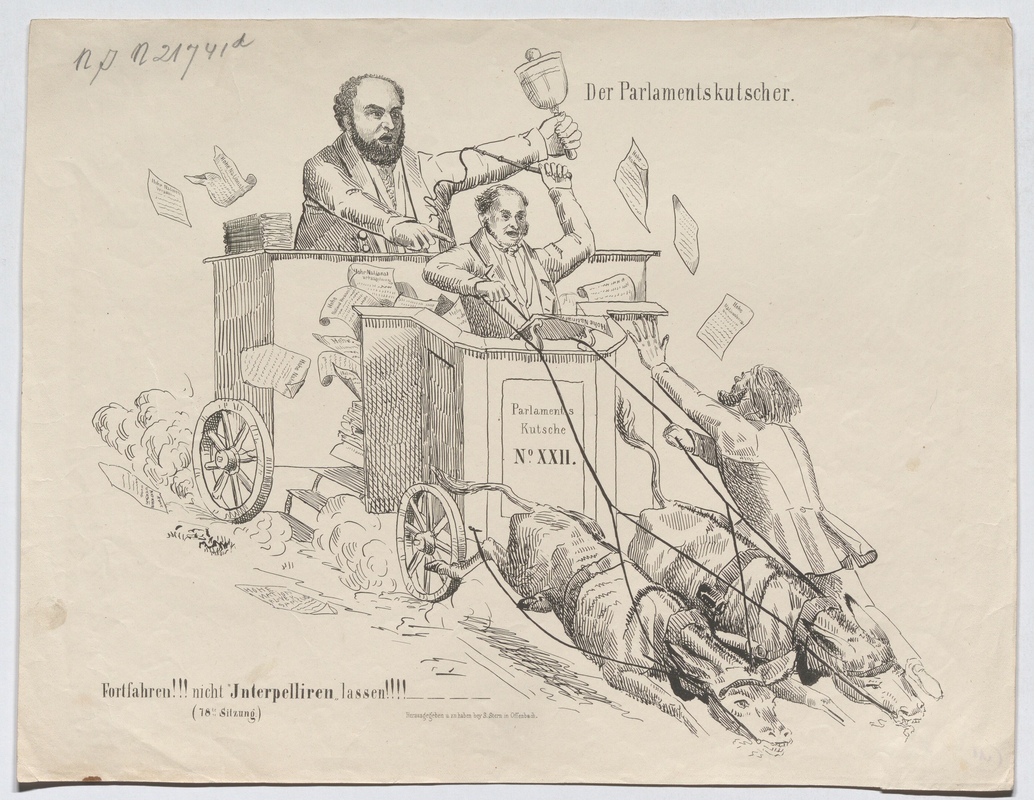 "Der Parlamentskutscher." (Karikatur auf Alexander von Soiron, Vizepräsident der Frankfurter Nationalversammlung 1848, darunter Robert Blum, Heinrich von Gagern u. a.)