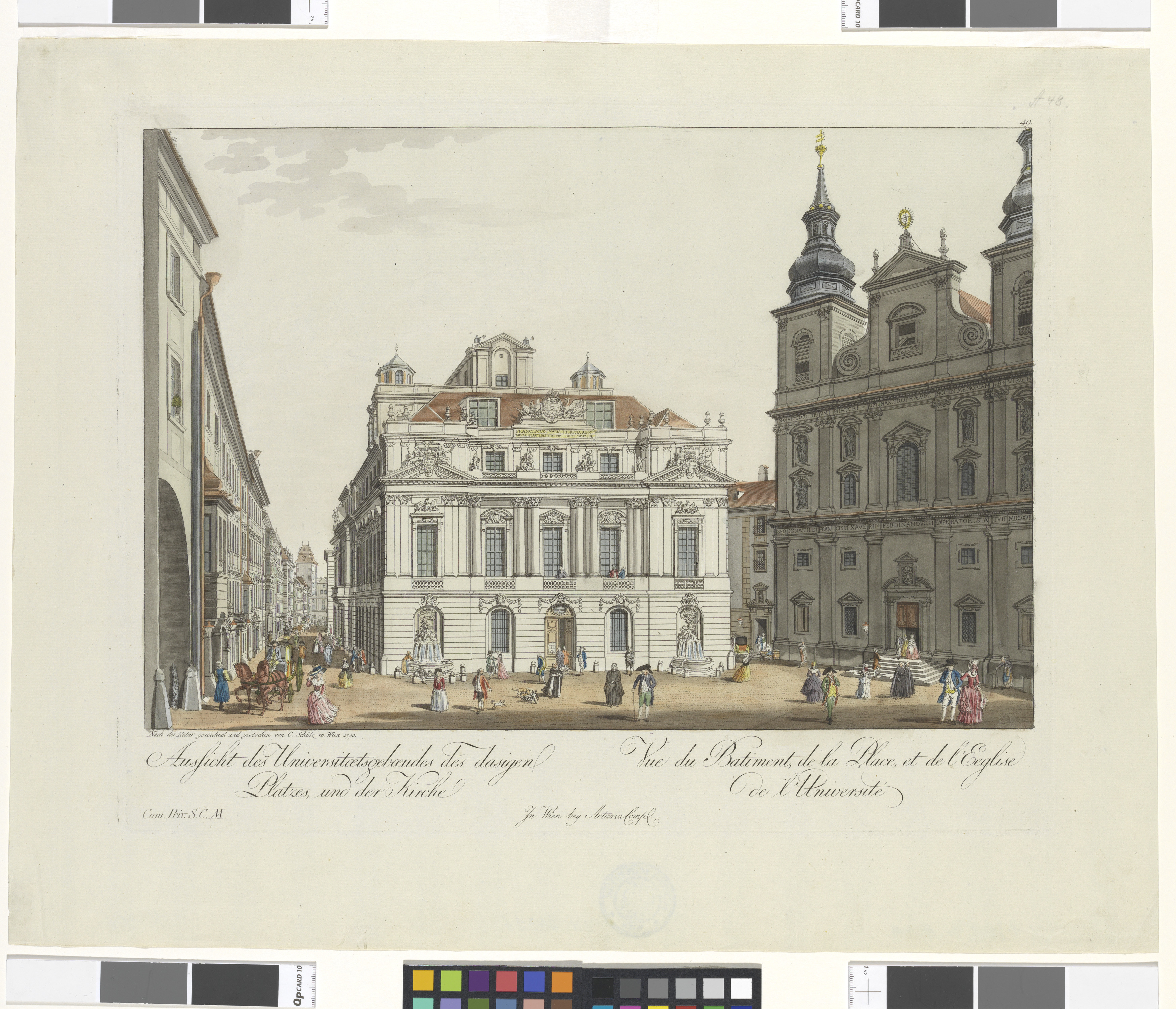 "Aussicht des Universitätsgebäudes des dasigen Platzes und der Kirche." / " Vue du Batiment, de la Place, et de L`Eglise de l`Université" (1. Etat)