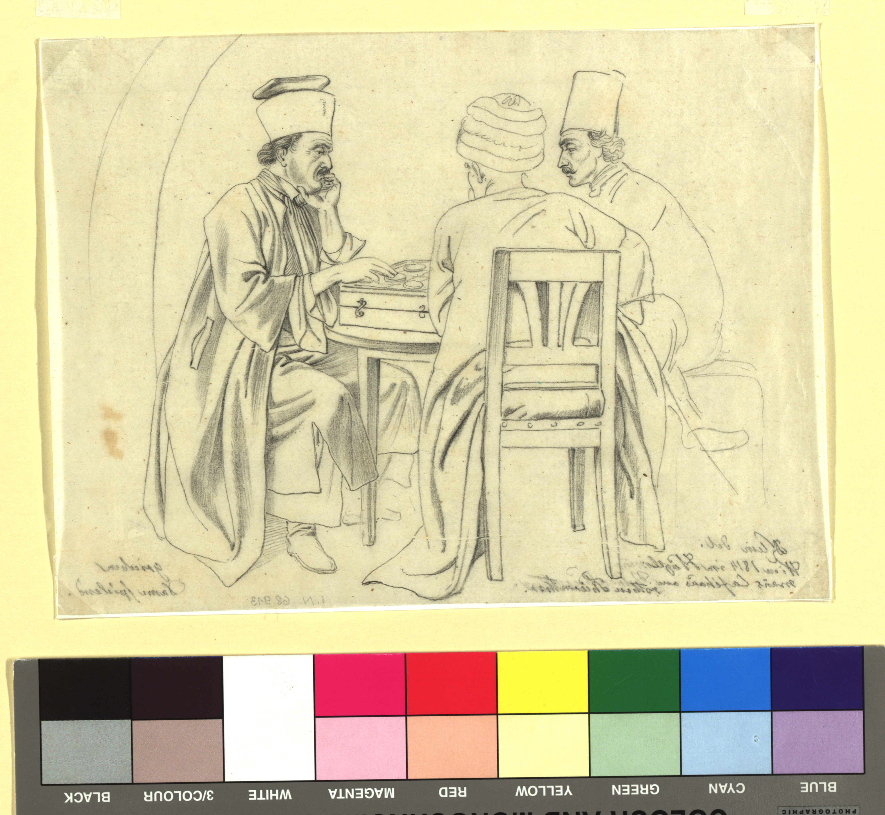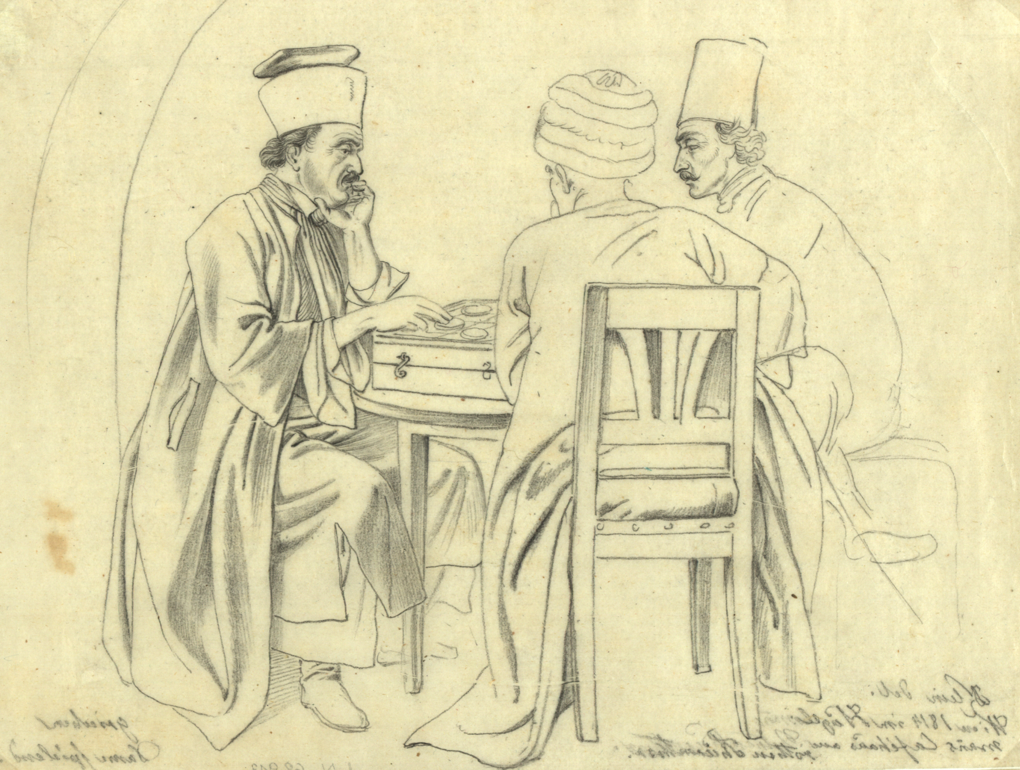 „In Hugelmanns Cafehaus am rothen Thurm-Thor / Griechen, Dame spielend“
