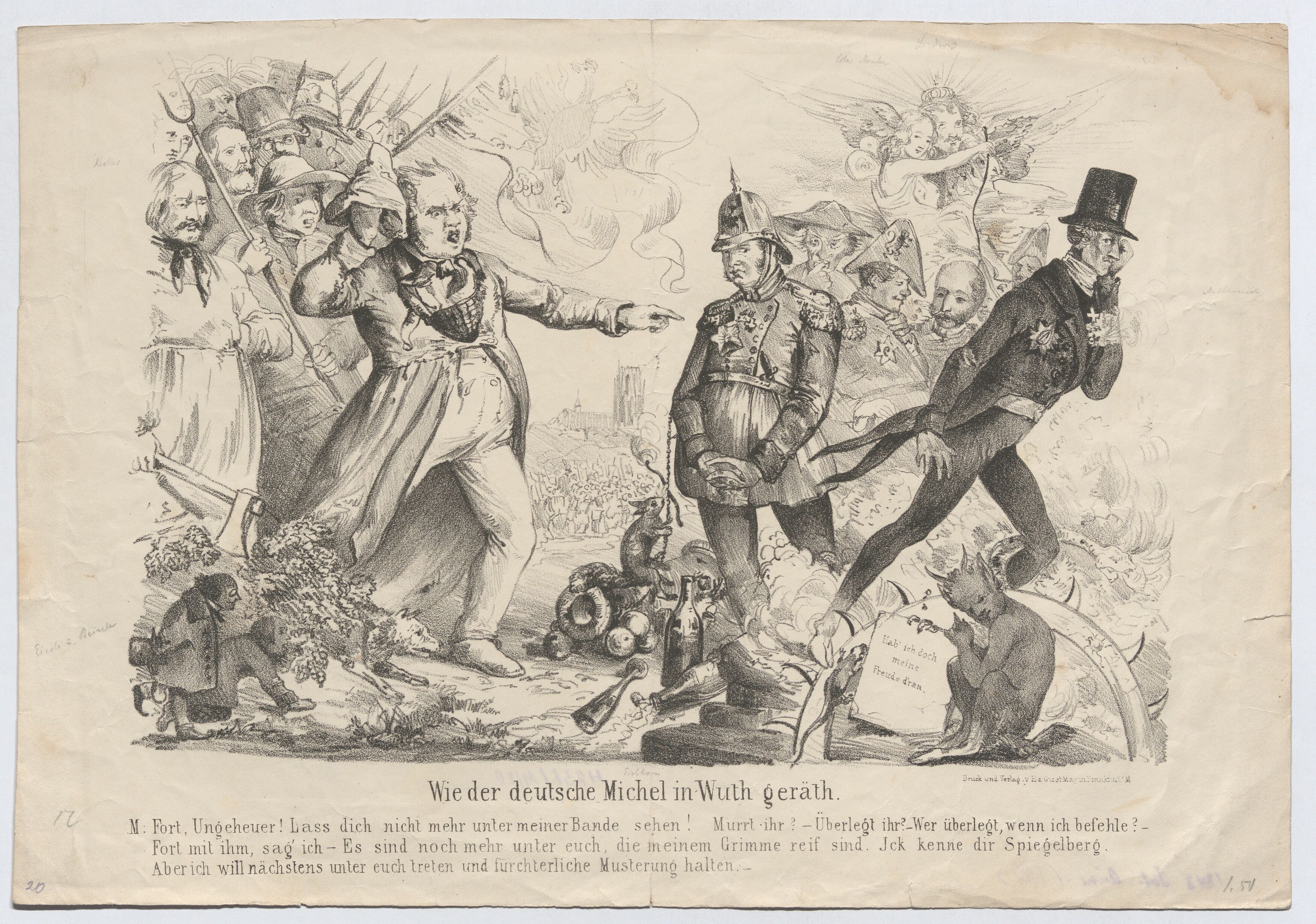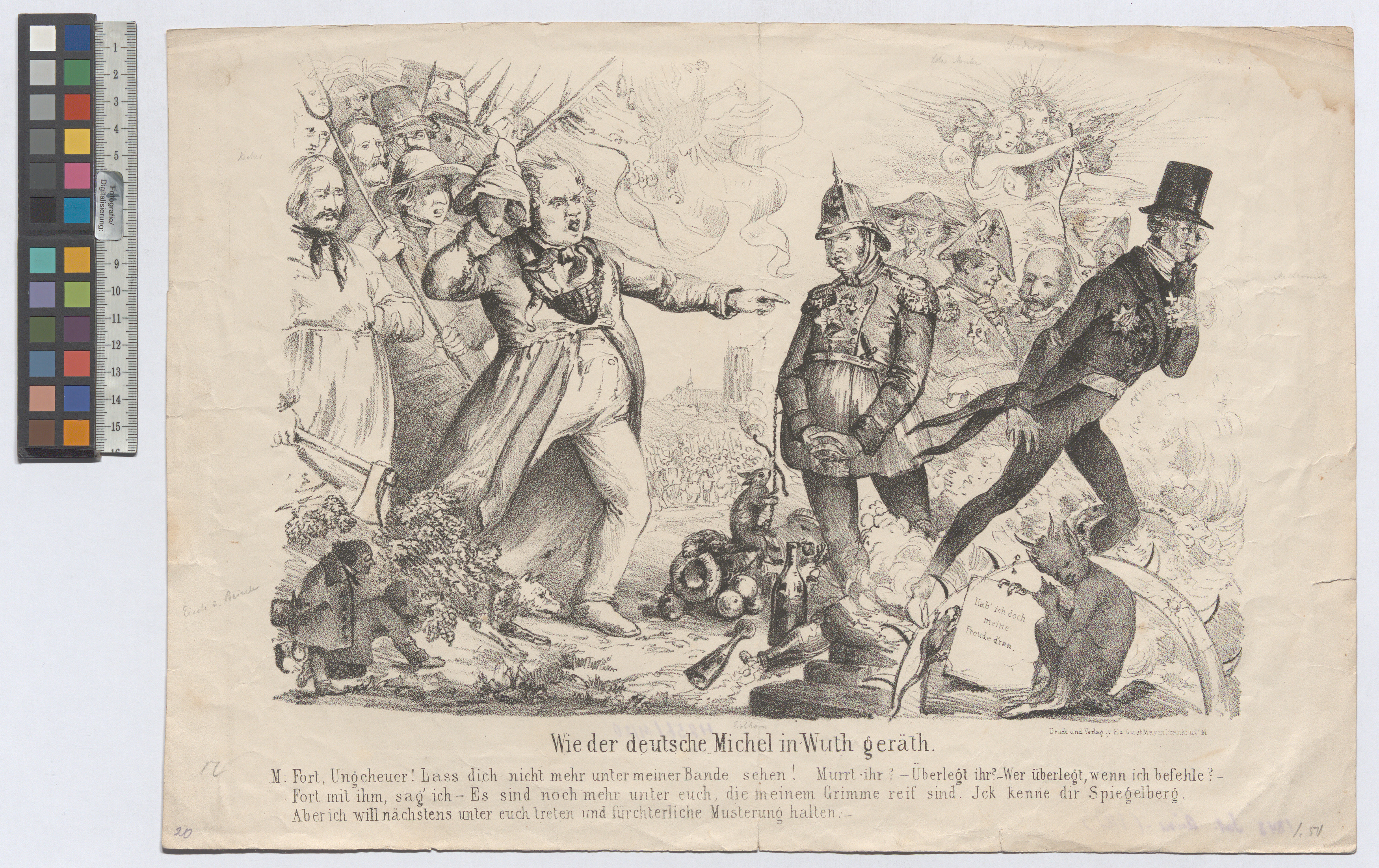 "Wie der deutsche Michel in Wuth geräth." (Karikatur auf die Revolution 1848, unter den Dargestellten Metternich, Friedrich Hecker, Ludwig I. von Bayern und Lola Montez)