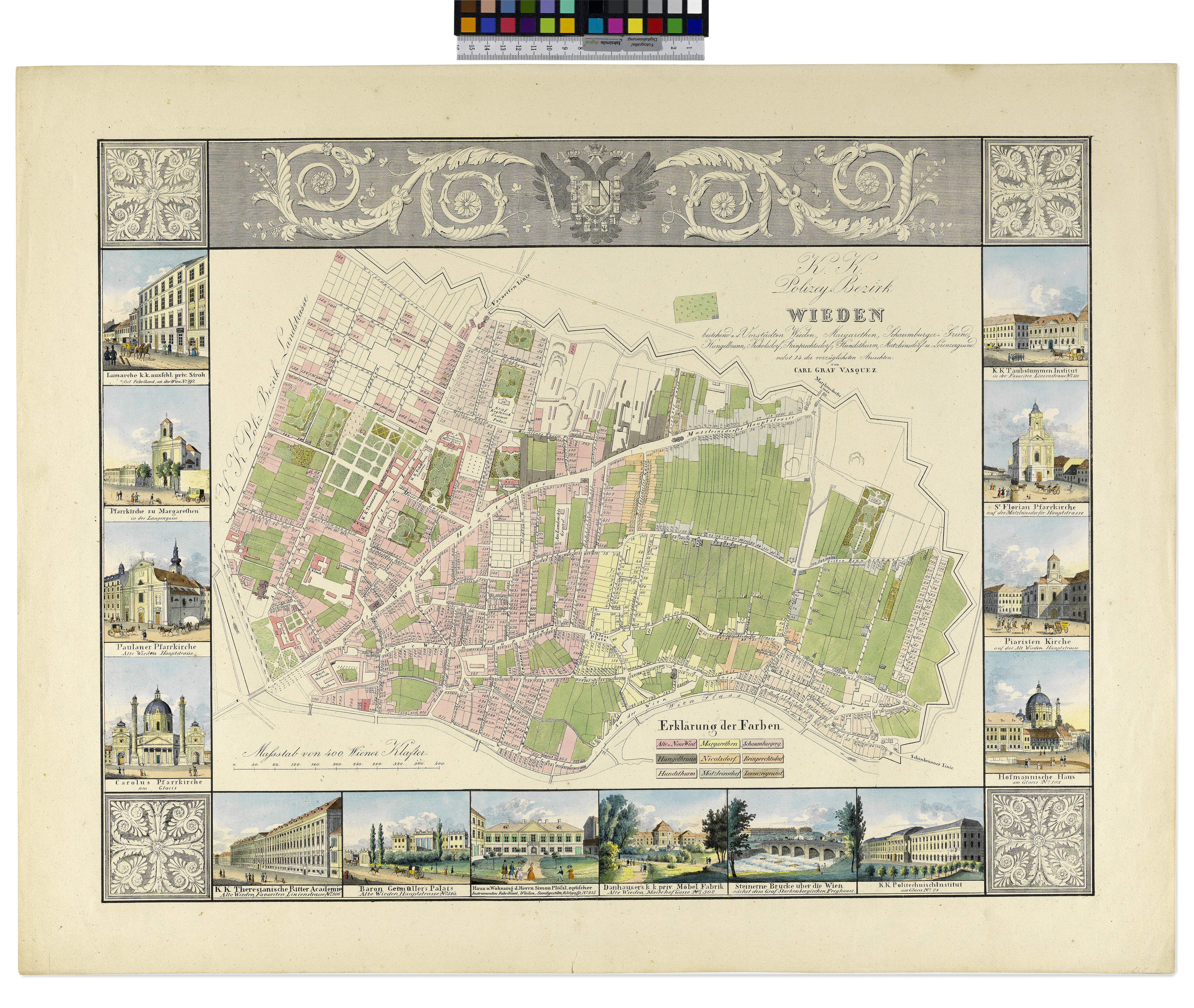 "K.K. Polizey Bezirk Wieden bestehend a. d. Vorstädten Wieden, Margarethen, Schaumburger-Grund, Hungelbrunn, Nickolsdorf, Reinprechtsdorf, Hundsthurm, Matzleinsdorf und Lorenzergrund nebst 14 der vorzüglichsten Ansichten von Carl Graf Vasquez"
