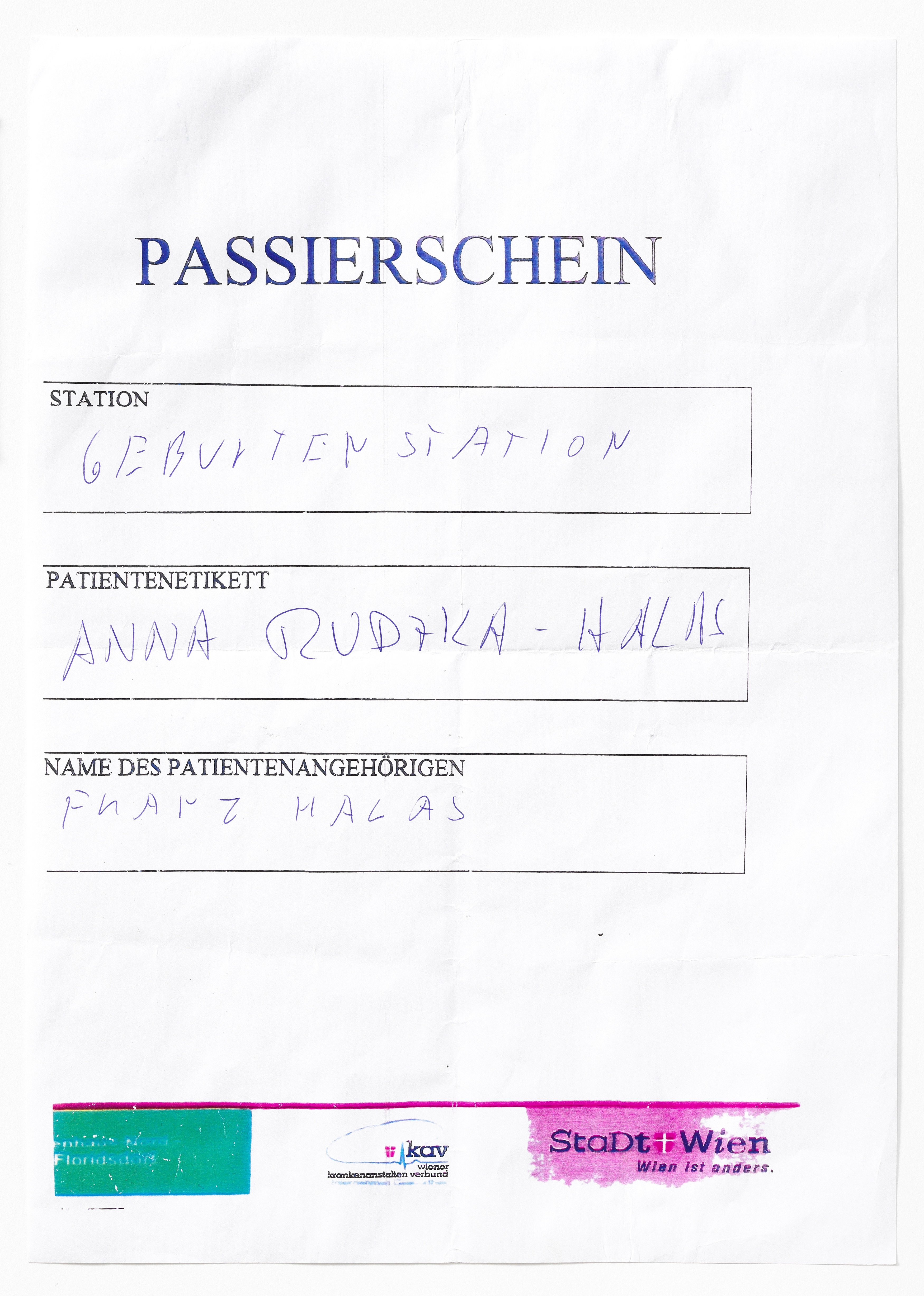 In Reaktion auf die steigenden Corona-Infektionszahlen verhängte die Bundesregierung ab Mitte März 2020 weitgehende Besuchsverbote in den österreichischen Krankenhäusern. Dieser provisorische Passierschein ermöglichte es Franz Halas, seine Frau Anna Rudzka-Halas am 31. März 2020 trotz Corona-bedingter Zutrittsbeschränkungen zur Entbindung ihrer gemeinsamen Tochter ins Krankenhaus Wien Nord zu begleiten. “Am Tag der Geburt konnte ich mit dem Rettungswagen zum Krankenhaus fahren, musste aber gesondert zum Haupteingang gehen und wusste während der ganzen Fahrt nicht, ob ich überhaupt eingelassen werden würde”, schrieb Franz Halas in einem Brief an das Wien Museum am 31. August 2020. “Als ich den Passierschein vom Sicherheitsdienst und damit den Zugang zum Krankenhaus erhalten hatte, war ich sehr froh, dass wir das Wunder der Geburt gemeinsam erleben durften.”