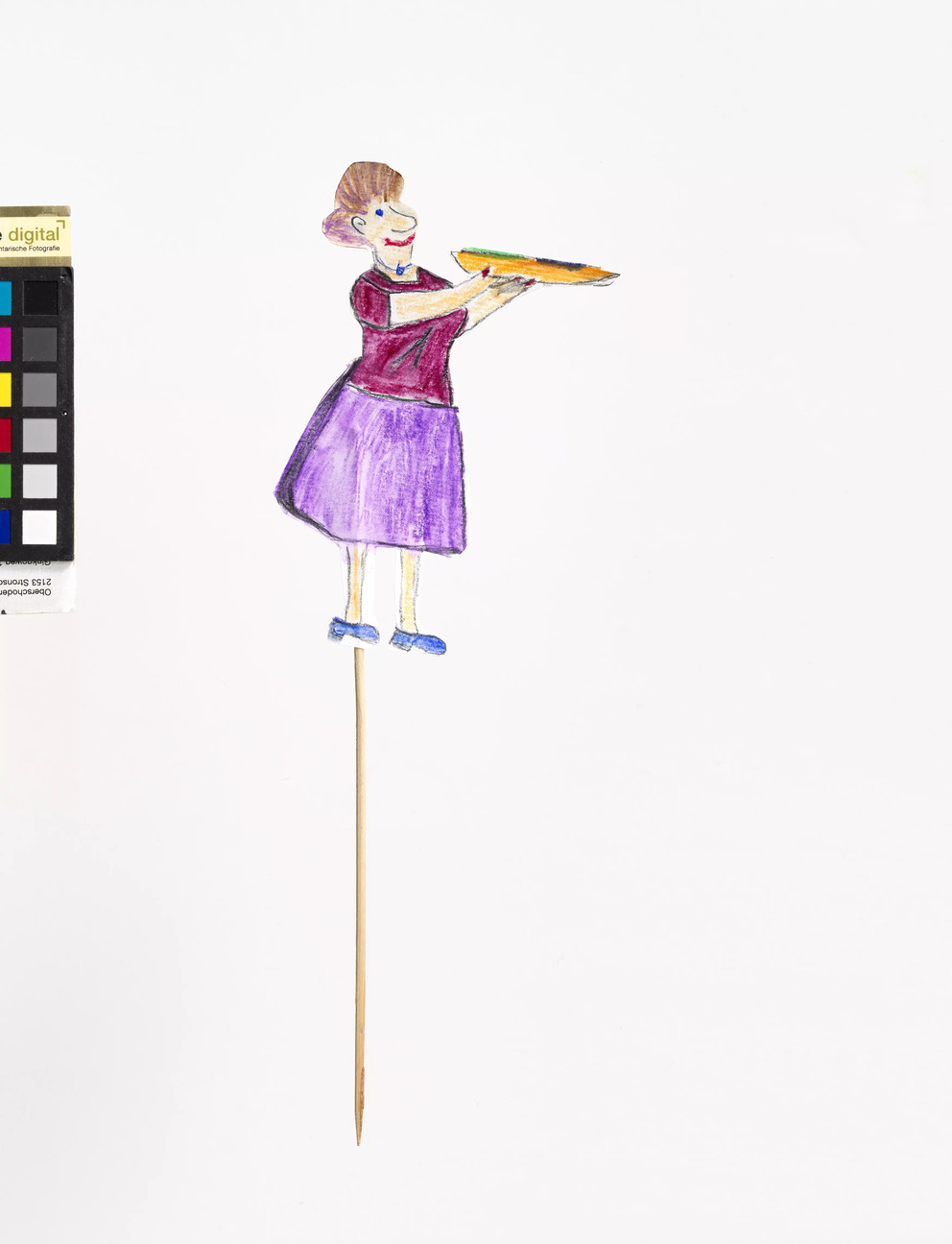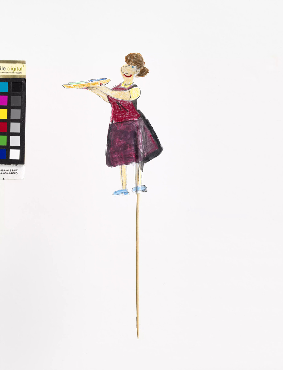 Diese Figur ist Teil einer Gruppe von elf Stabfiguren, die Barbara Halapier nach Vorlagen aus dem Kinderbuch „Die Mäuse der drei Stanisläuse“ von Vera Ferra-Mikura bastelte. Die Figuren wurden bei regelmäßigen Skype-Theater-Vorführungen für die Enkelkinder während des ersten Corona-Lockdowns im Frühjahr 2020 eingesetzt, nachdem Frau Halapier ihre Enkelkinder während der Ausgangsbeschränkungen nicht persönlich treffen konnte. Die Online-Aufführungen erlaubten es der Großmutter, mit ihren Enkelkindern spielerisch Kontakt zu halten und deren Eltern bei der Kinderbetreuung zumindest halbstundenweise zu entlasten.