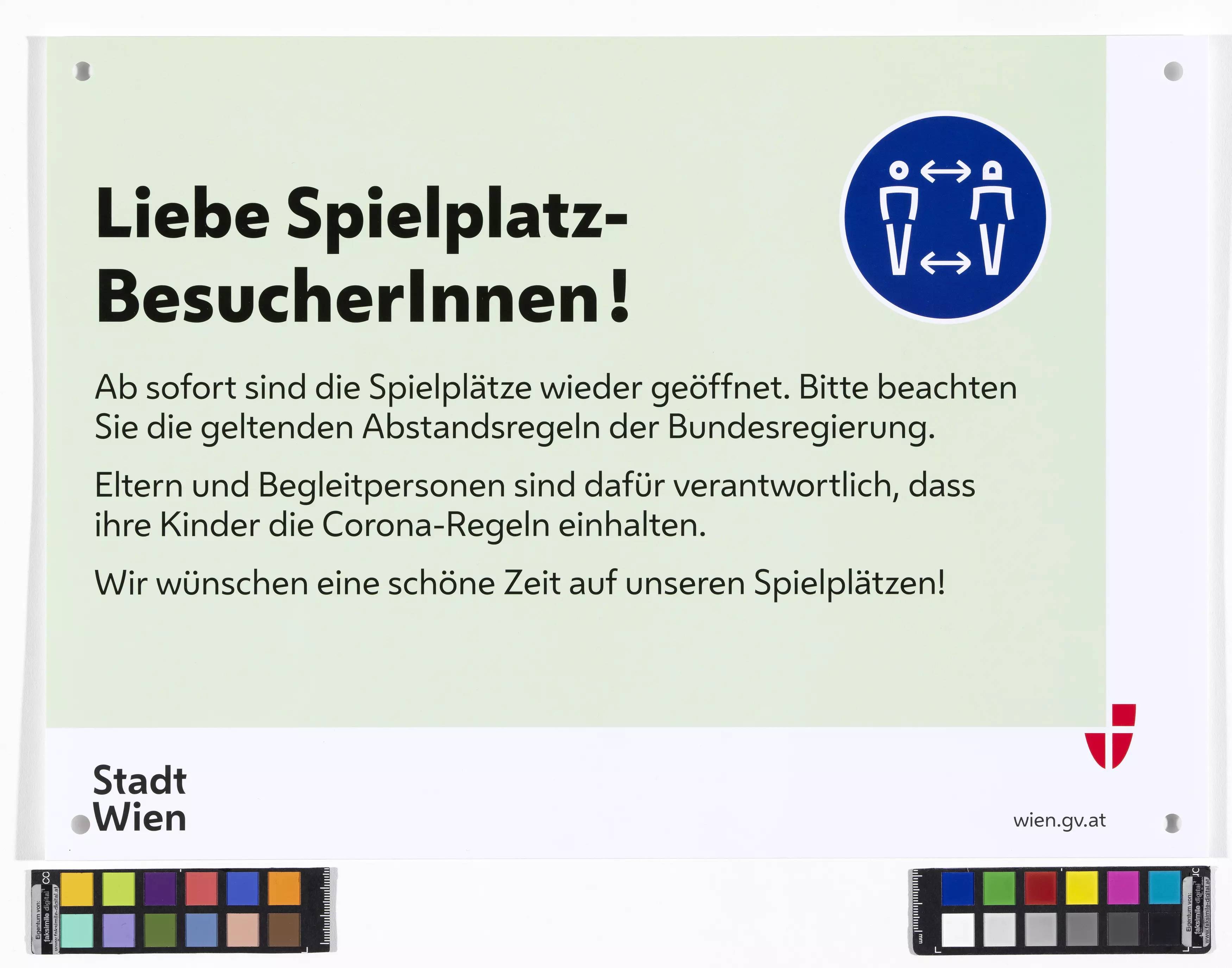Schild der Stadt Wien: Wiedereröffnung der Spielplätze nach der Corona-bedingten Schließung im Frühjahr 2020