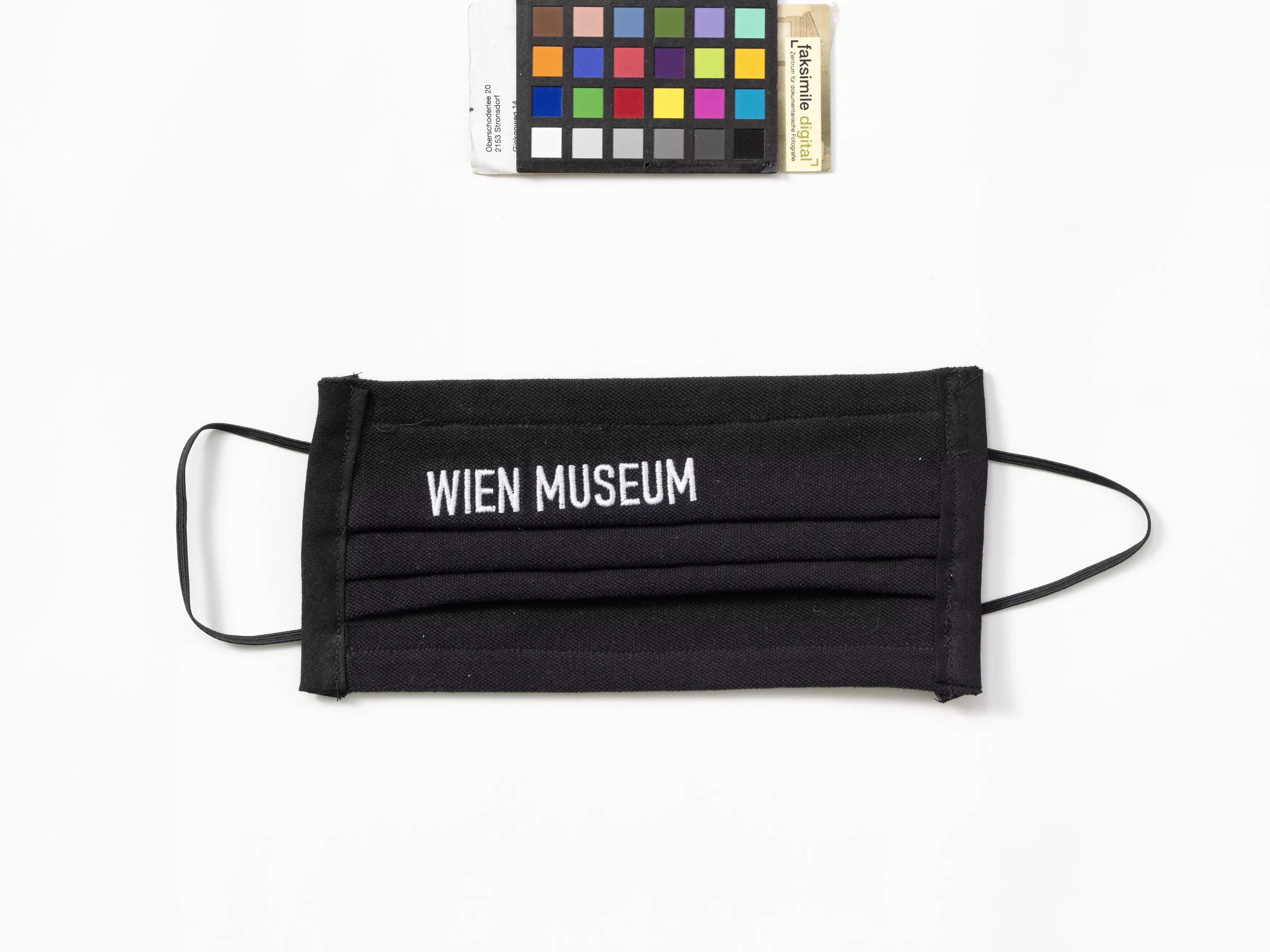 Handgefertigte Mund-Nasen-Schutzmaske mit Schriftzug "Wien Museum", produziert aus alten Dienst-Poloshirts des Wien Museums während des ersten Corona-Lockdowns 2020