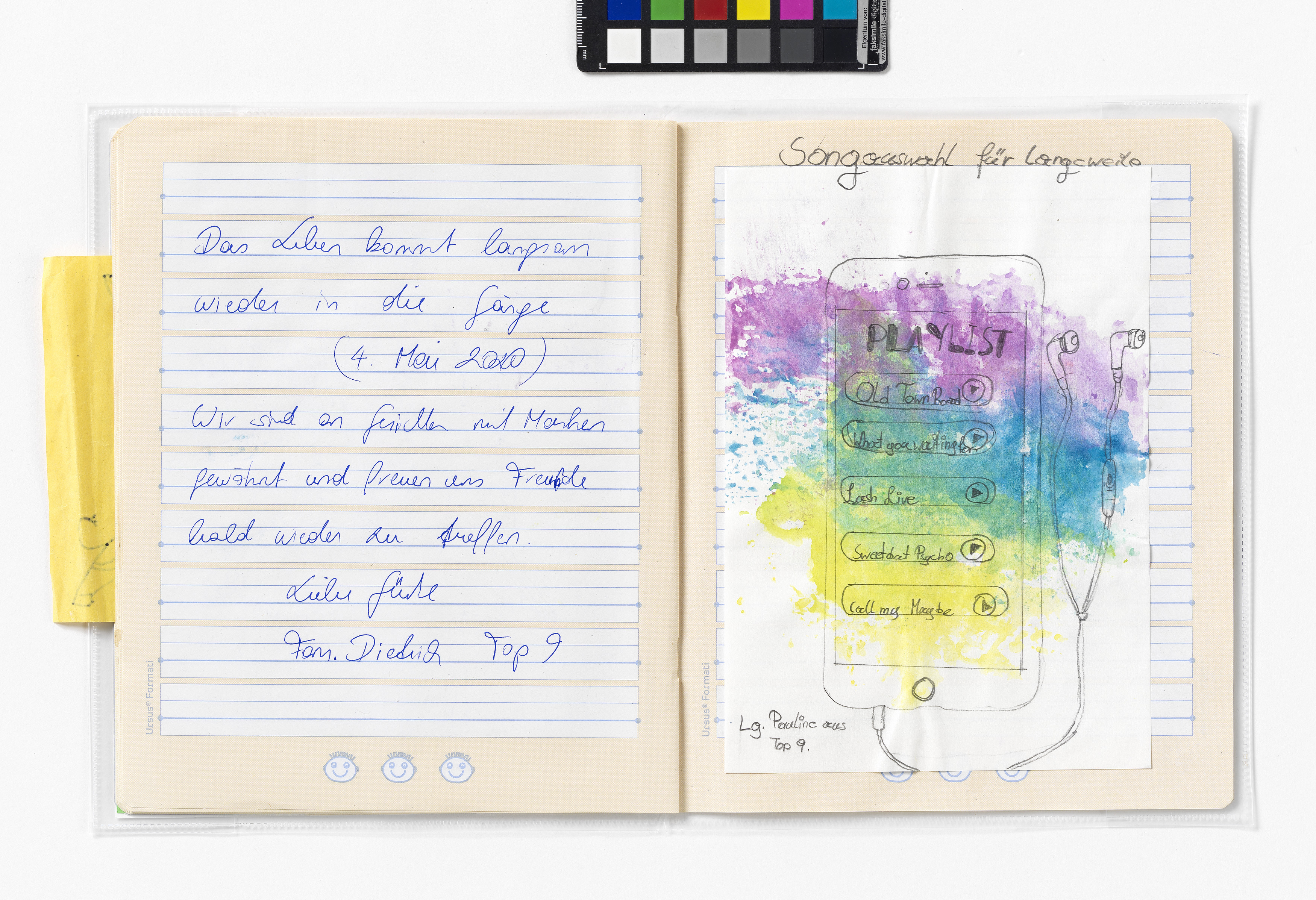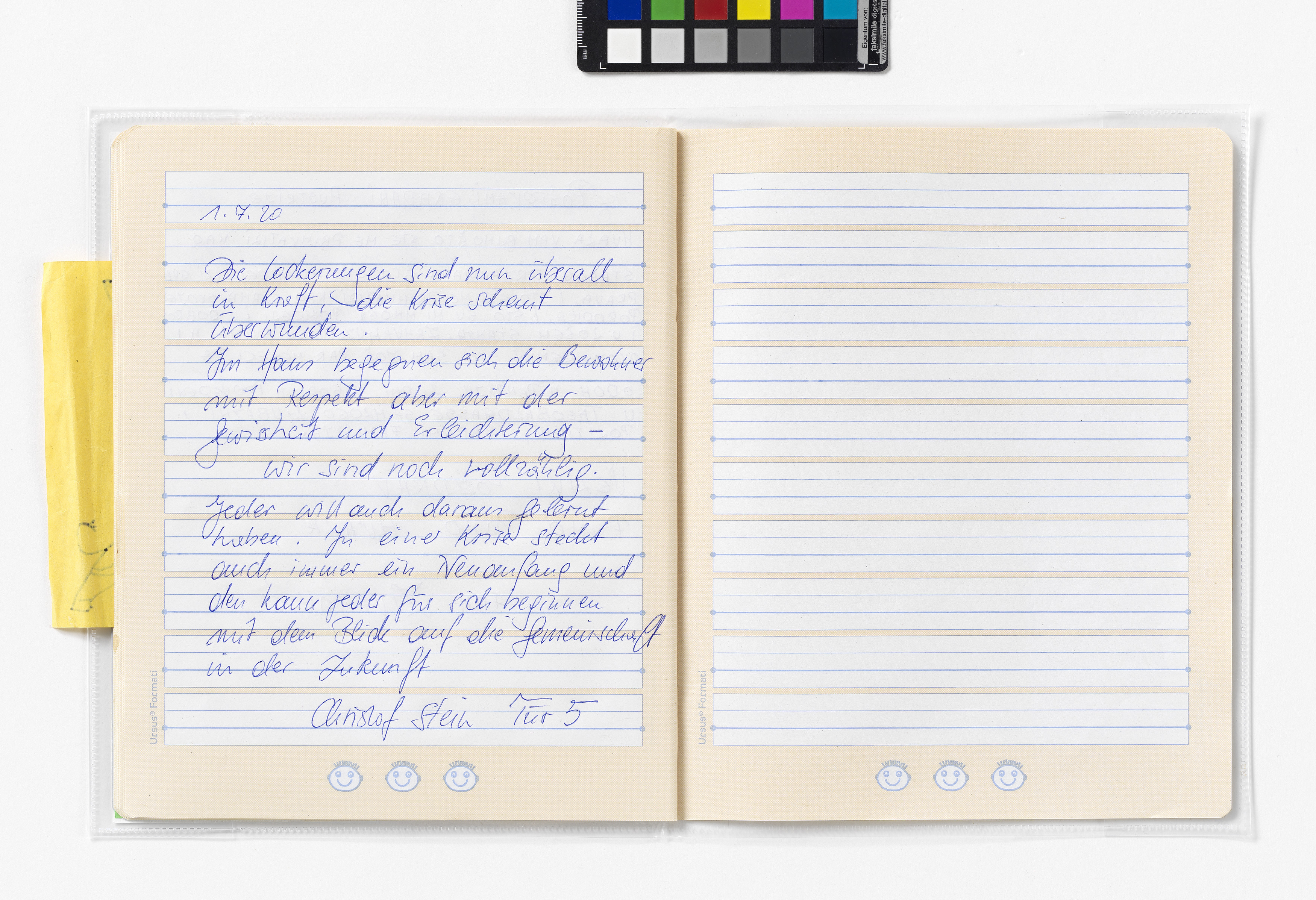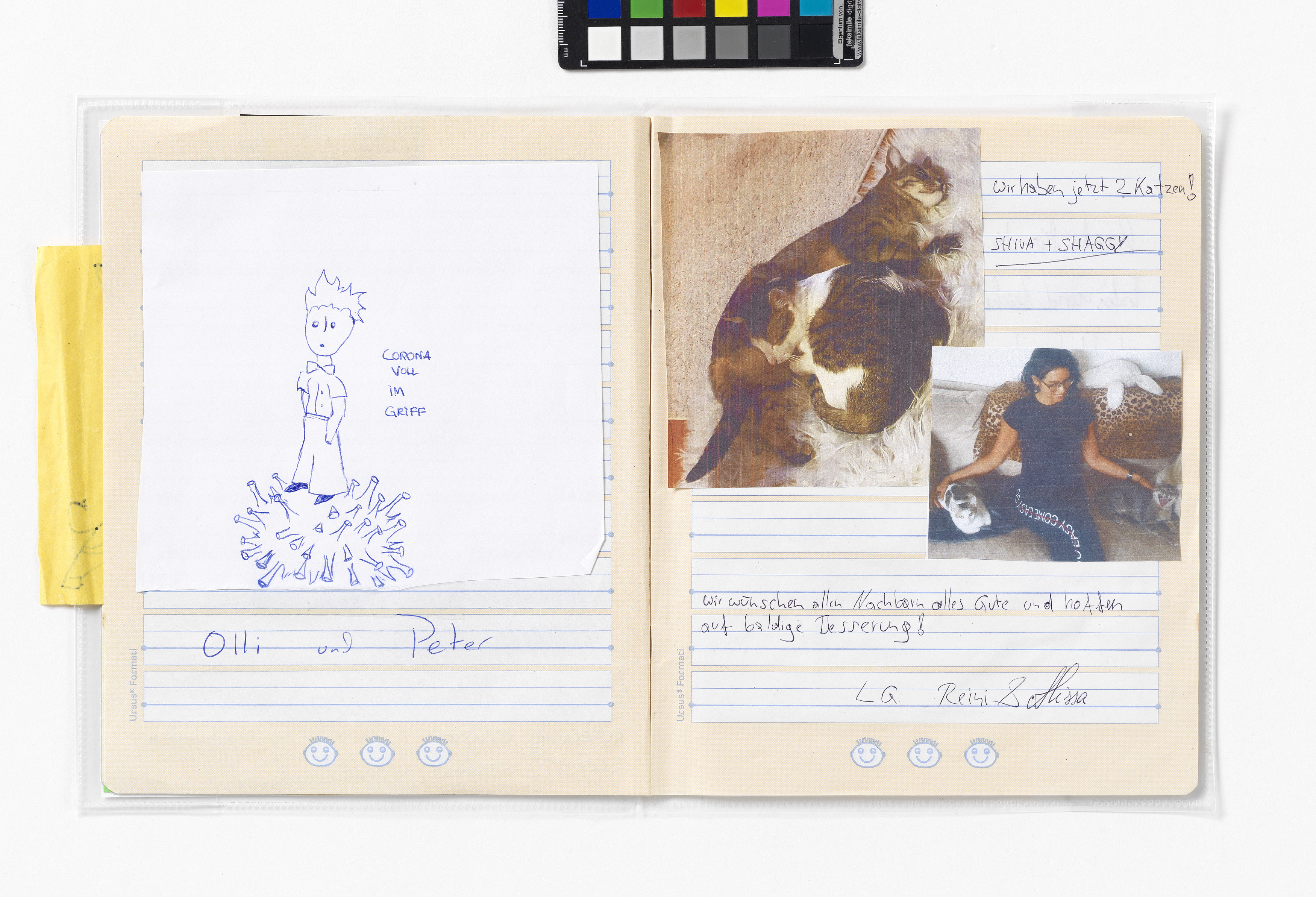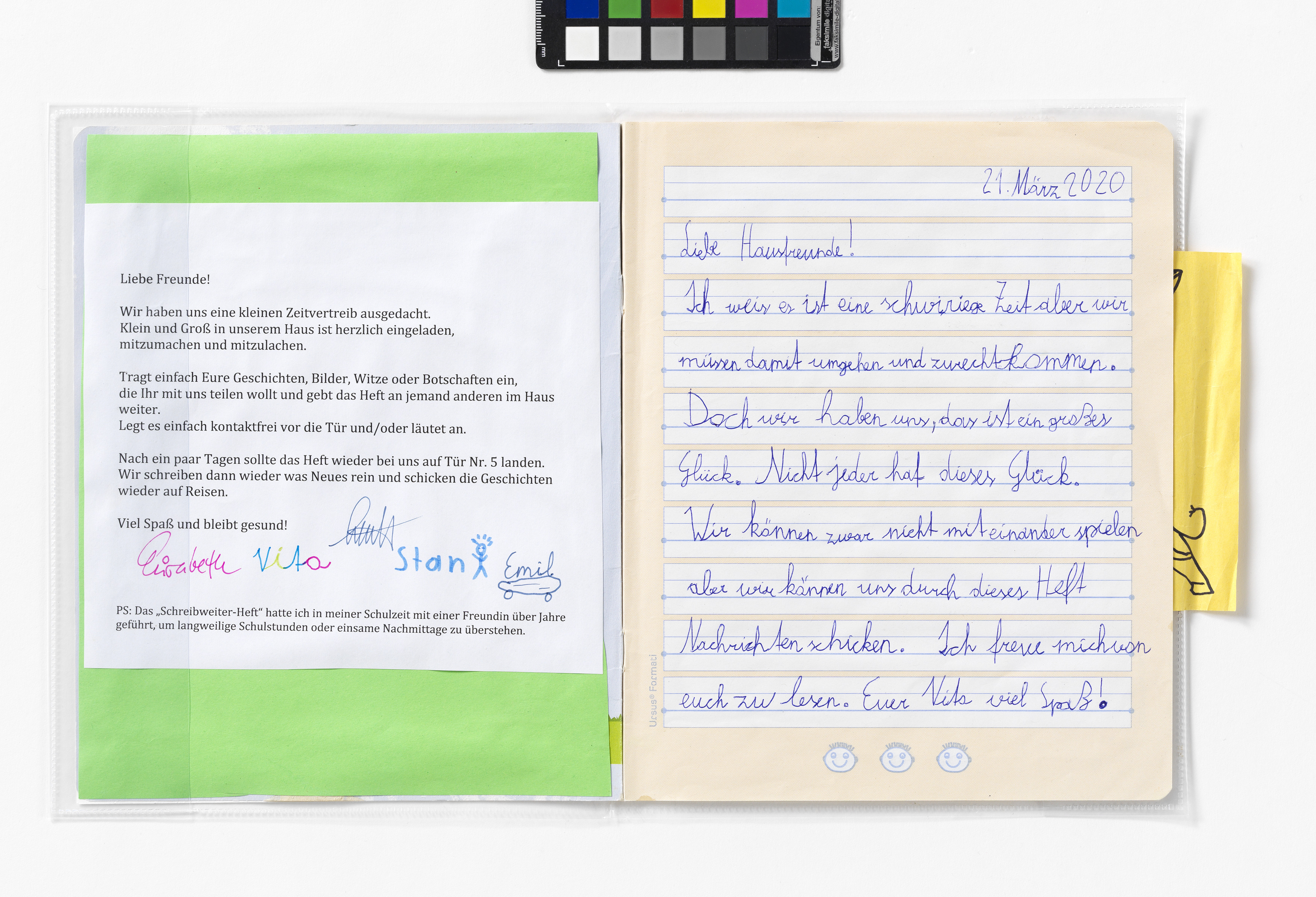 Dieses Heft, das als Form der kontaktlosen Nachbarschaftskommunikation in der Zeit des ersten Corona-Lockdowns und danach diente, enthält Botschaften, Textbeiträge, Zeichnungen und Fotografien von Hausbewohner*innen aller Altersgruppen. Das Cover und der erste Eintrag vom 21. März 2020 stammen von Vito Gottfried-Lulić, dem Sohn der Lebenspartnerin des Initiators und Schenkers des Hefts, Christof Stein; der letzte Eintrag vom 1. Juli 2020 stammt von Christof Stein selbst.