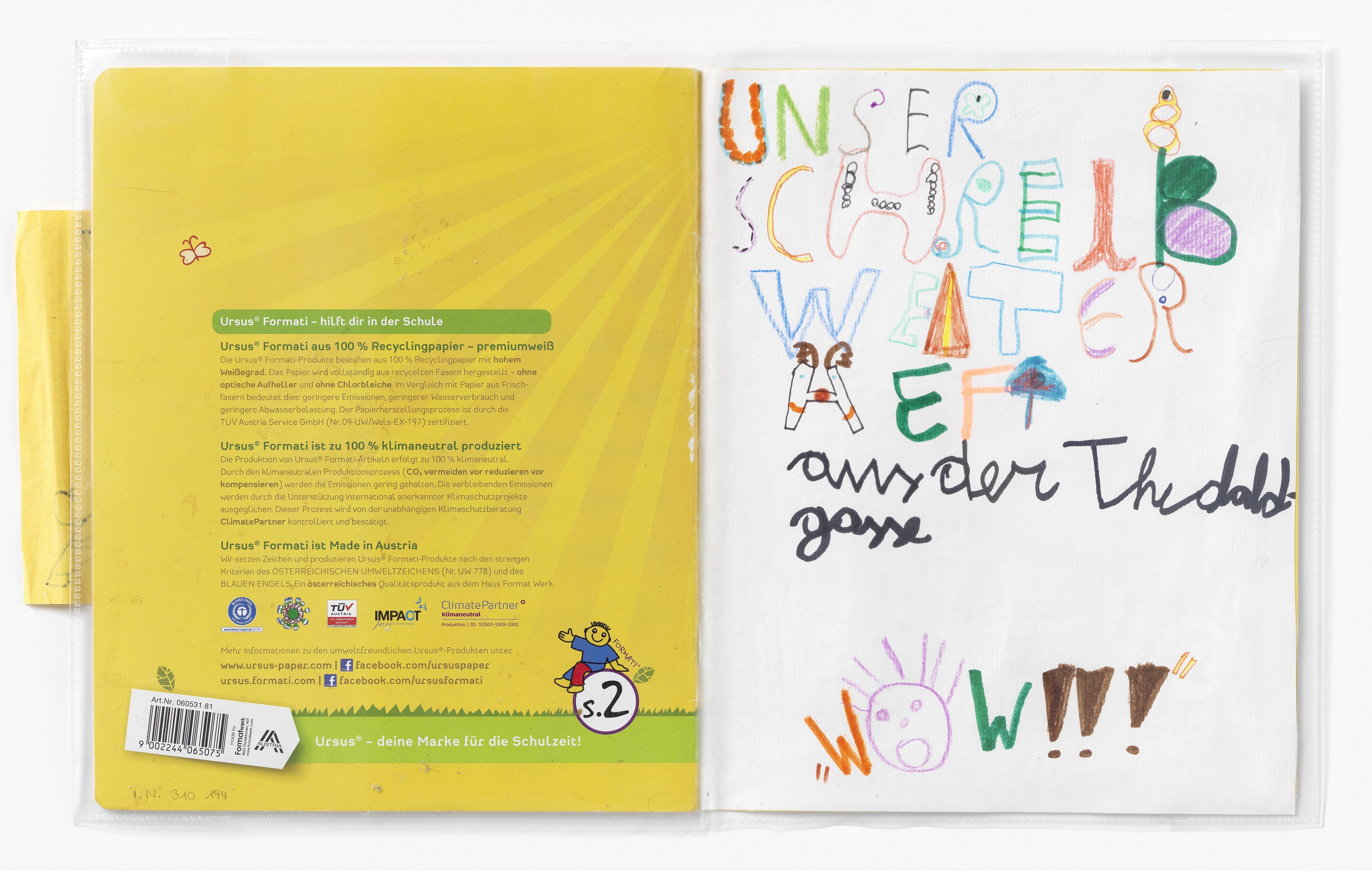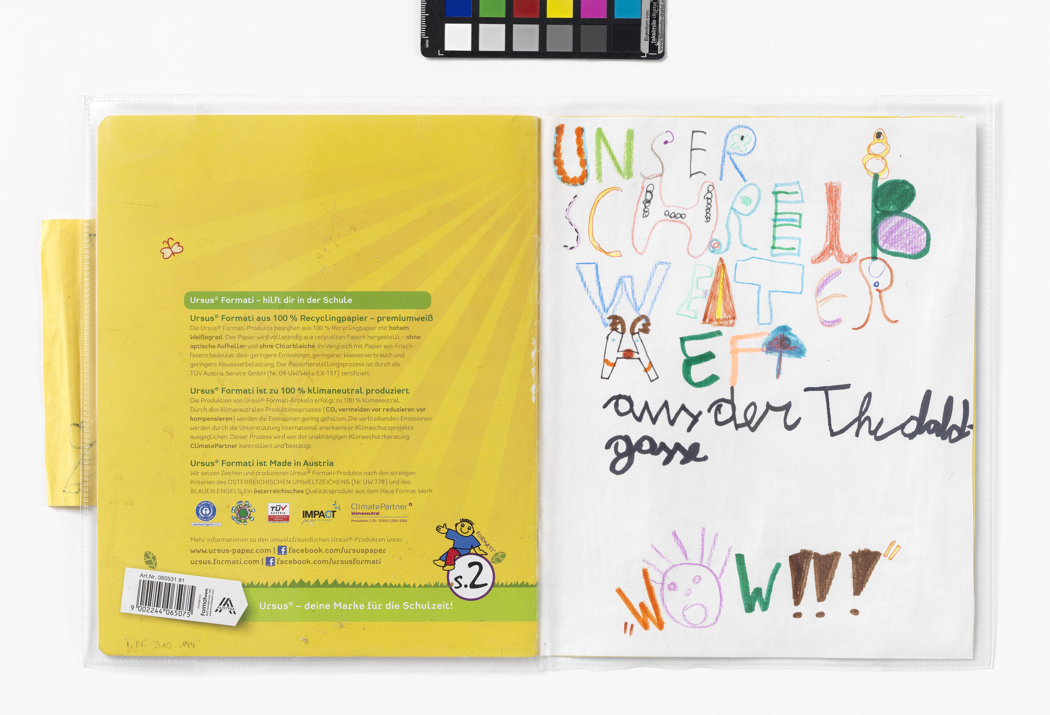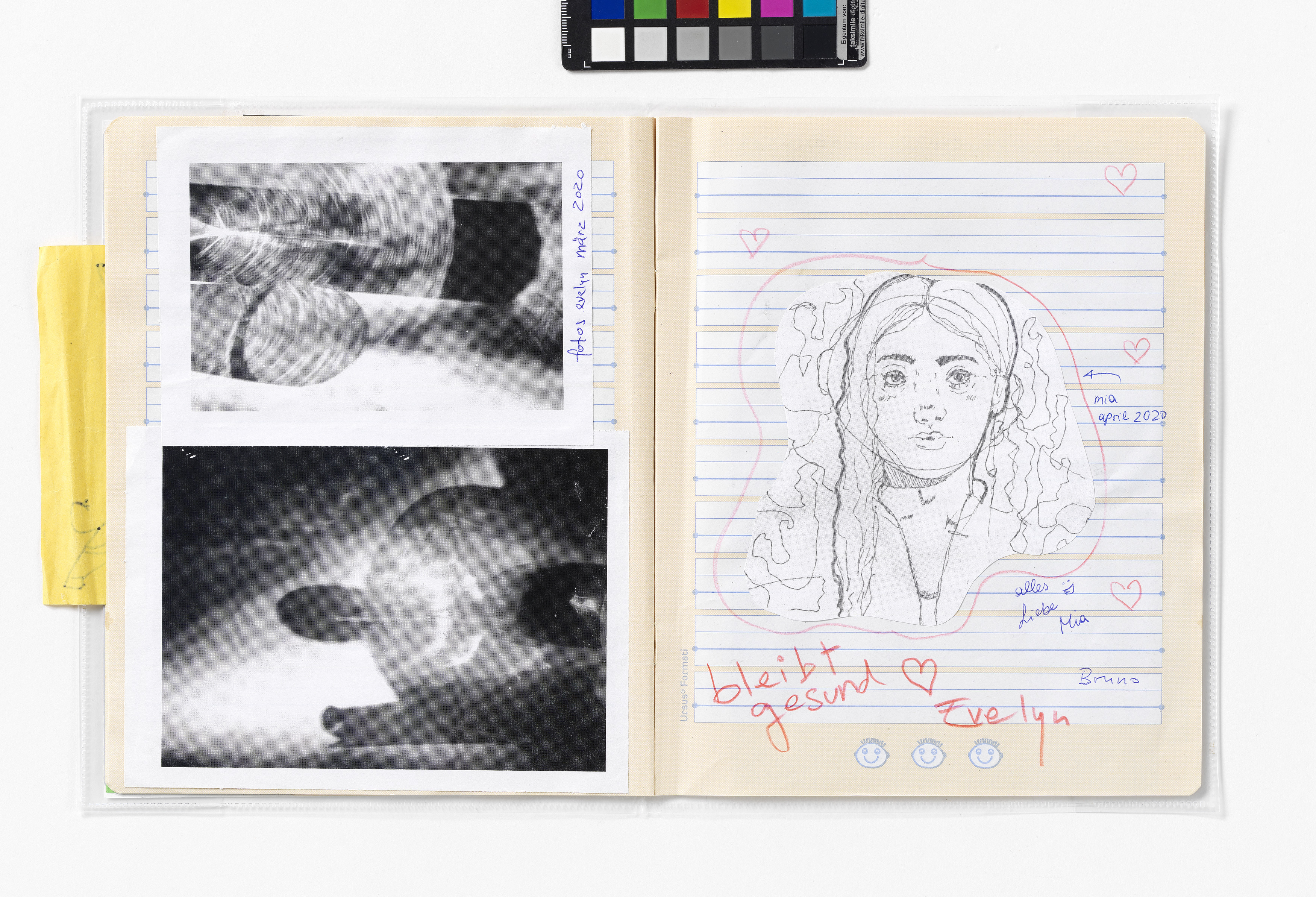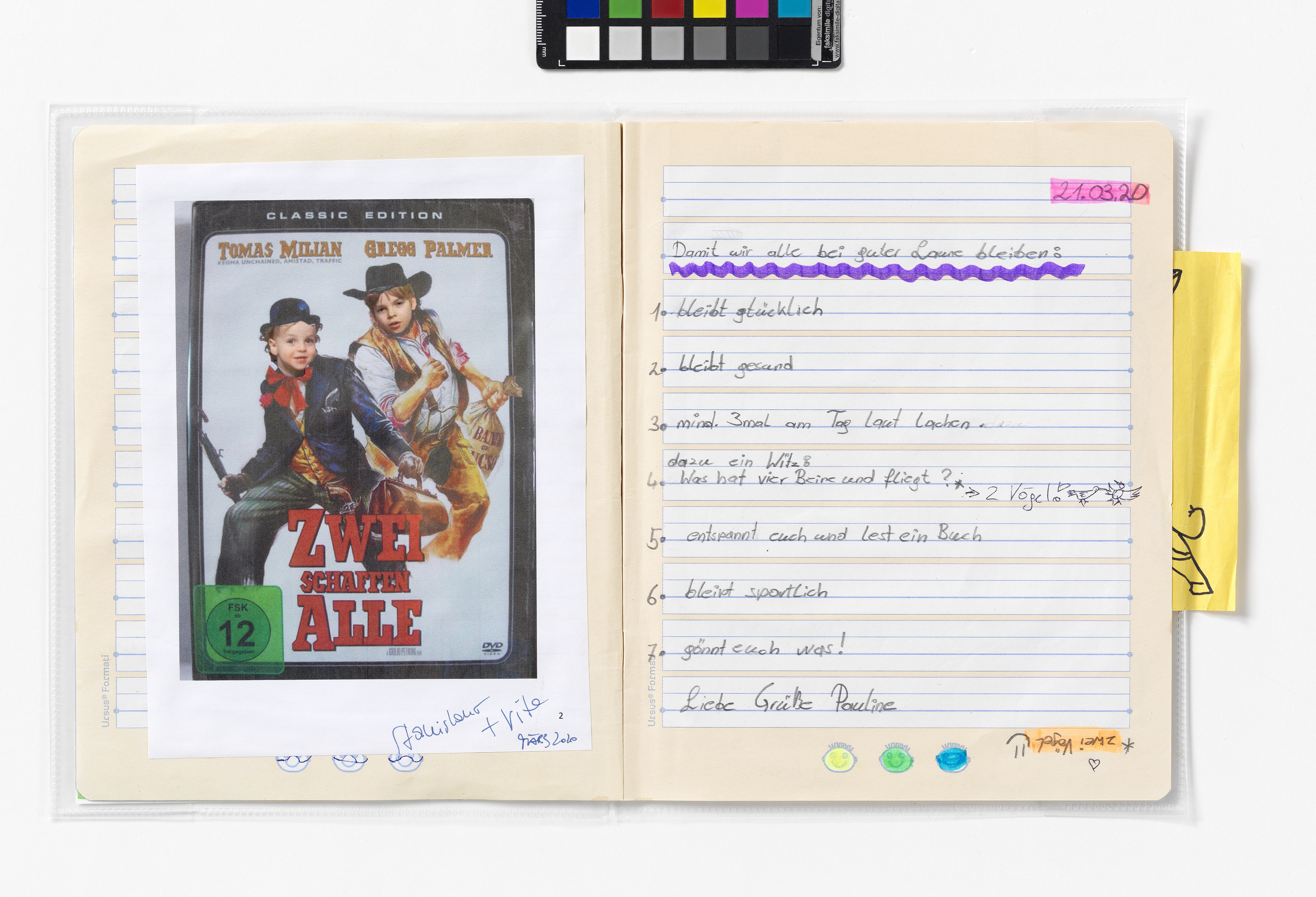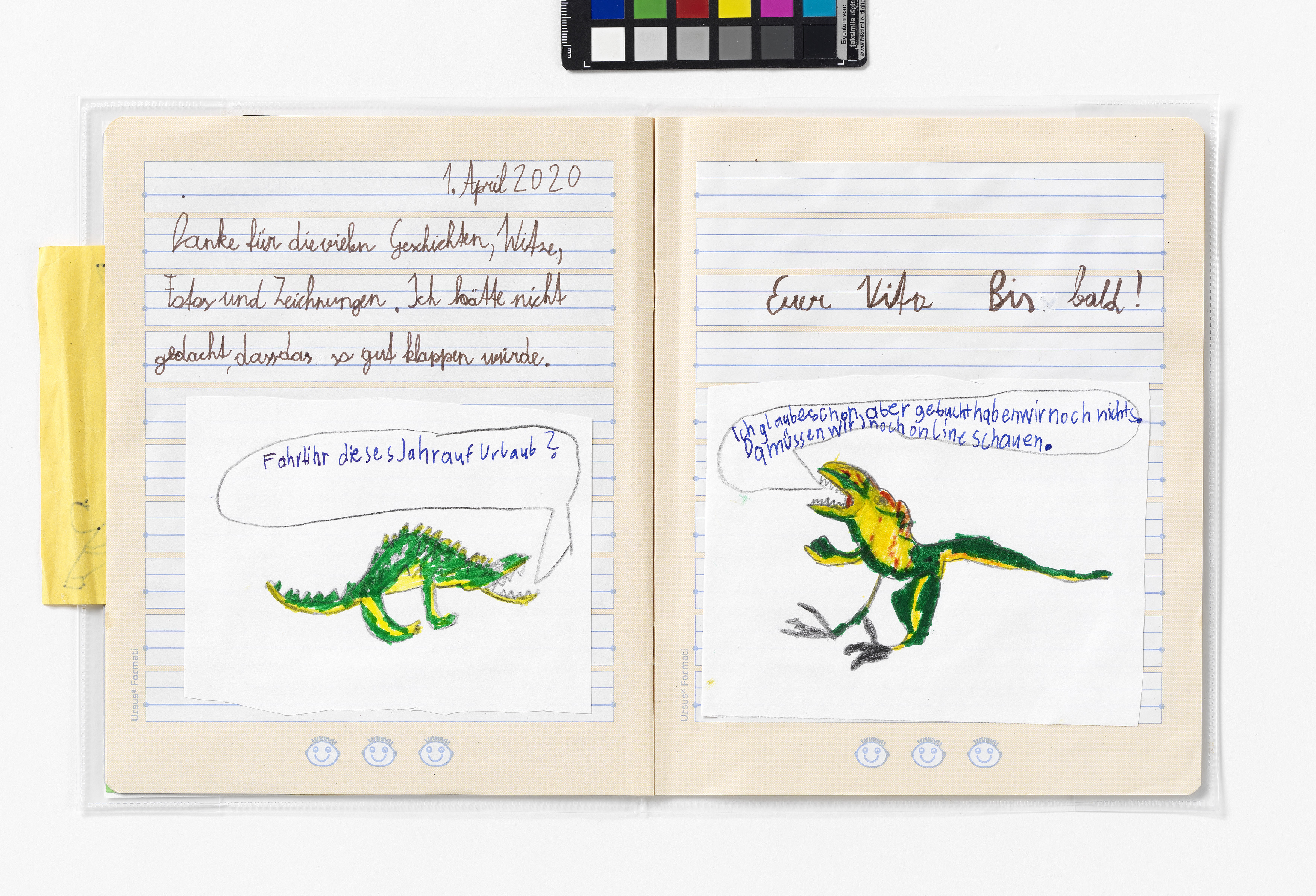 Dieses Heft, das als Form der kontaktlosen Nachbarschaftskommunikation in der Zeit des ersten Corona-Lockdowns und danach diente, enthält Botschaften, Textbeiträge, Zeichnungen und Fotografien von Hausbewohner*innen aller Altersgruppen. Das Cover und der erste Eintrag vom 21. März 2020 stammen von Vito Gottfried-Lulić, dem Sohn der Lebenspartnerin des Initiators und Schenkers des Hefts, Christof Stein; der letzte Eintrag vom 1. Juli 2020 stammt von Christof Stein selbst.