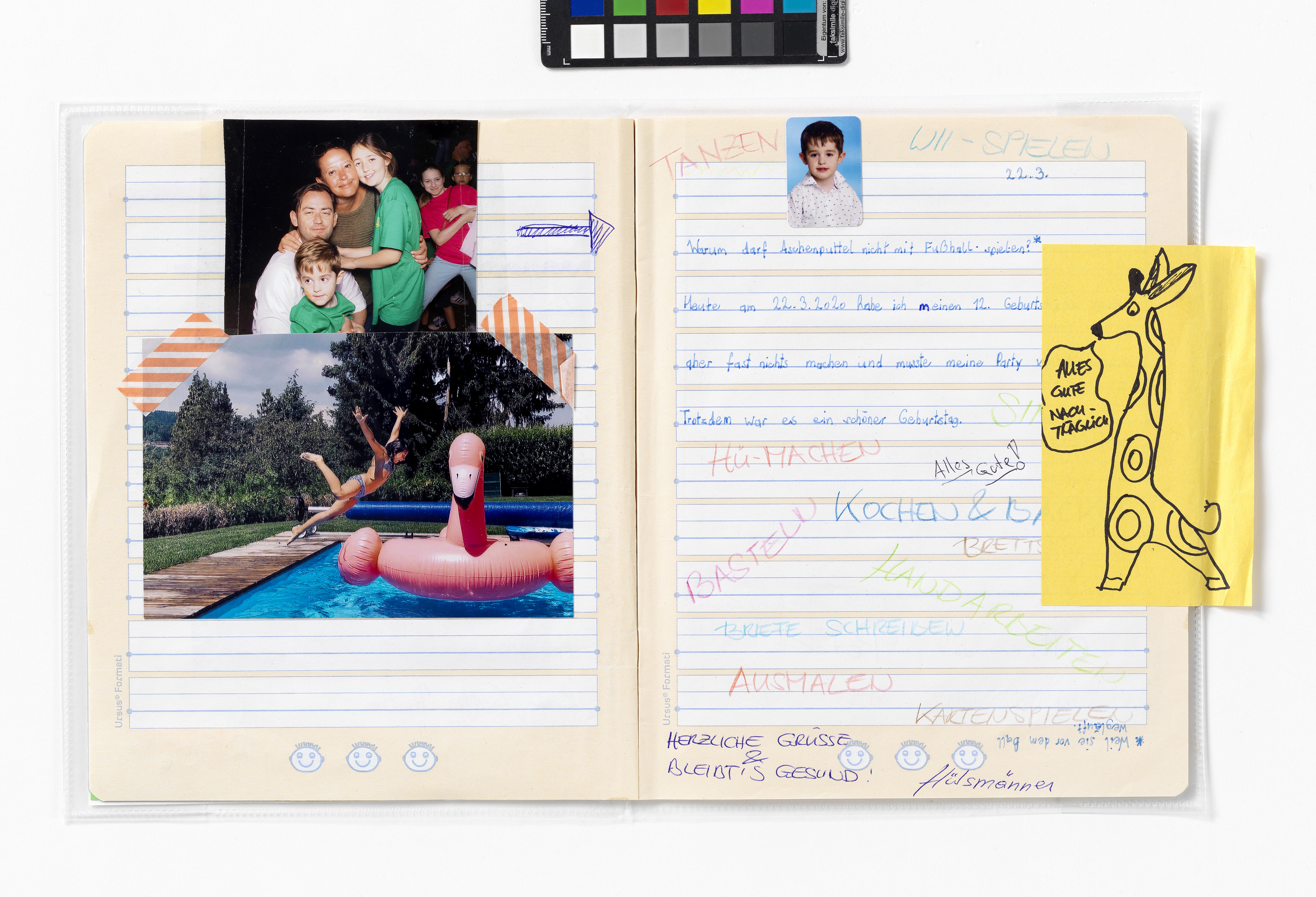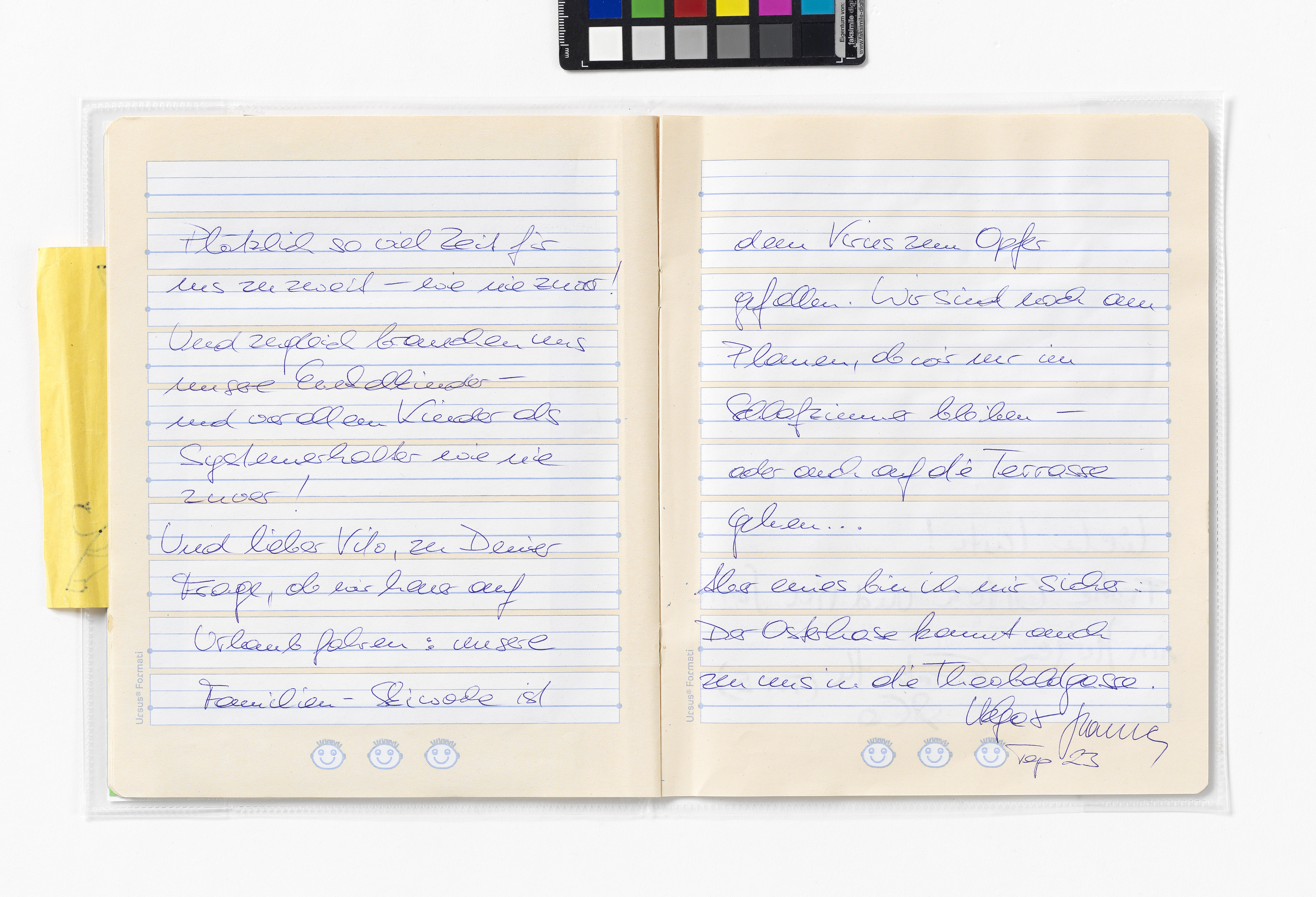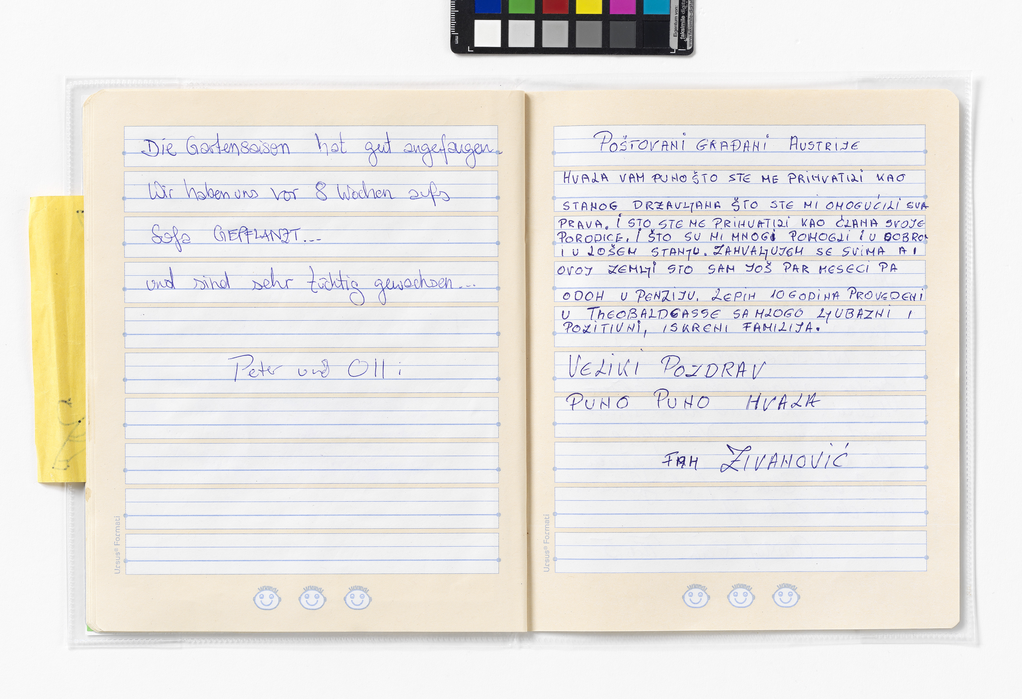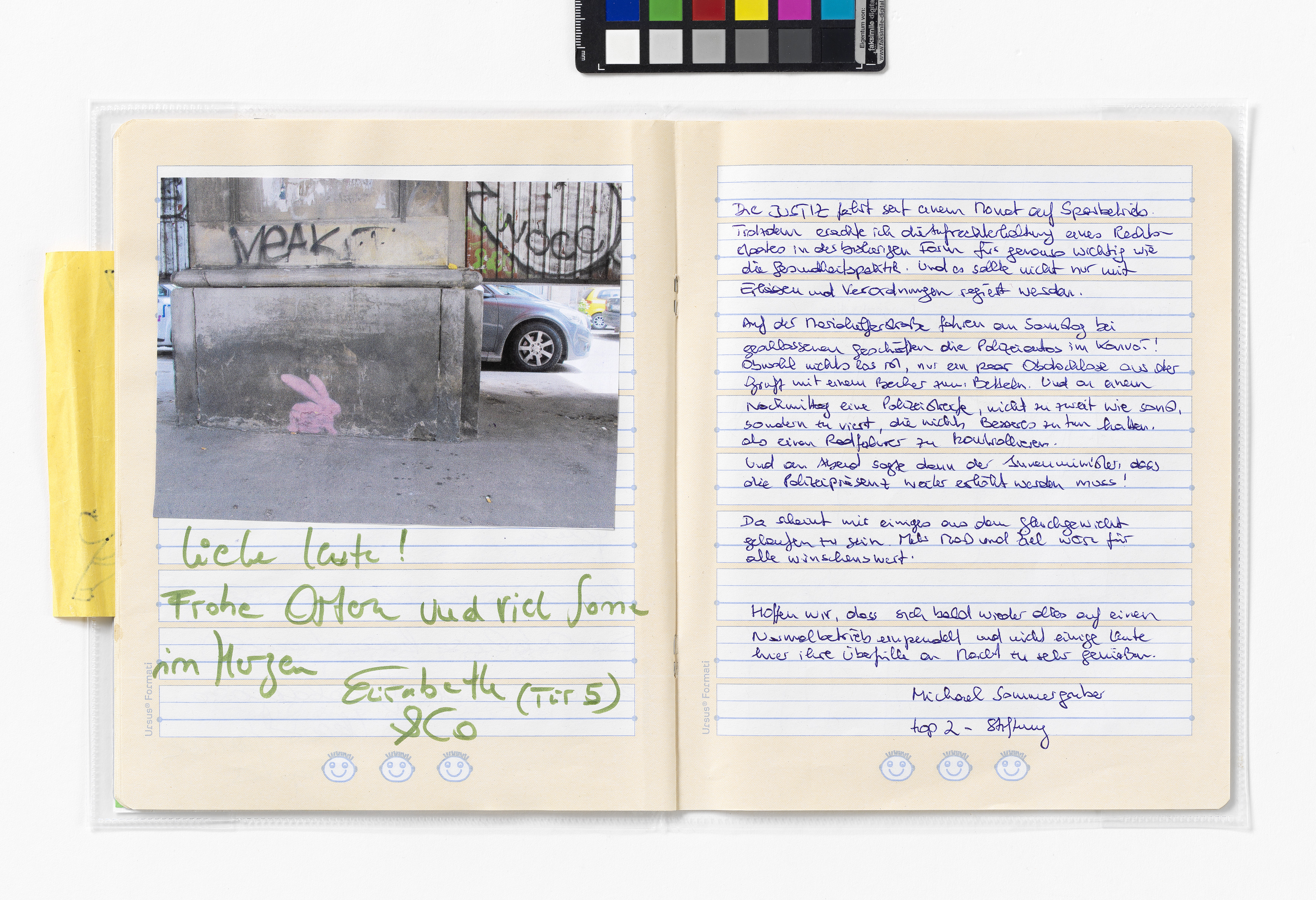 Dieses Heft, das als Form der kontaktlosen Nachbarschaftskommunikation in der Zeit des ersten Corona-Lockdowns und danach diente, enthält Botschaften, Textbeiträge, Zeichnungen und Fotografien von Hausbewohner*innen aller Altersgruppen. Das Cover und der erste Eintrag vom 21. März 2020 stammen von Vito Gottfried-Lulić, dem Sohn der Lebenspartnerin des Initiators und Schenkers des Hefts, Christof Stein; der letzte Eintrag vom 1. Juli 2020 stammt von Christof Stein selbst.