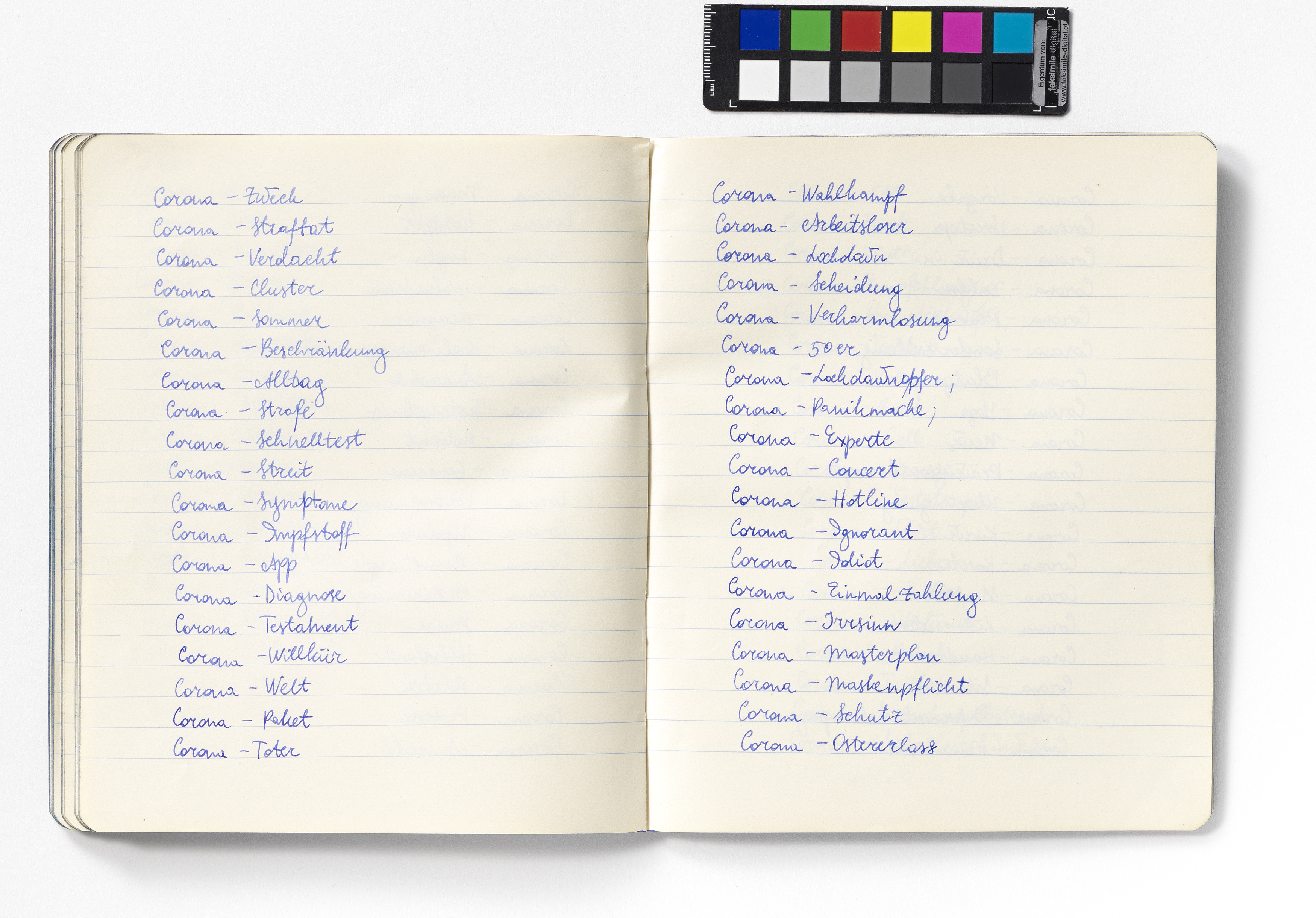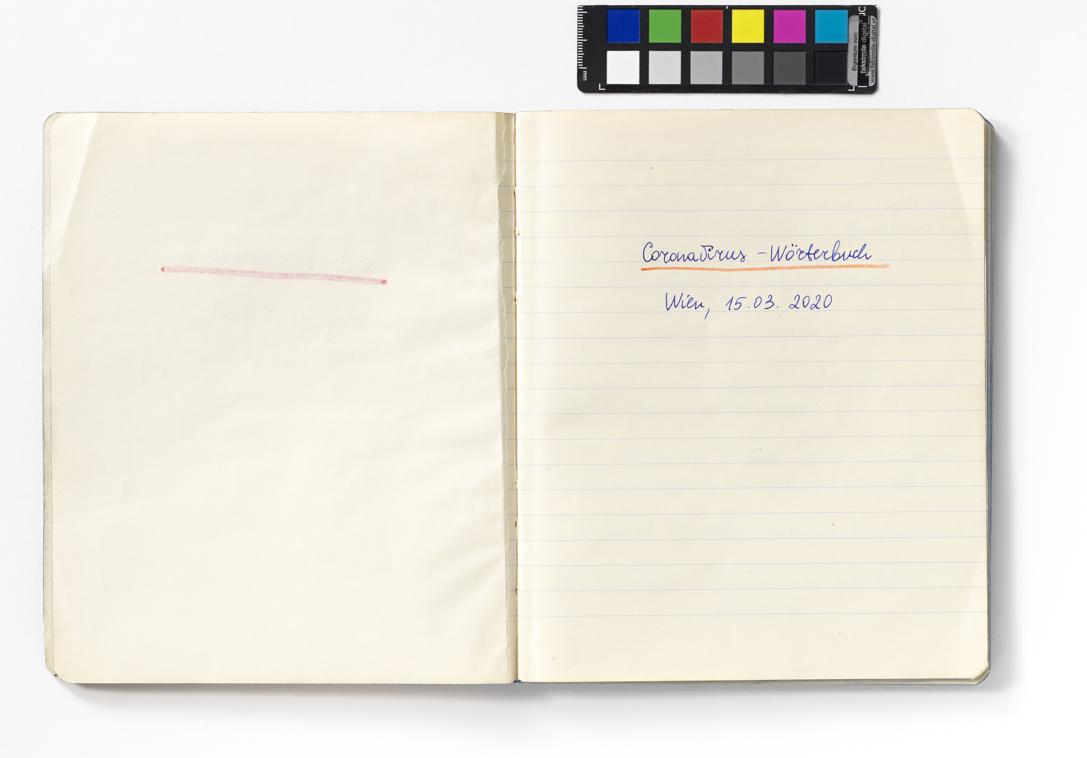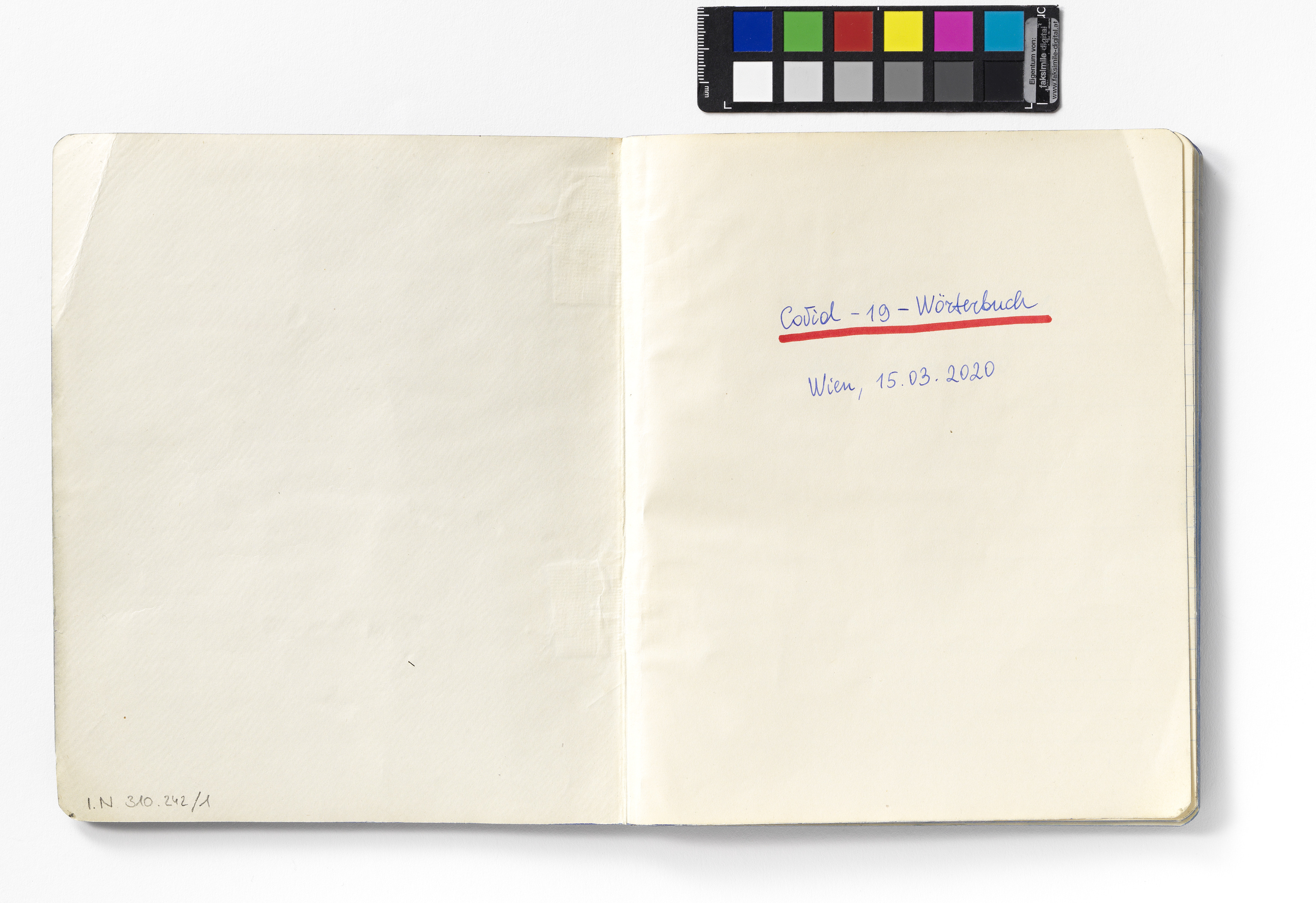 Liniertes Heft mit rund 100 handbeschriebenen Seiten, betitelt mit “Covid-19-Wörterbuch, Wien, 15.03.2020”. Dem Wörterbuch sind zehn handgeschriebene Zettel mit Vokabel-Notizen beigelegt (I.N. 310.242/2-11), die dem Verfassen des Wörterbuchs vorausgingen