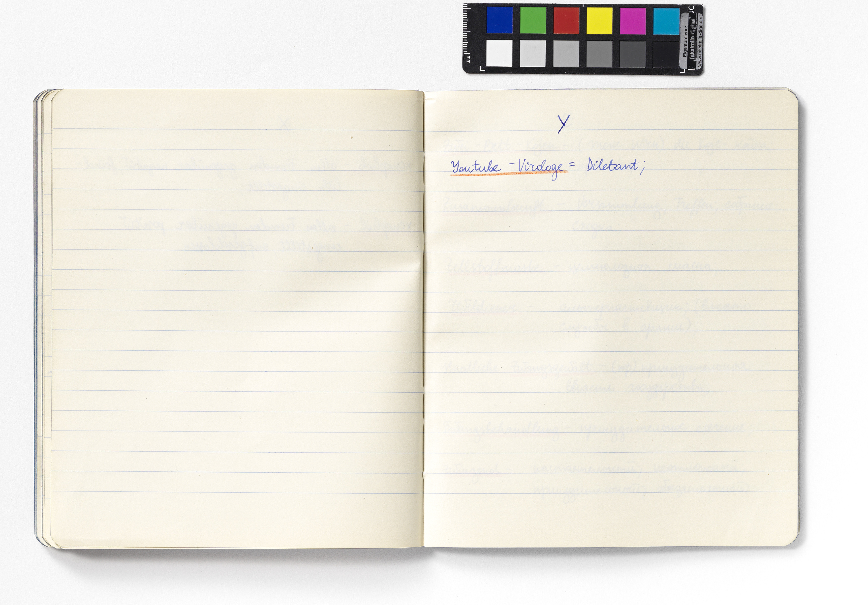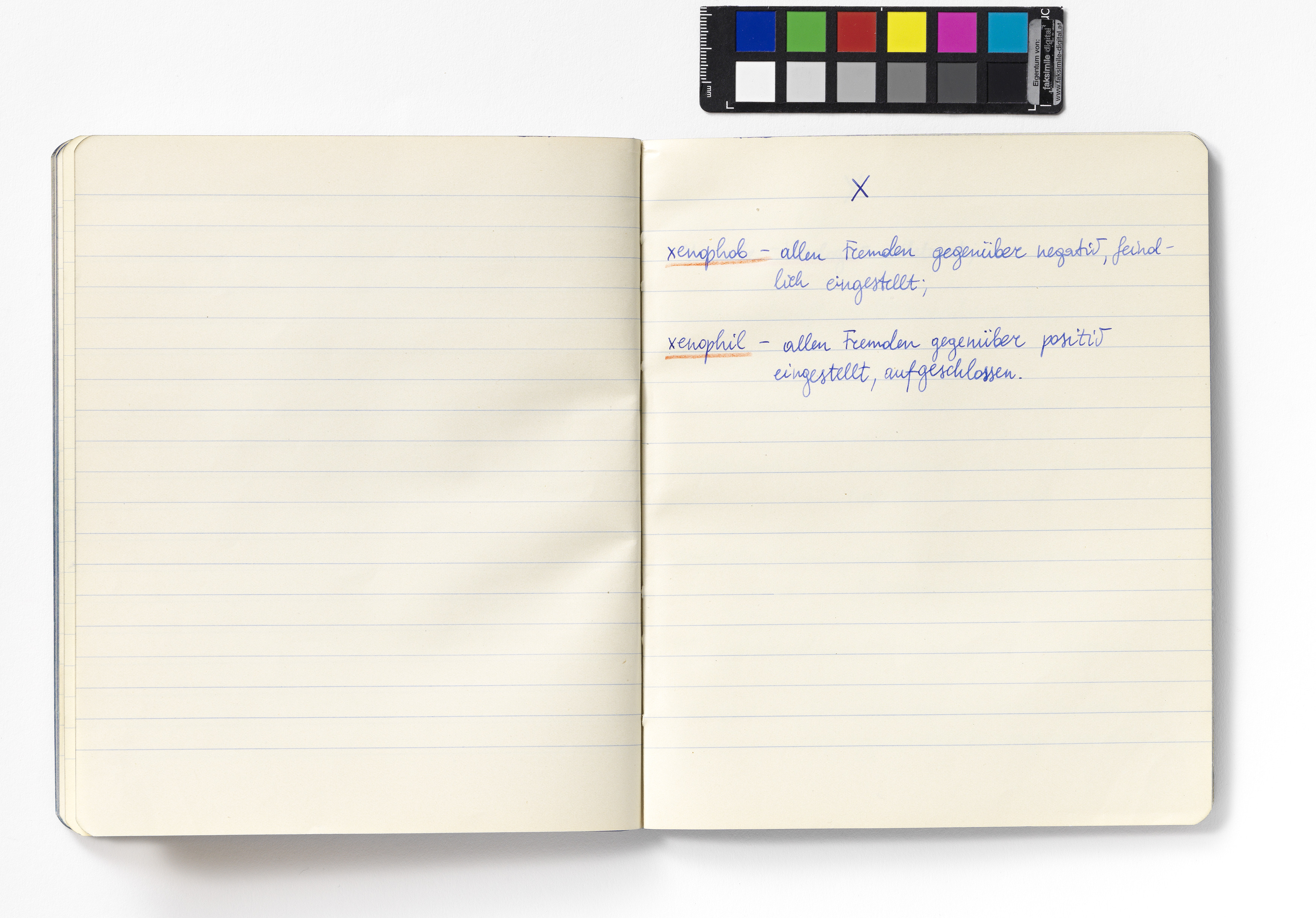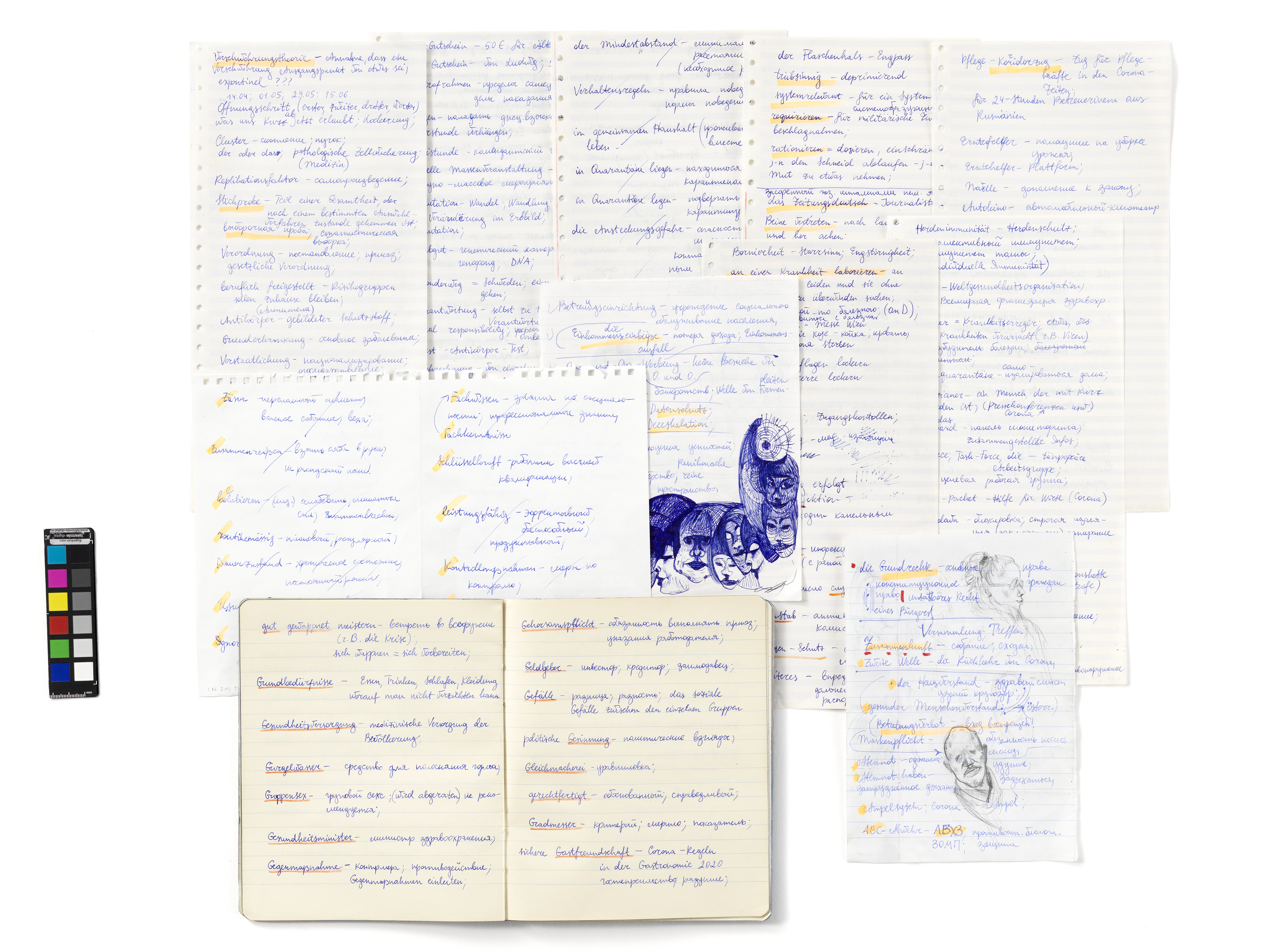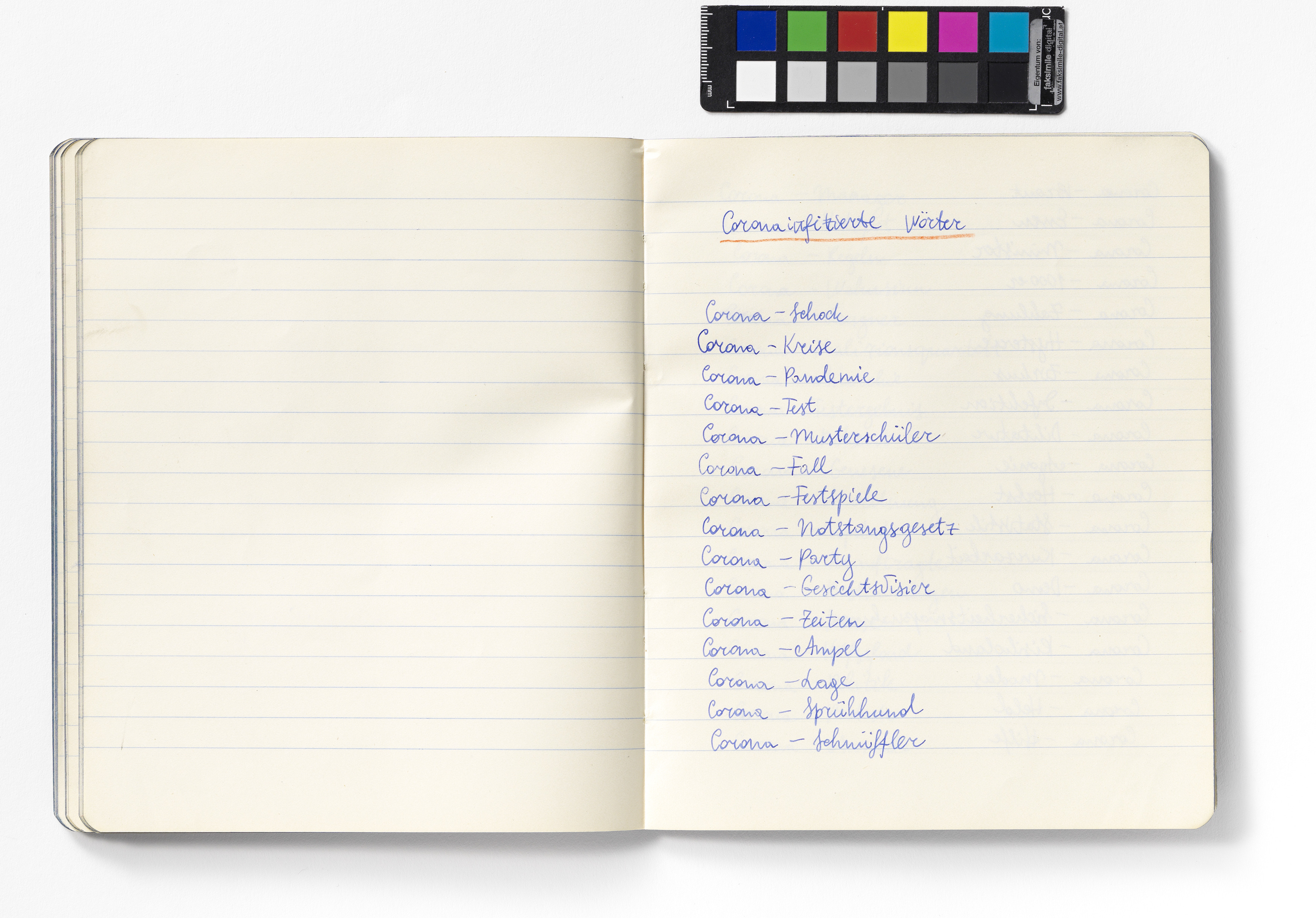 Liniertes Heft mit rund 100 handbeschriebenen Seiten, betitelt mit “Covid-19-Wörterbuch, Wien, 15.03.2020”. Dem Wörterbuch sind zehn handgeschriebene Zettel mit Vokabel-Notizen beigelegt (I.N. 310.242/2-11), die dem Verfassen des Wörterbuchs vorausgingen