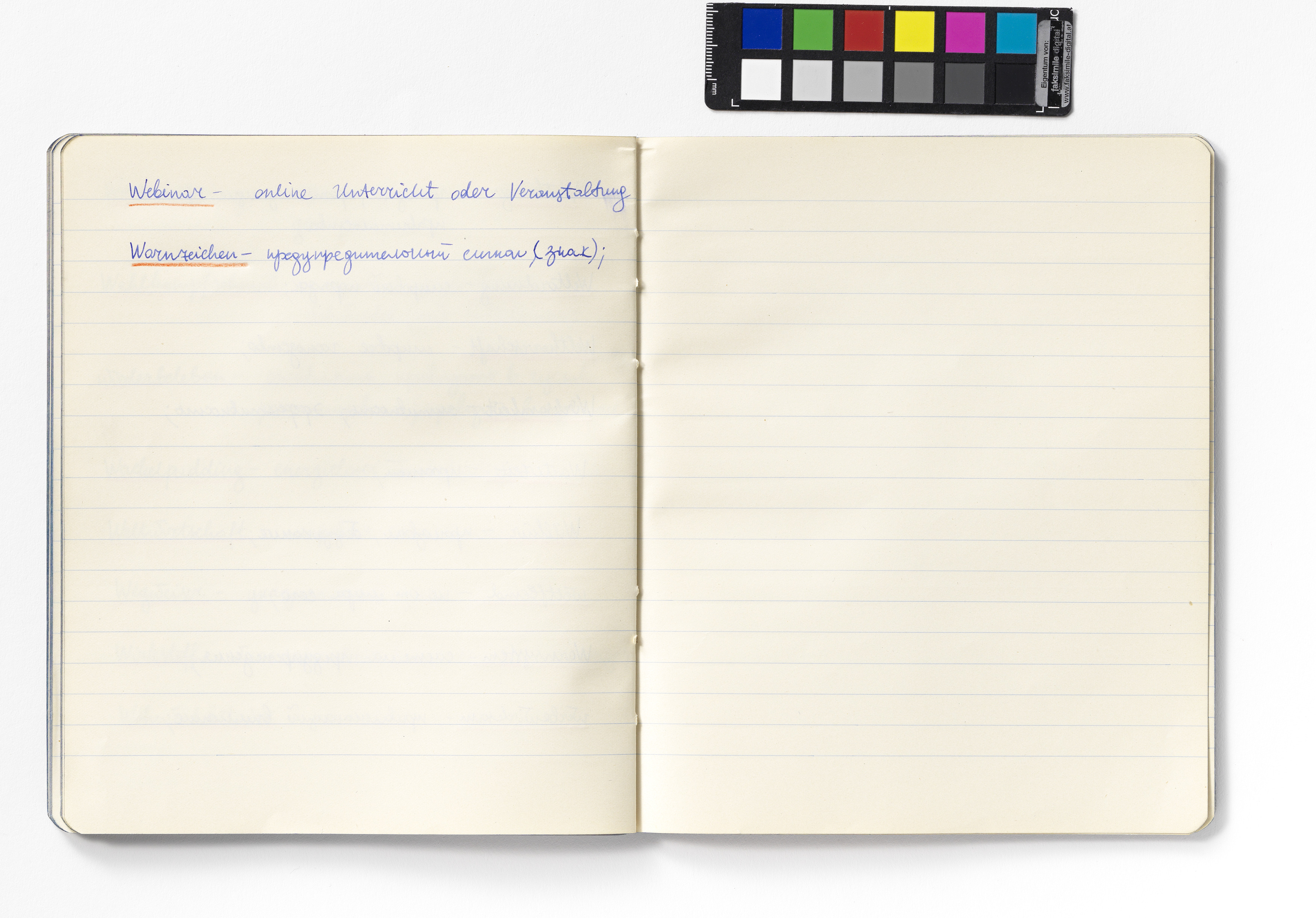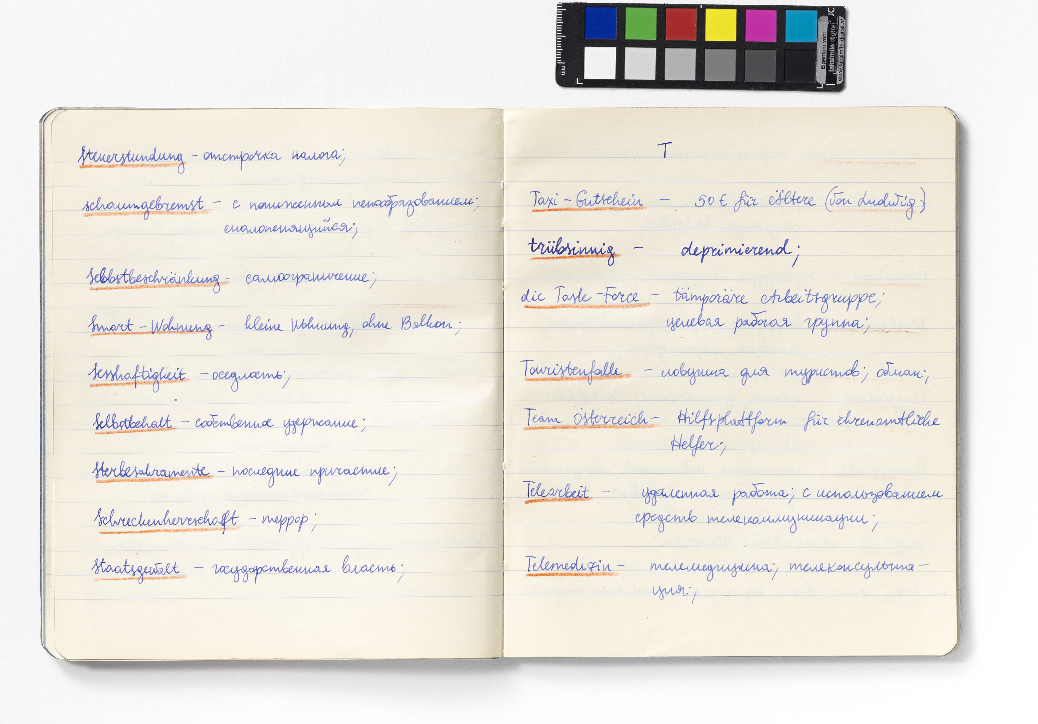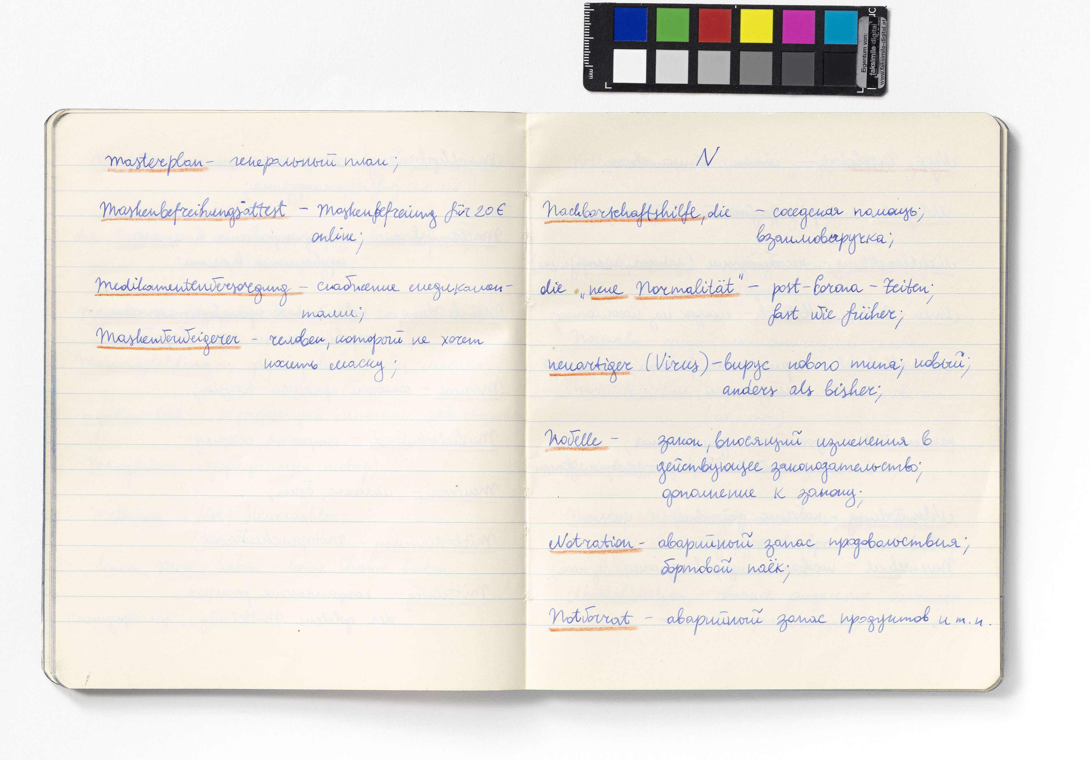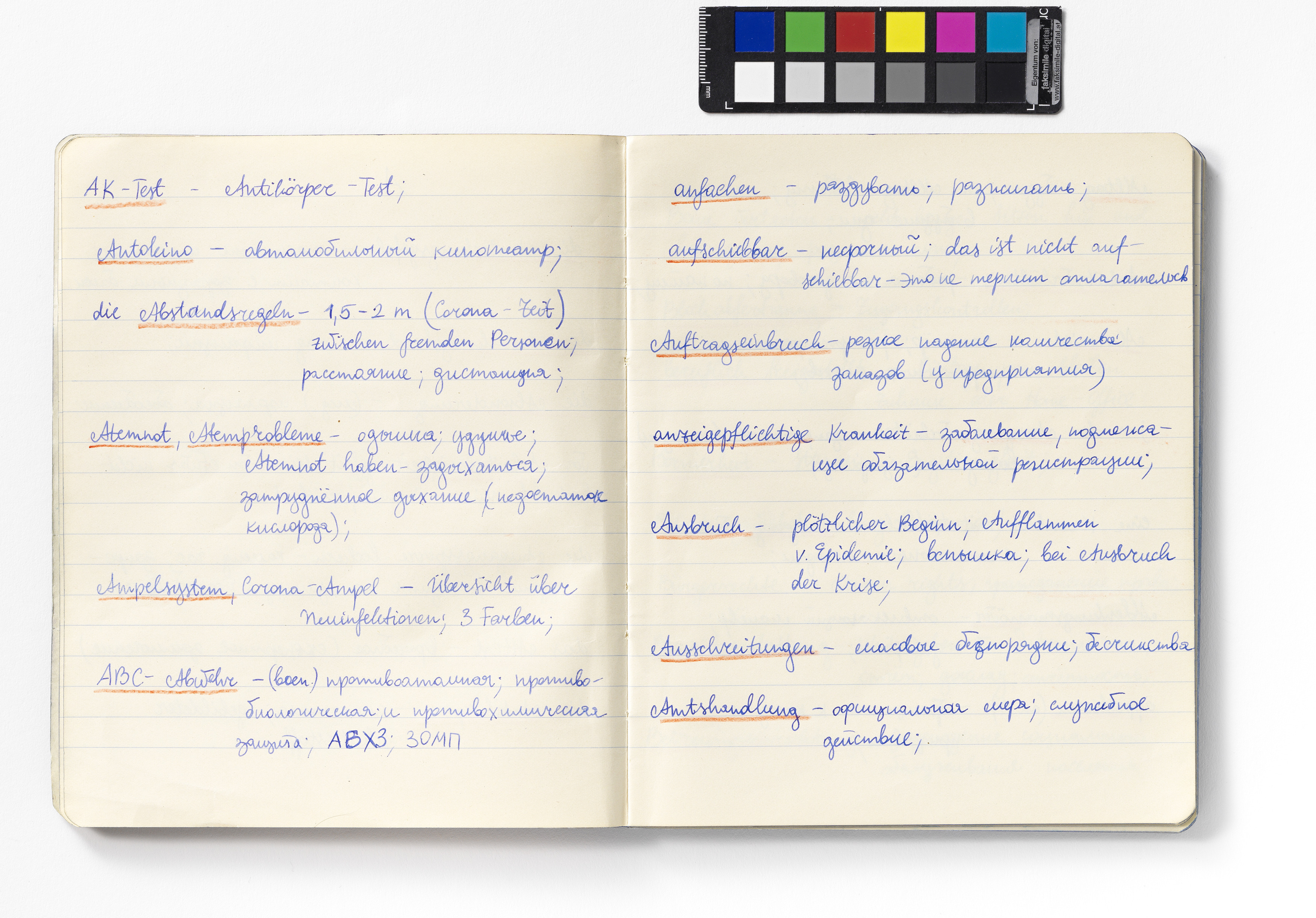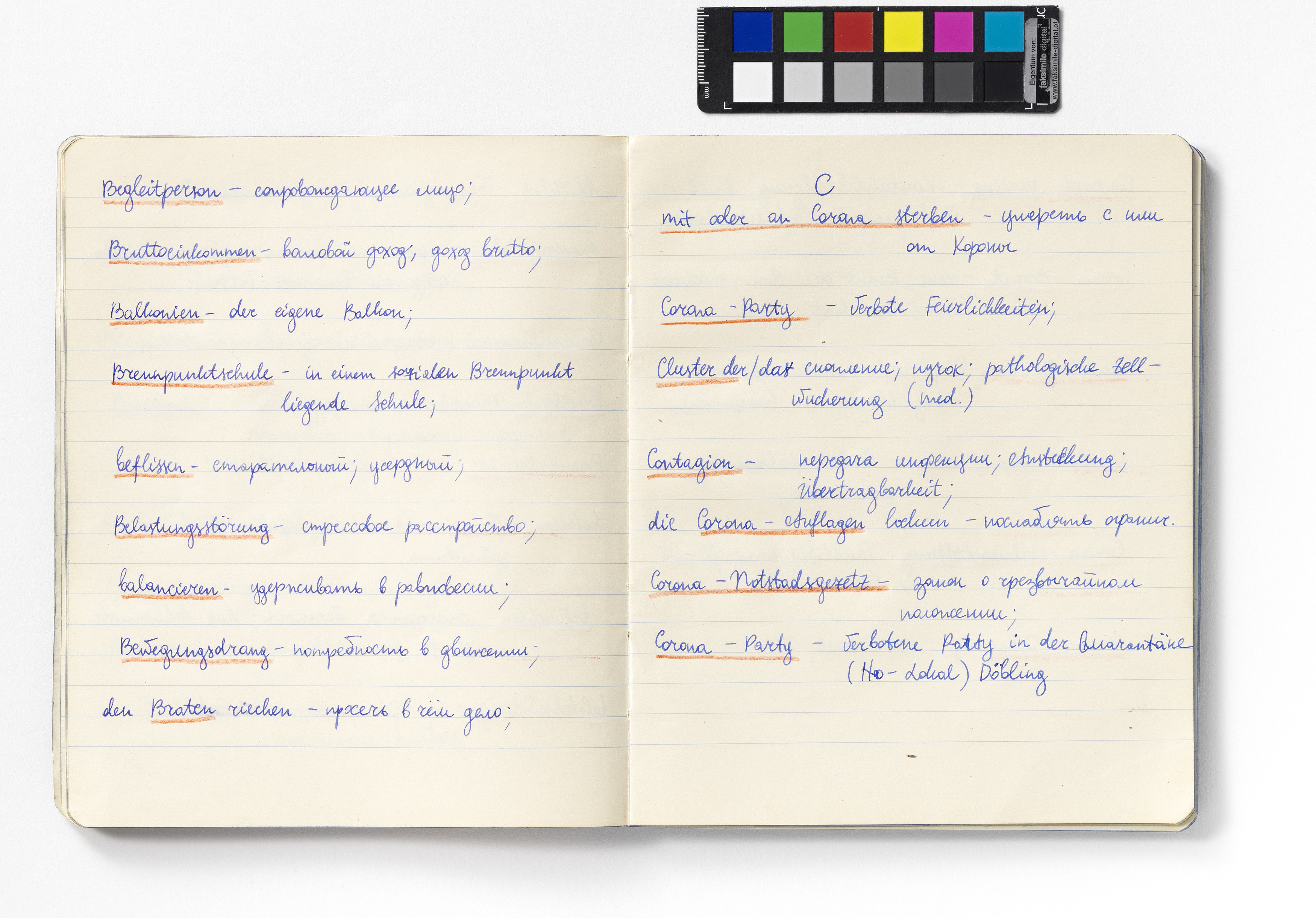 “In Corona-Zeiten hat sich die deutsche Sprache sehr verändert. Viele (für mich) unbekannte Wörter, die ich übersetzen musste. In der Quarantäne ist dann eine Idee entstanden, aus diversen Notizen ein echtes Covid-19-Wörterbuch zu schaffen. Auch für die zweite Welle, falls sie kommt. Jeden Tag kommen neue Wörter dazu. Und die Arbeit geht weiter…”(Schenkung Oleksandra Stehlik; Erwerbung im Rahmen des Sammlungsaufrufs “Corona in Wien” 2020. Vgl. dazu auch https://magazin.wienmuseum.at/das-covid-19-woerterbuch-von-oleksandra-stehlik, 2.3.2021)