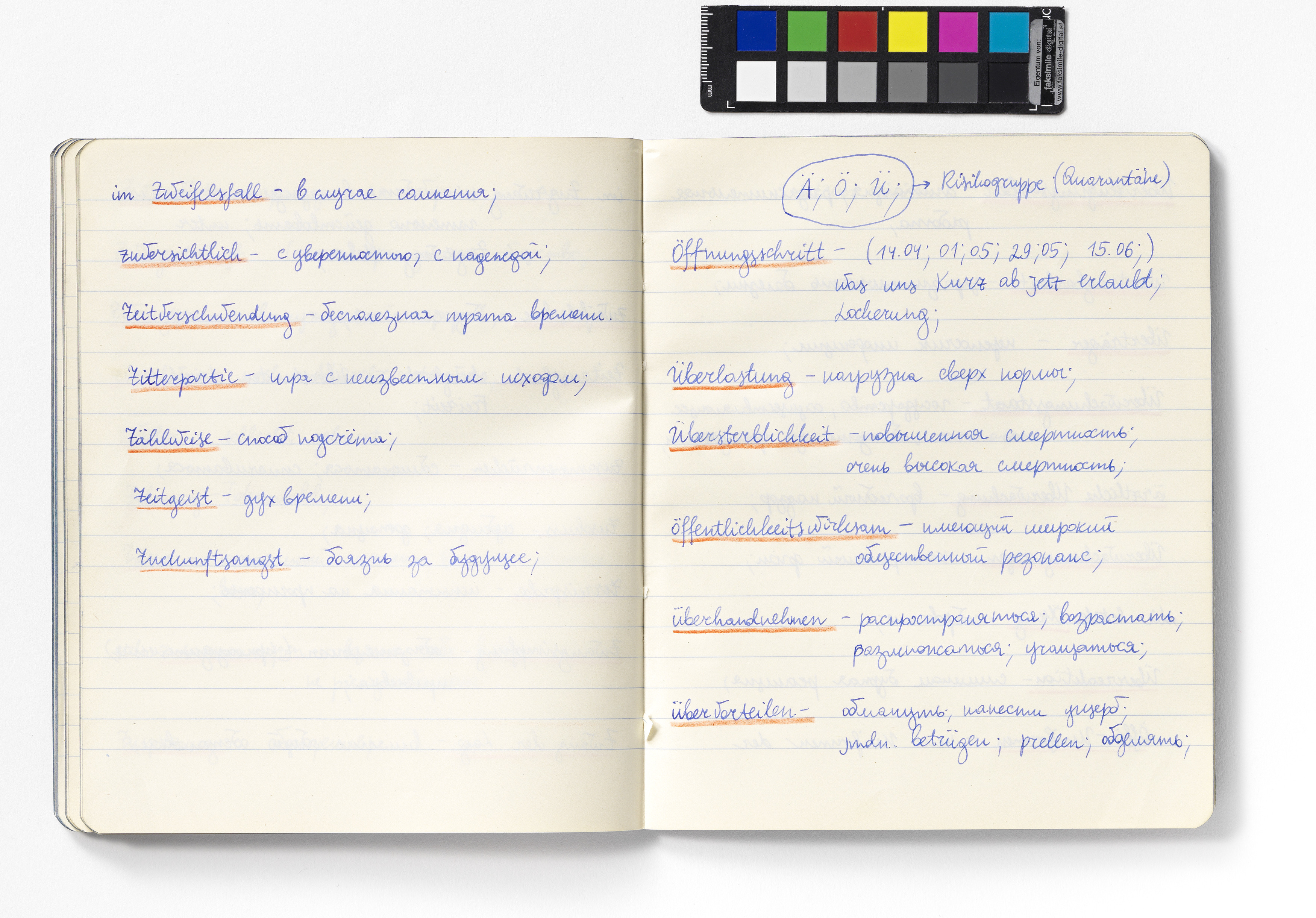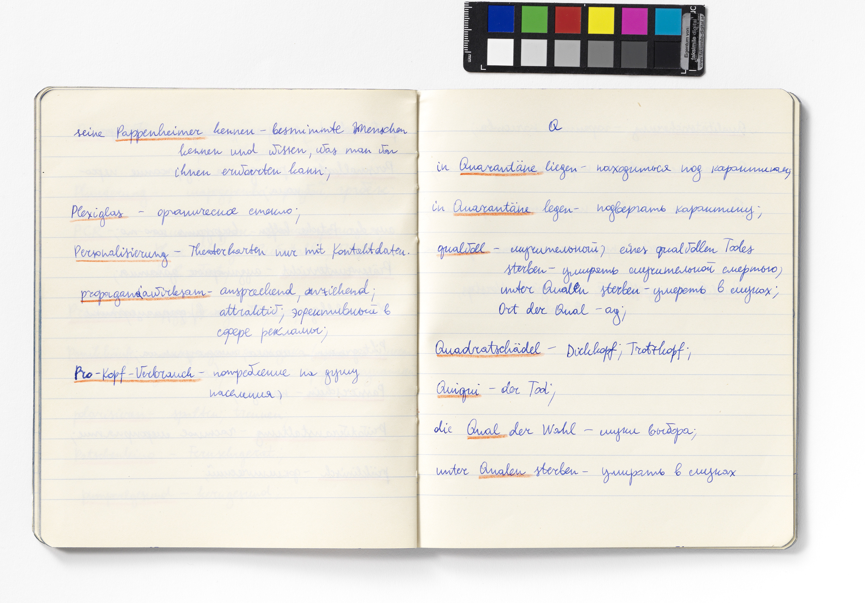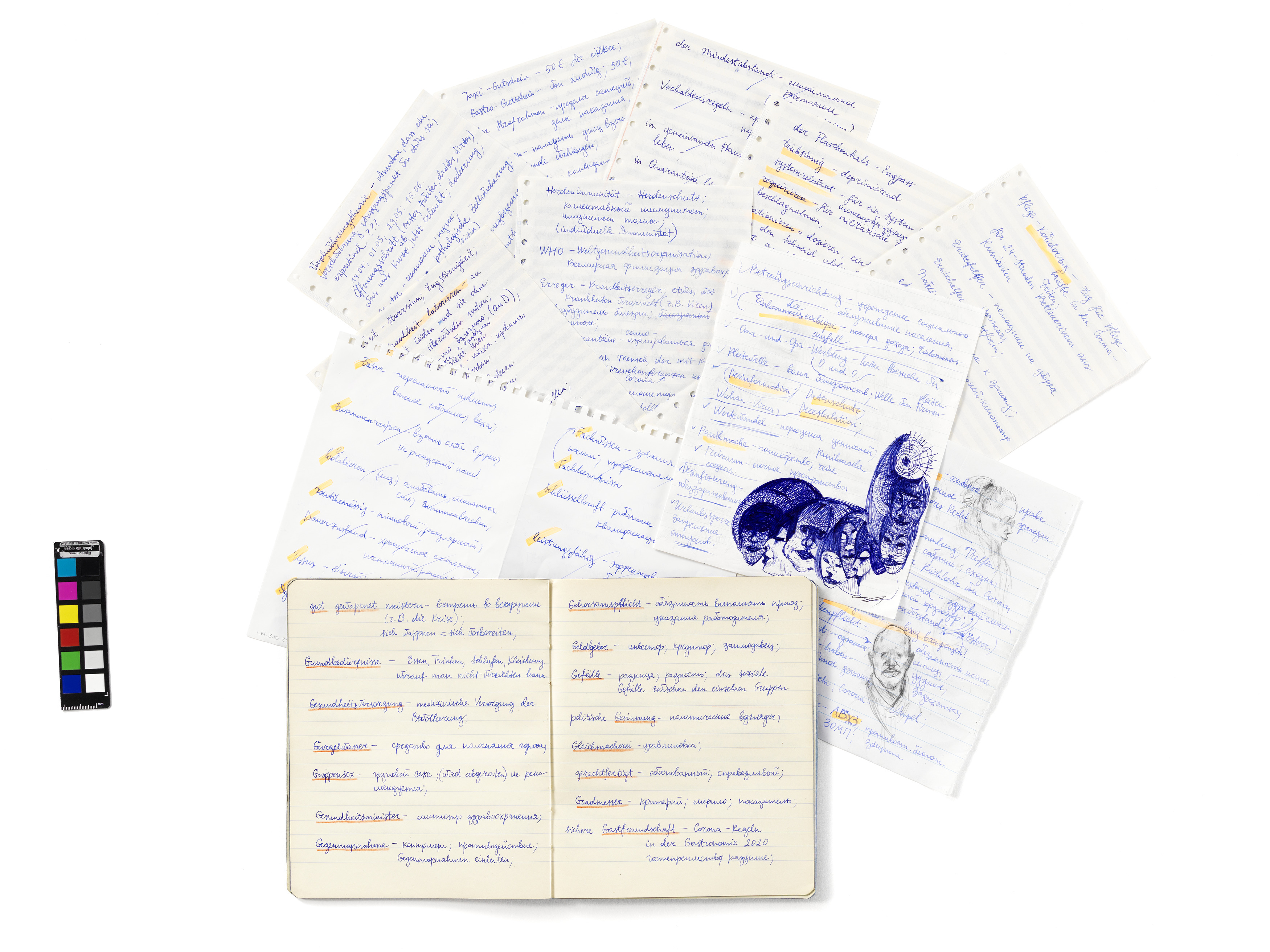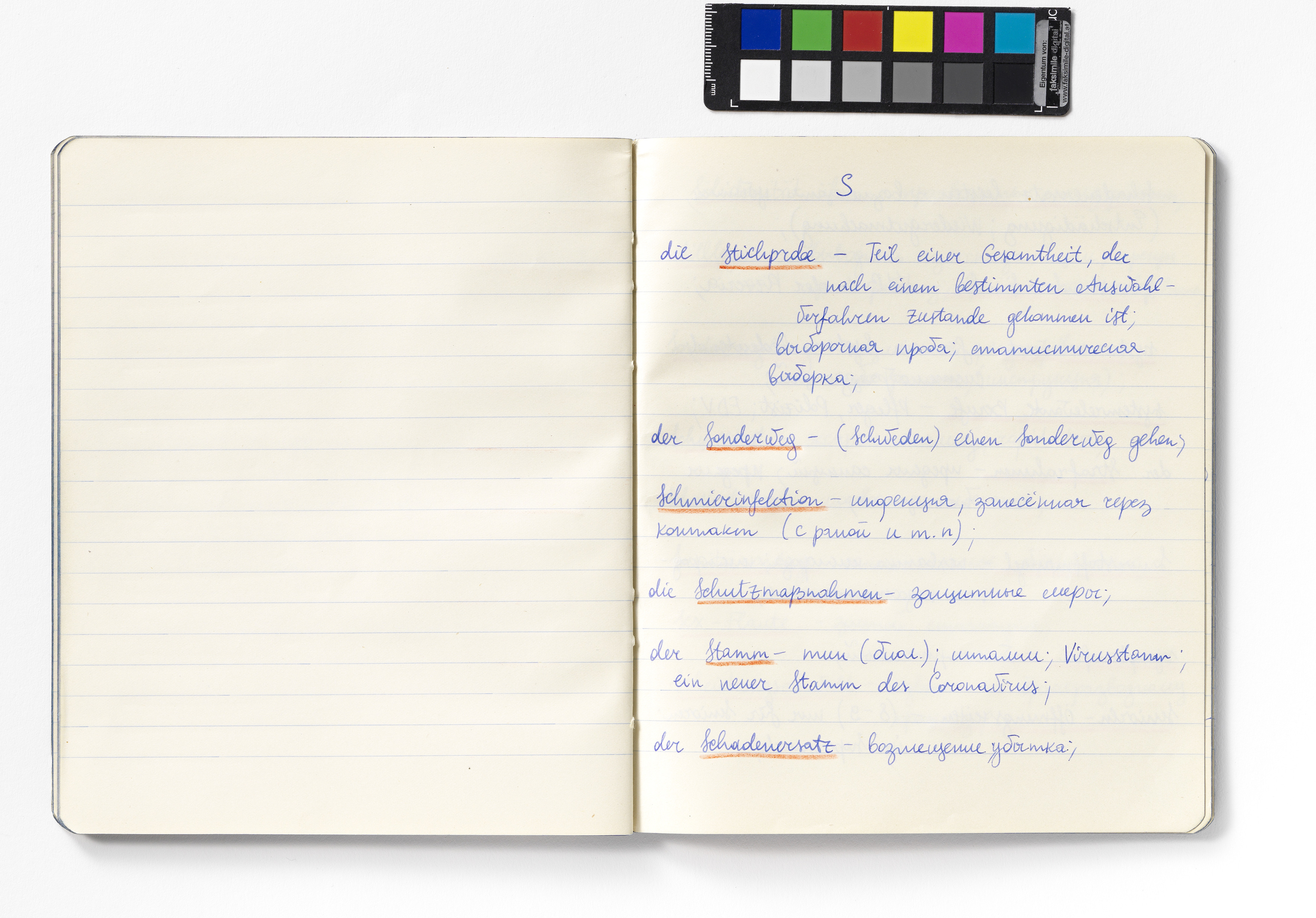 “In Corona-Zeiten hat sich die deutsche Sprache sehr verändert. Viele (für mich) unbekannte Wörter, die ich übersetzen musste. In der Quarantäne ist dann eine Idee entstanden, aus diversen Notizen ein echtes Covid-19-Wörterbuch zu schaffen. Auch für die zweite Welle, falls sie kommt. Jeden Tag kommen neue Wörter dazu. Und die Arbeit geht weiter…”(Schenkung Oleksandra Stehlik; Erwerbung im Rahmen des Sammlungsaufrufs “Corona in Wien” 2020. Vgl. dazu auch https://magazin.wienmuseum.at/das-covid-19-woerterbuch-von-oleksandra-stehlik, 2.3.2021)