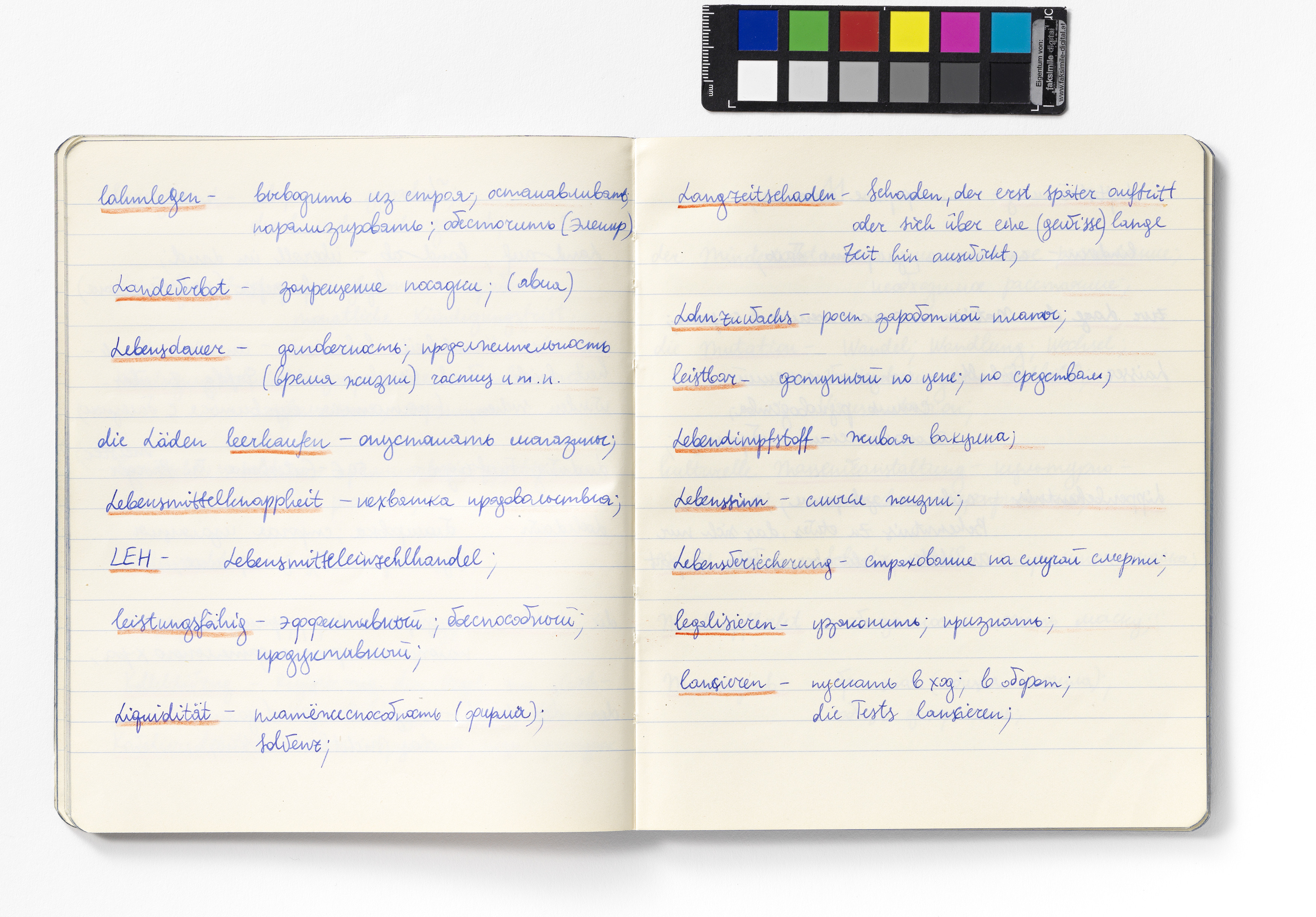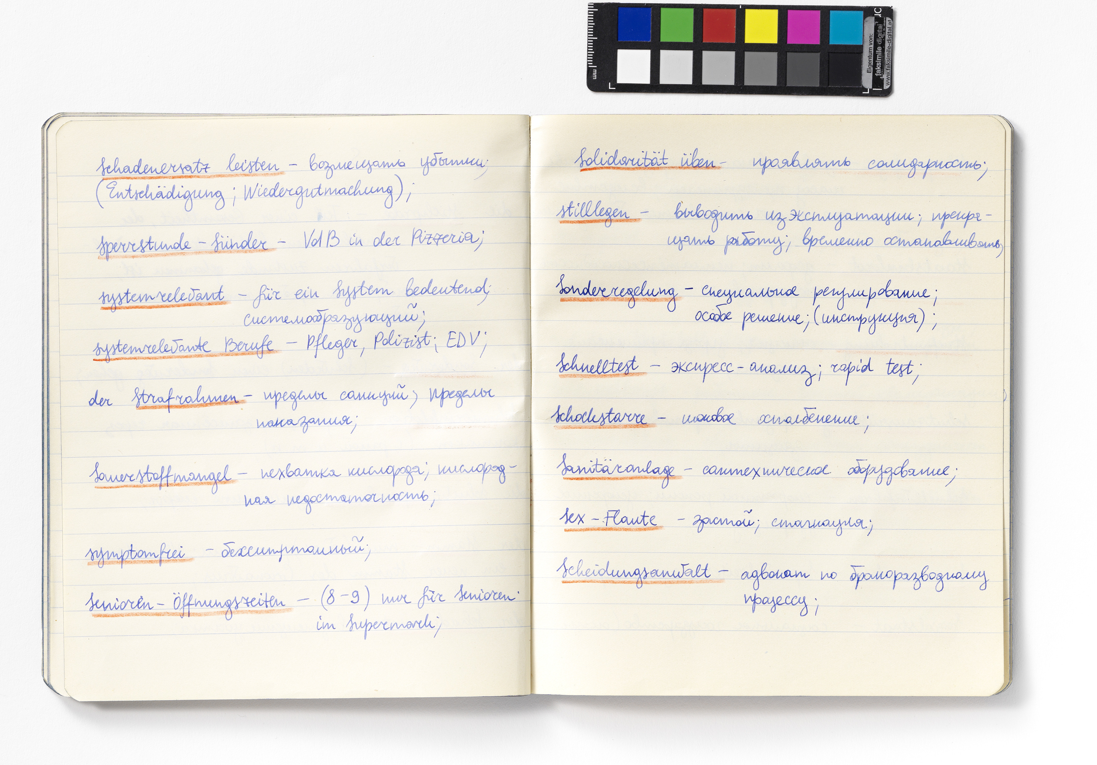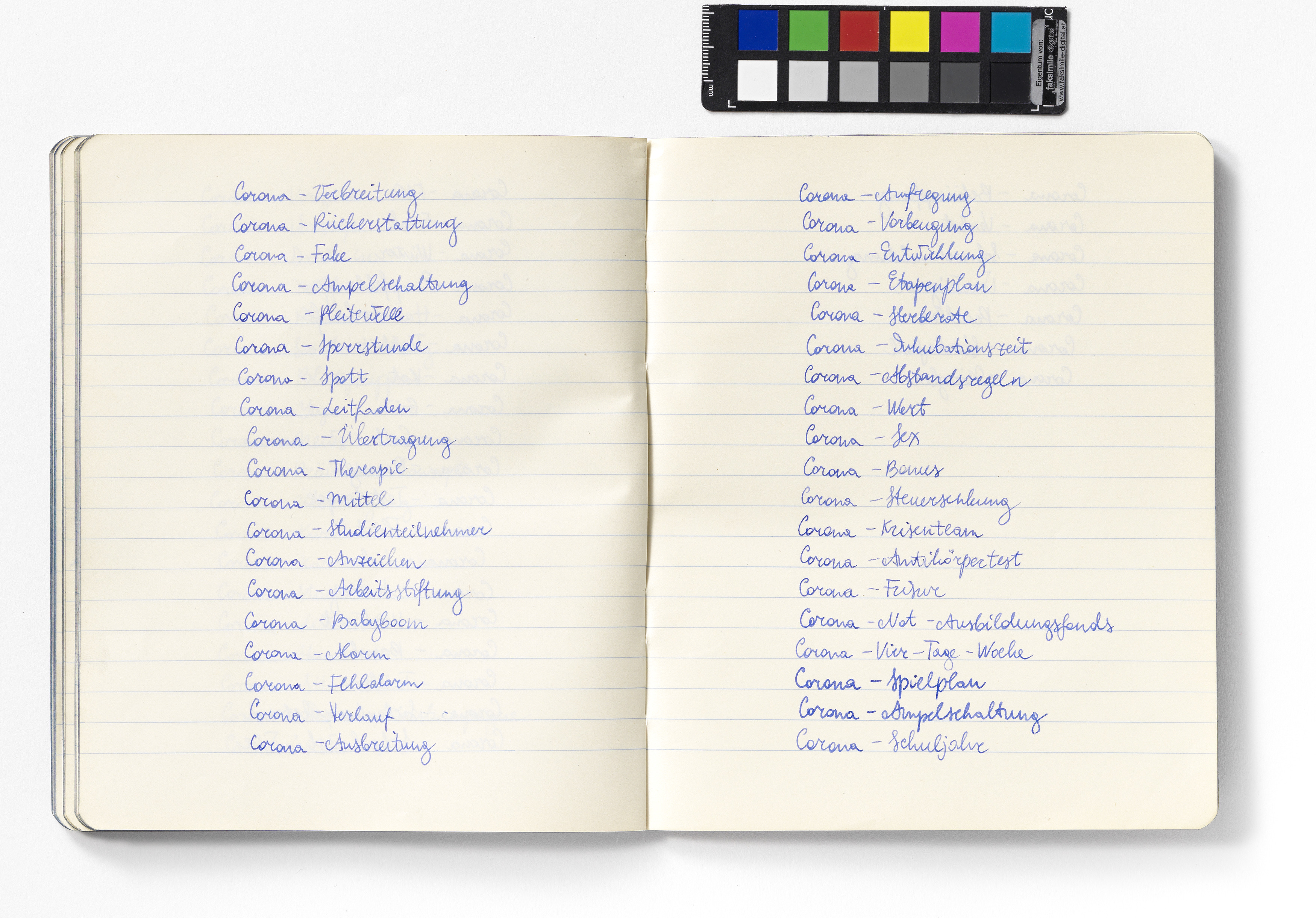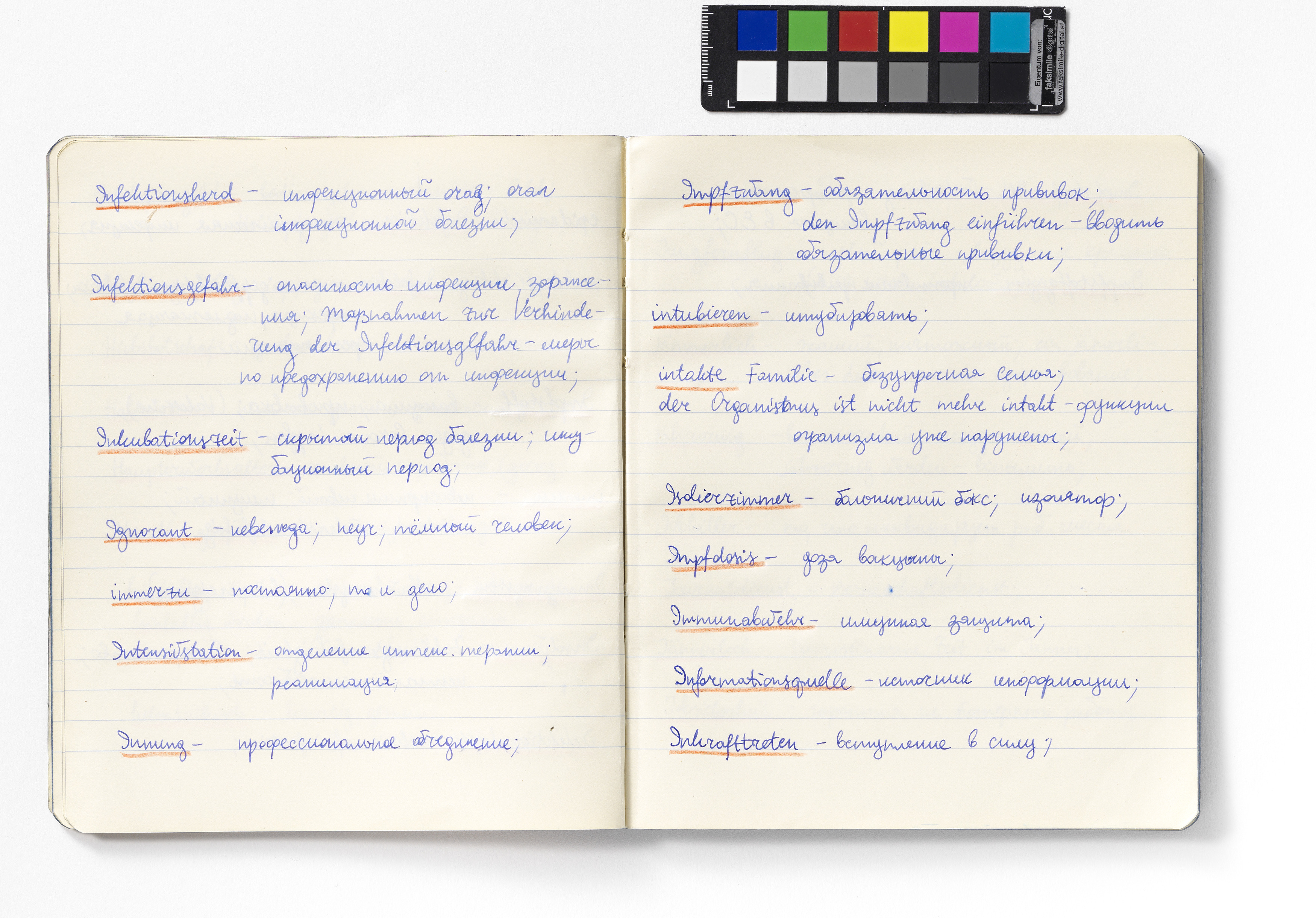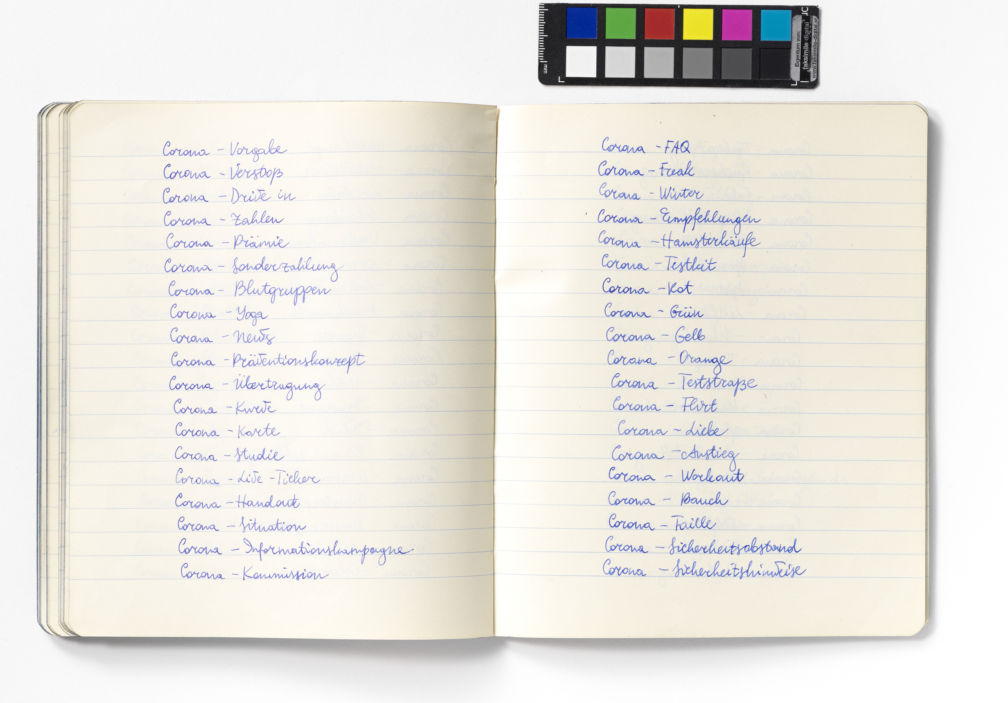“In Corona-Zeiten hat sich die deutsche Sprache sehr verändert. Viele (für mich) unbekannte Wörter, die ich übersetzen musste. In der Quarantäne ist dann eine Idee entstanden, aus diversen Notizen ein echtes Covid-19-Wörterbuch zu schaffen. Auch für die zweite Welle, falls sie kommt. Jeden Tag kommen neue Wörter dazu. Und die Arbeit geht weiter…”(Schenkung Oleksandra Stehlik; Erwerbung im Rahmen des Sammlungsaufrufs “Corona in Wien” 2020. Vgl. dazu auch https://magazin.wienmuseum.at/das-covid-19-woerterbuch-von-oleksandra-stehlik, 2.3.2021)