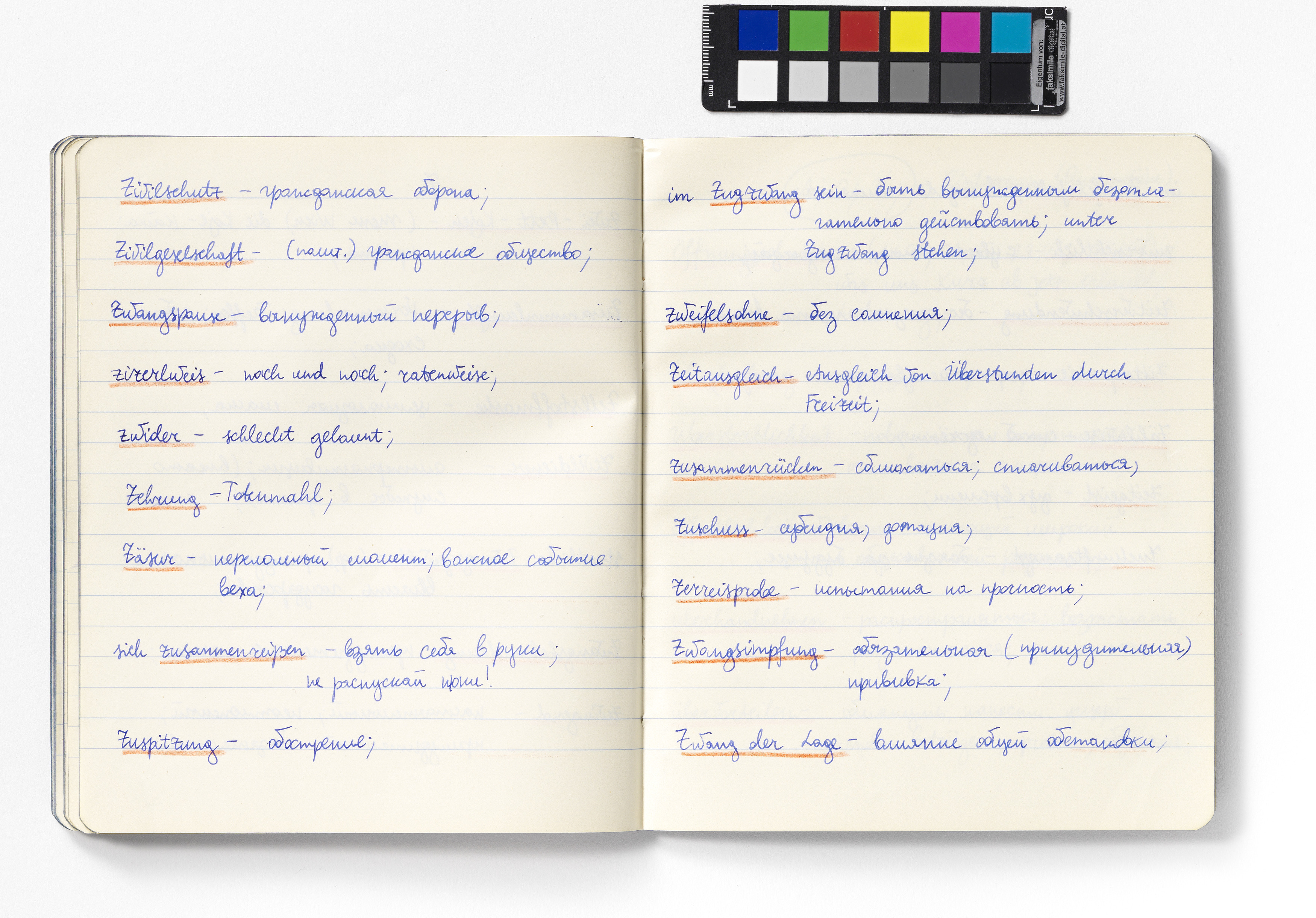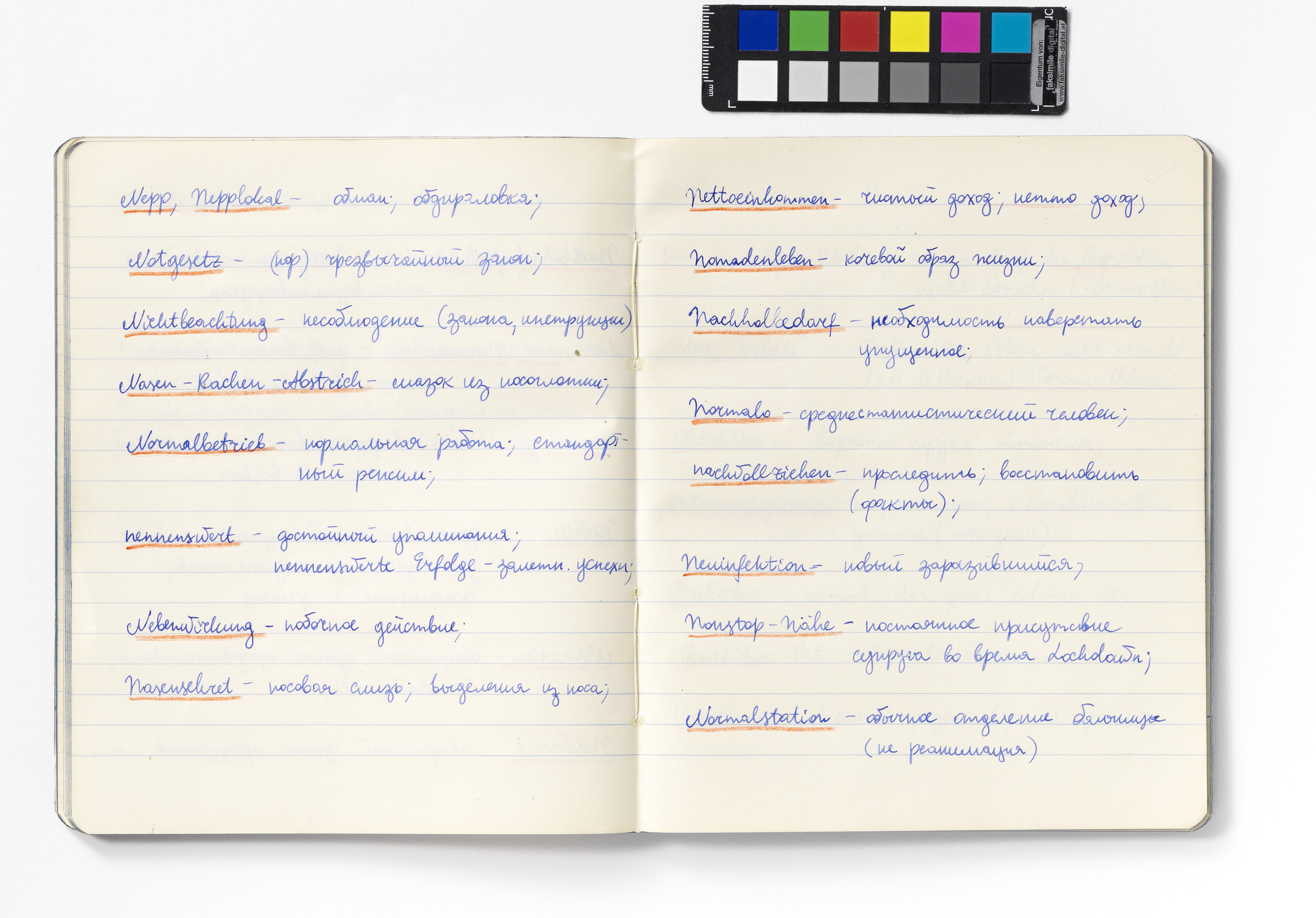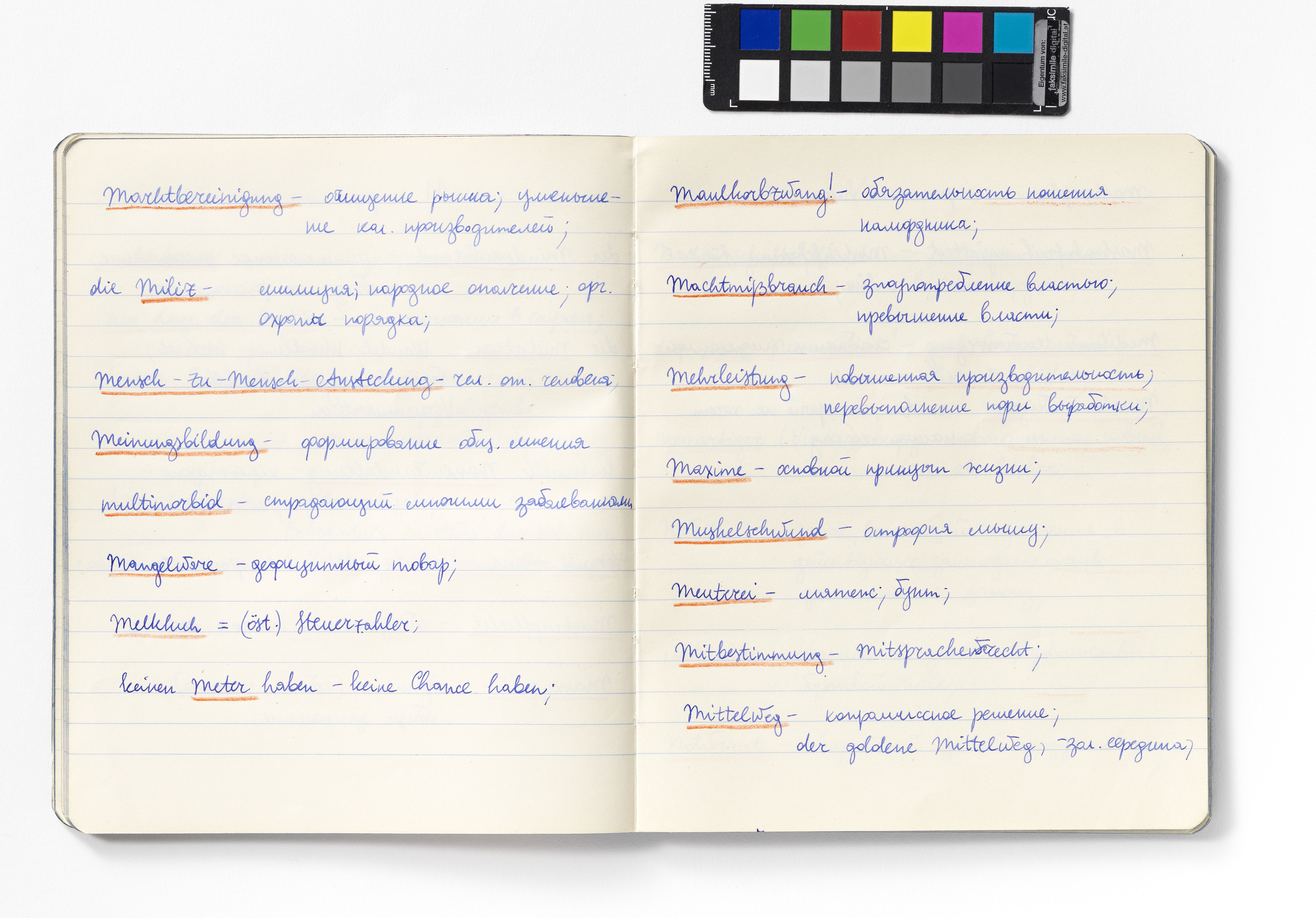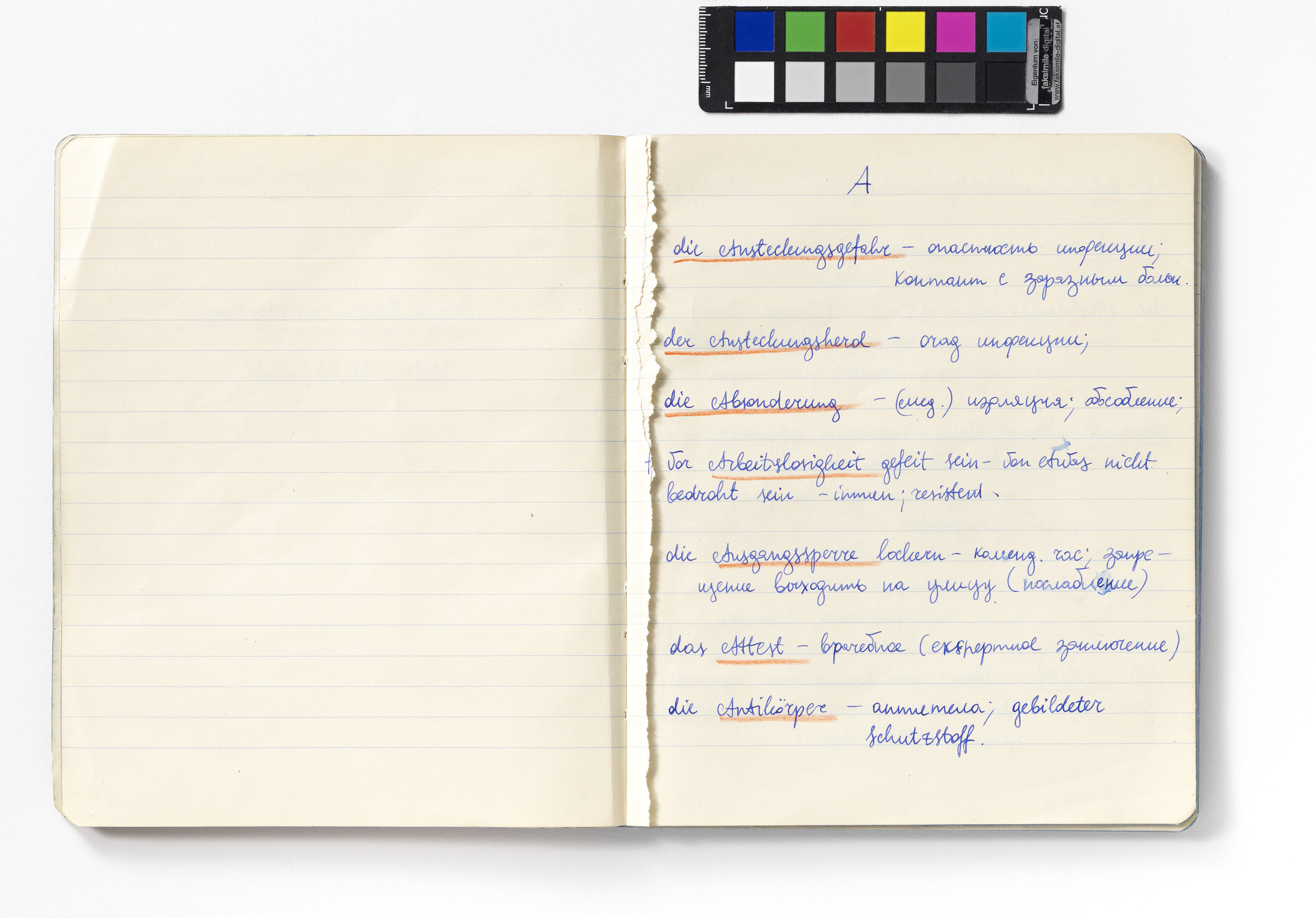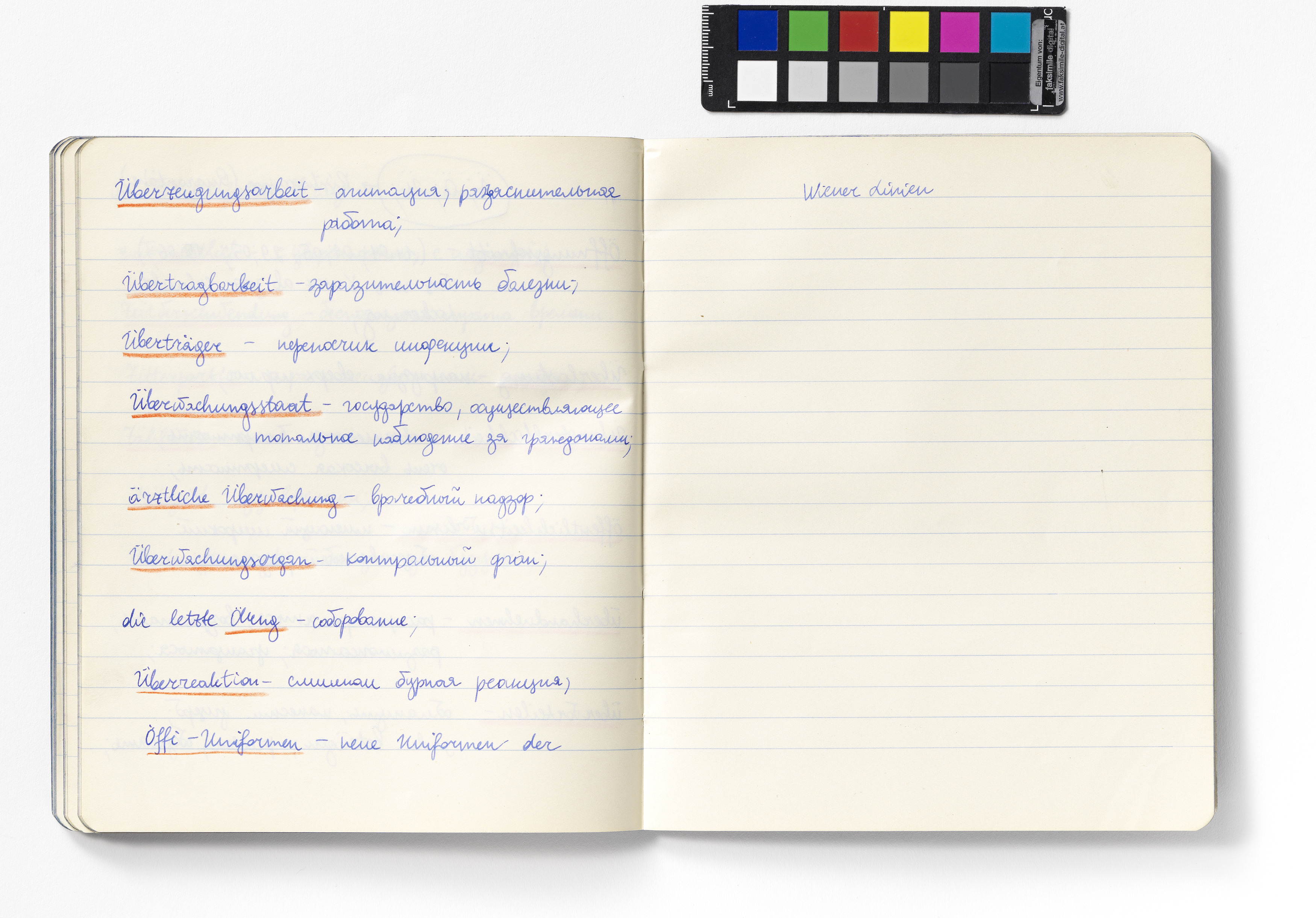 “In Corona-Zeiten hat sich die deutsche Sprache sehr verändert. Viele (für mich) unbekannte Wörter, die ich übersetzen musste. In der Quarantäne ist dann eine Idee entstanden, aus diversen Notizen ein echtes Covid-19-Wörterbuch zu schaffen. Auch für die zweite Welle, falls sie kommt. Jeden Tag kommen neue Wörter dazu. Und die Arbeit geht weiter…”(Schenkung Oleksandra Stehlik; Erwerbung im Rahmen des Sammlungsaufrufs “Corona in Wien” 2020. Vgl. dazu auch https://magazin.wienmuseum.at/das-covid-19-woerterbuch-von-oleksandra-stehlik, 2.3.2021)