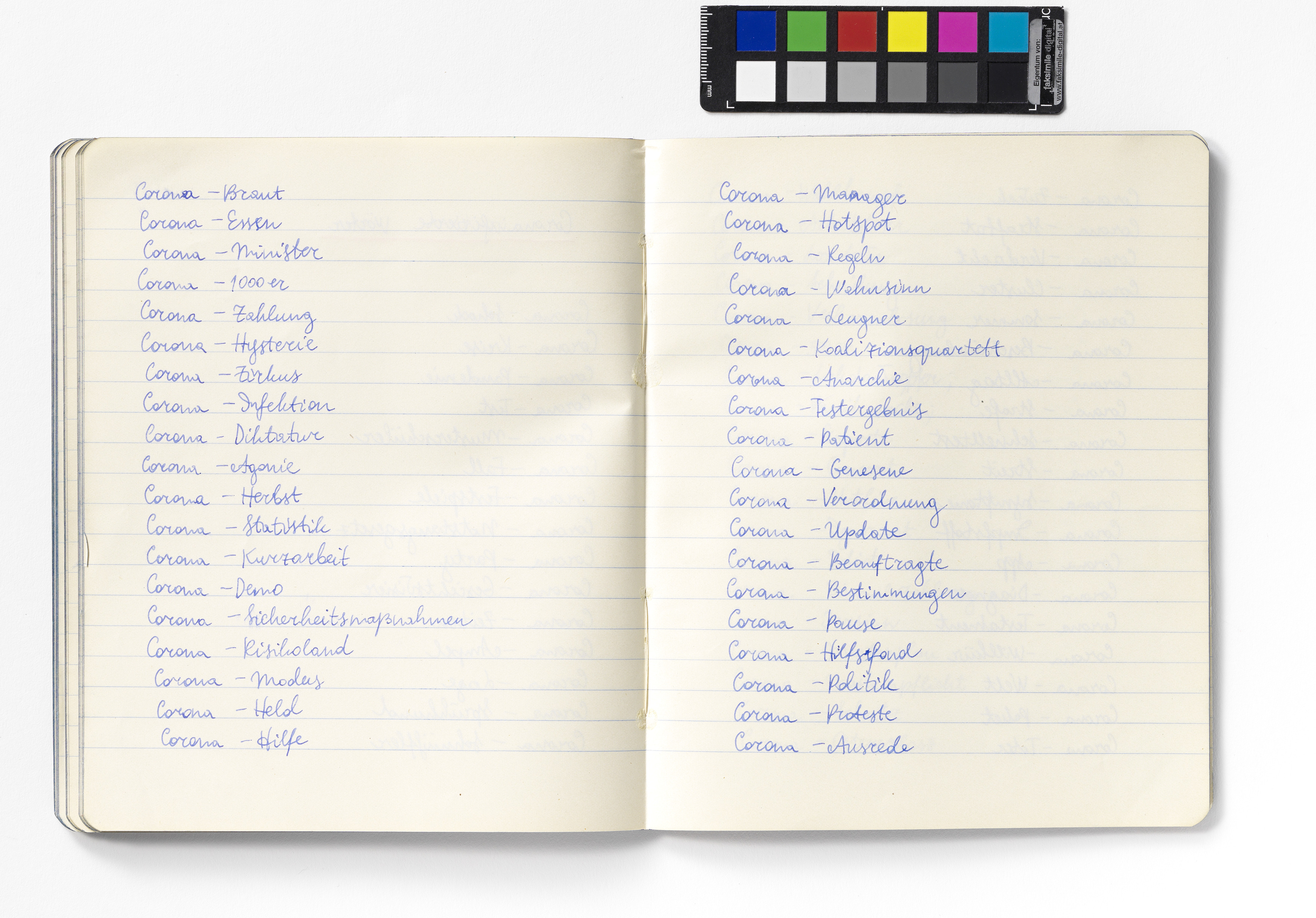 - Selbst zusammengestelltes, handgeschriebenes "Covid-19-Wörterbuch", verfasst während der Corona-Krise 2020