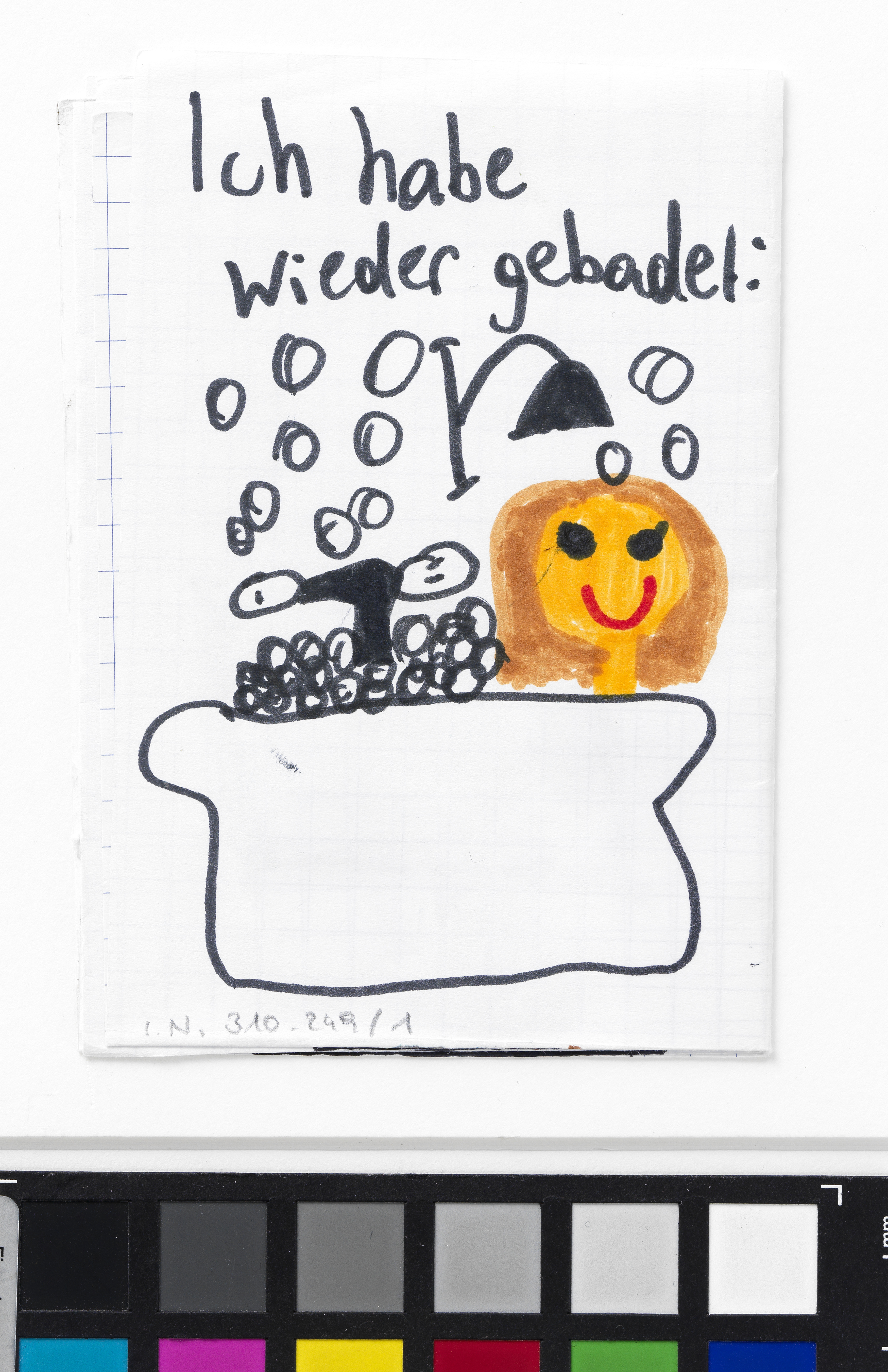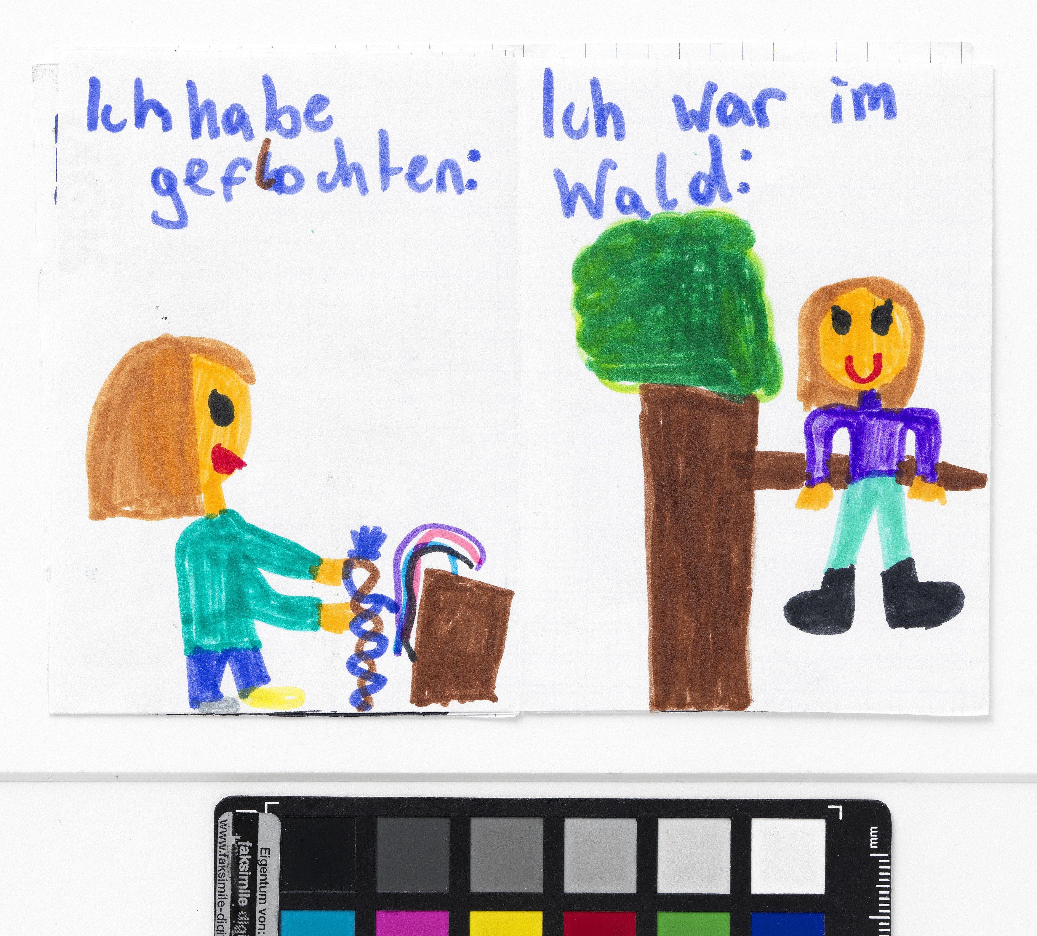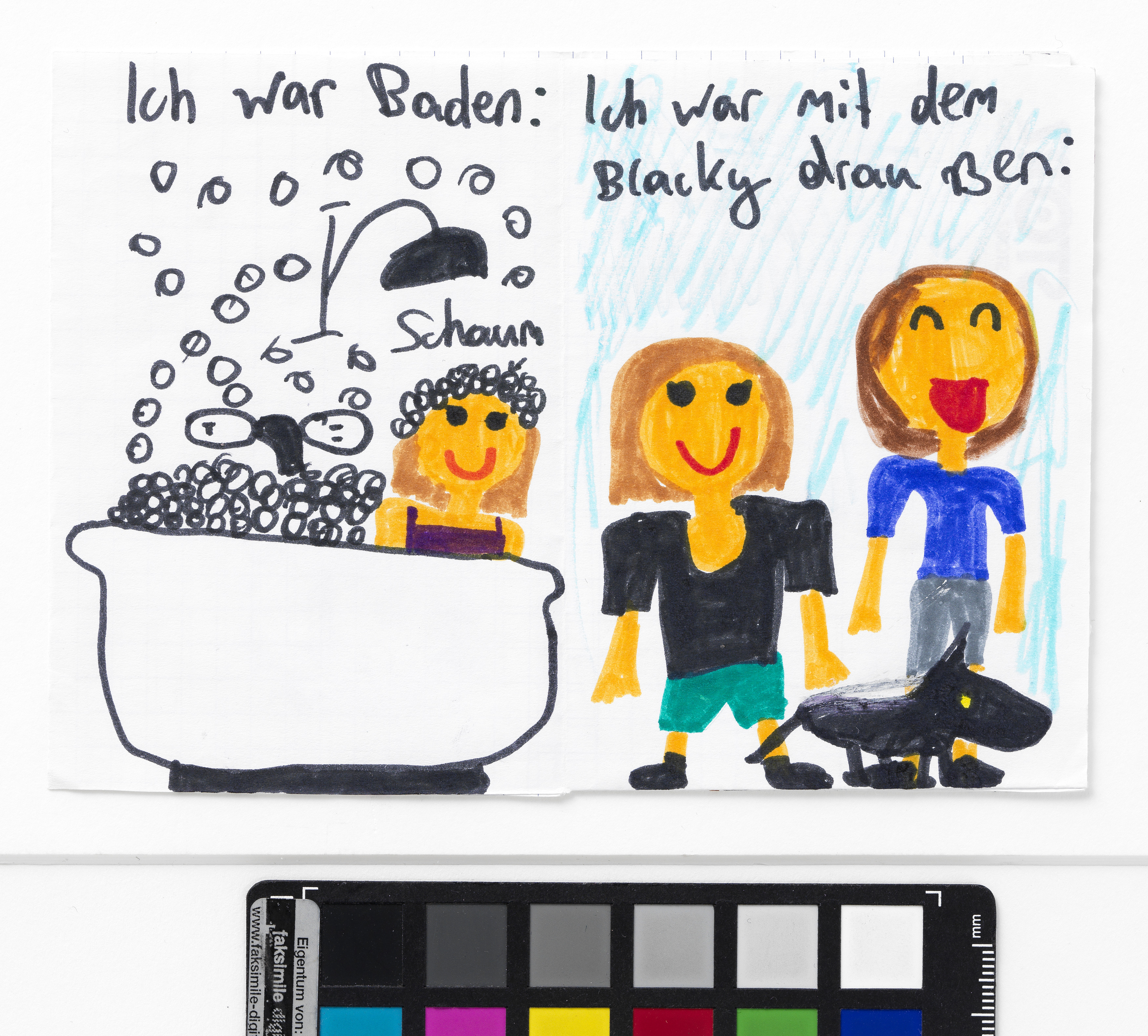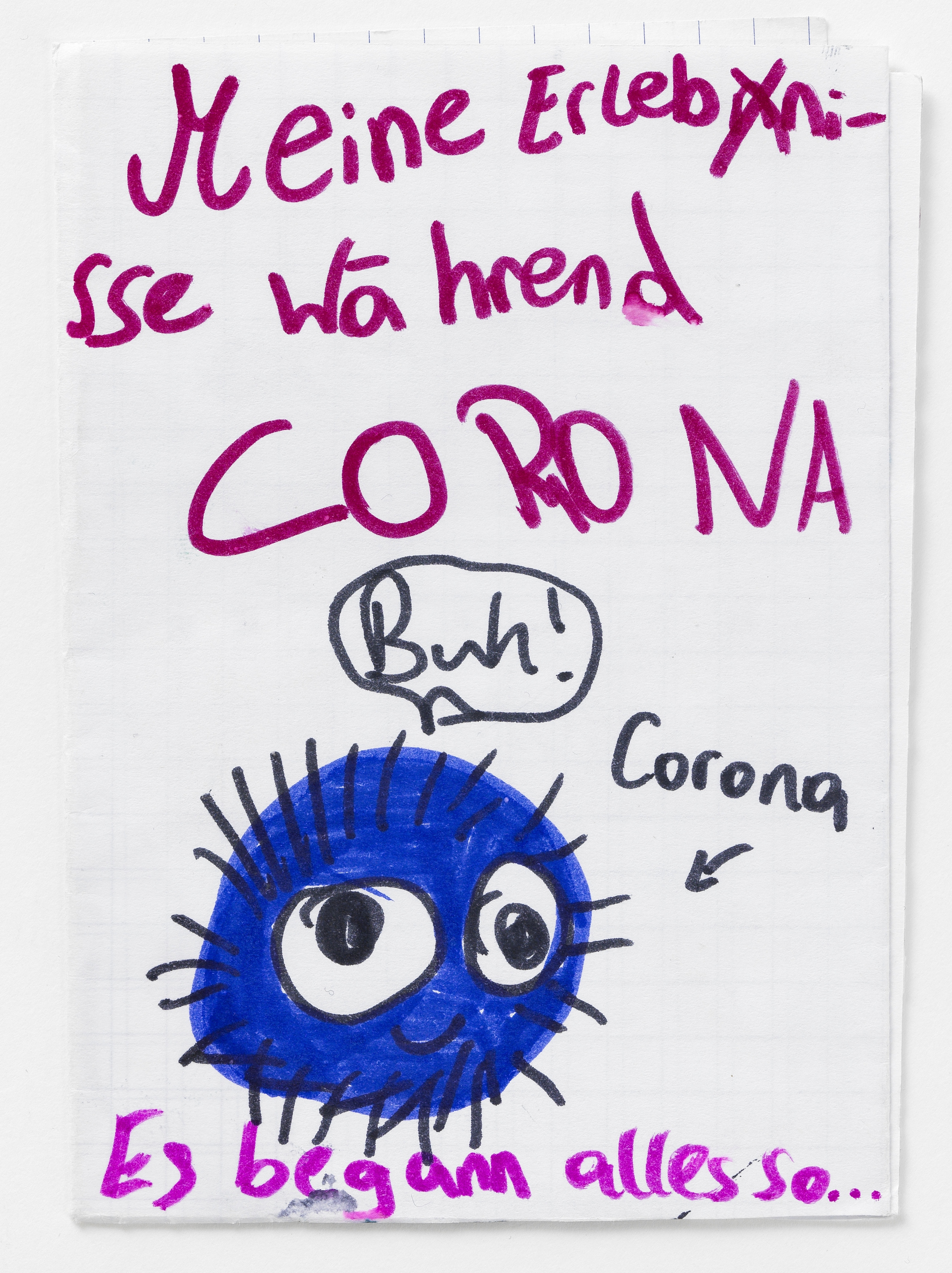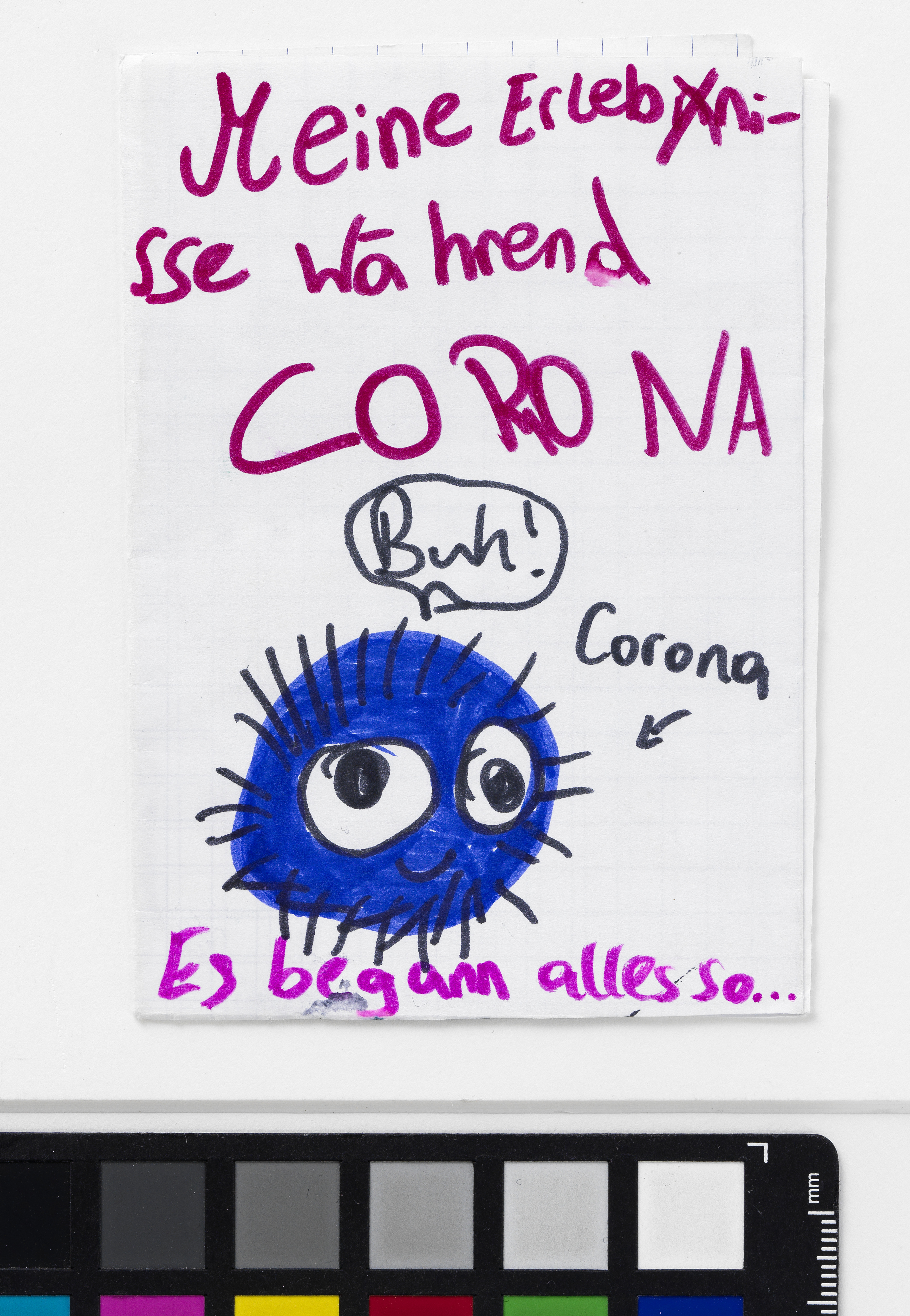 „Meine Erlebnisse während Corona – es begann alles so…“ ist eines von vier Bildheften über die Zeit des ersten Corona-Lockdowns im Frühjahr 2020, die die neunjährige Katerina Stavrou anfertigte, um die Corona-Krise bildlich zu dokumentieren. Sie wurde dazu von einer Home Schooling-Aufgabe, die ihre Schwester Sofia erhalten hatte (vgl. I.N. 310.248/1-3), inspiriert. Katerina Stavrou setzt sich in dieser mehrteiligen Geschichte mit ihrem veränderten Alltag während des ersten Lockdowns auseinander und gibt dabei auch dem Virus selbst ein Gesicht. „Die Bildgeschichte von Katerina hat selbstverständlich ein Happy End – was wir uns alle jetzt wünschen“, schrieb Oksana Stavrou, Katerinas Mutter, in einem E-Mail an das Wien Museum am 31. März 2020.