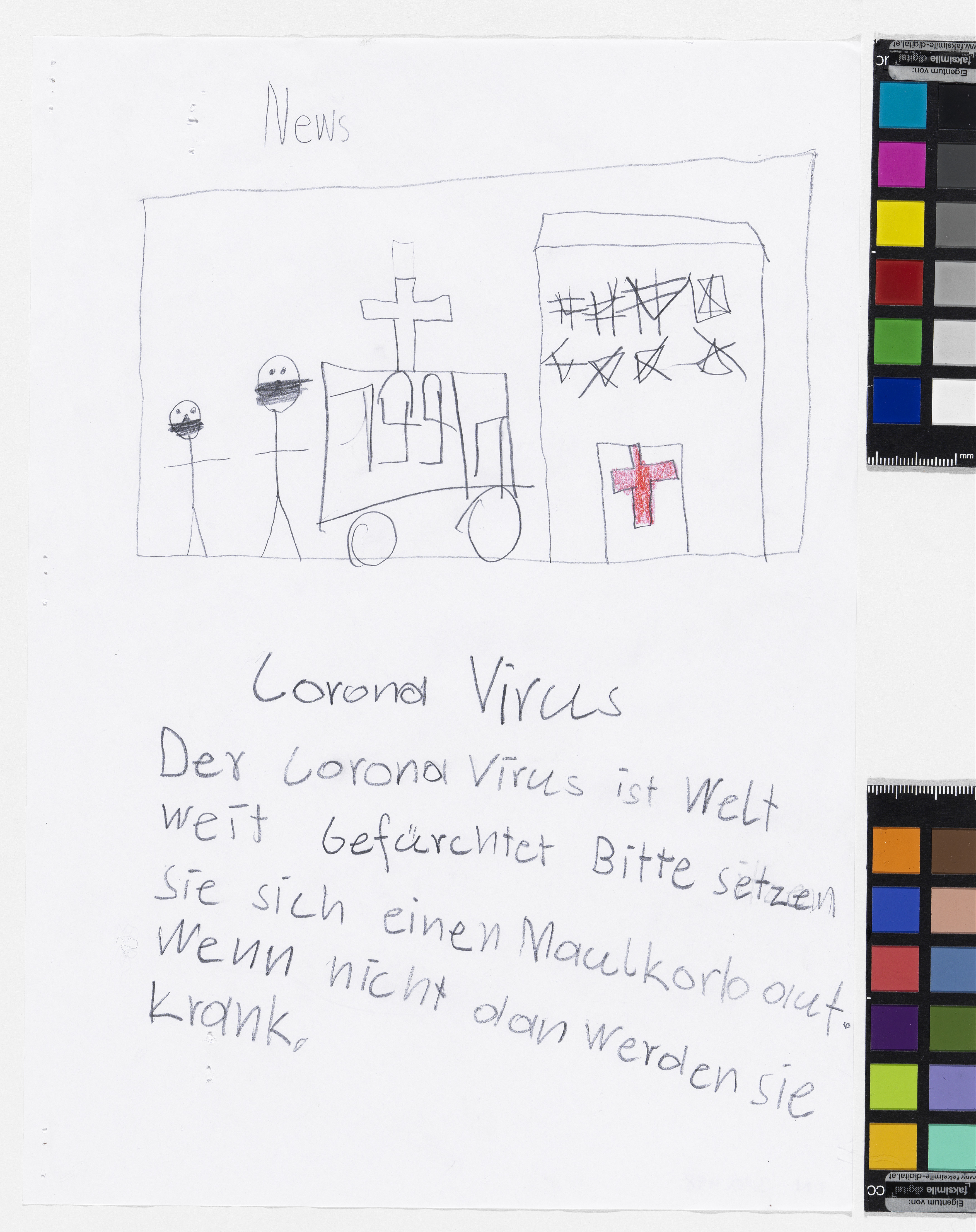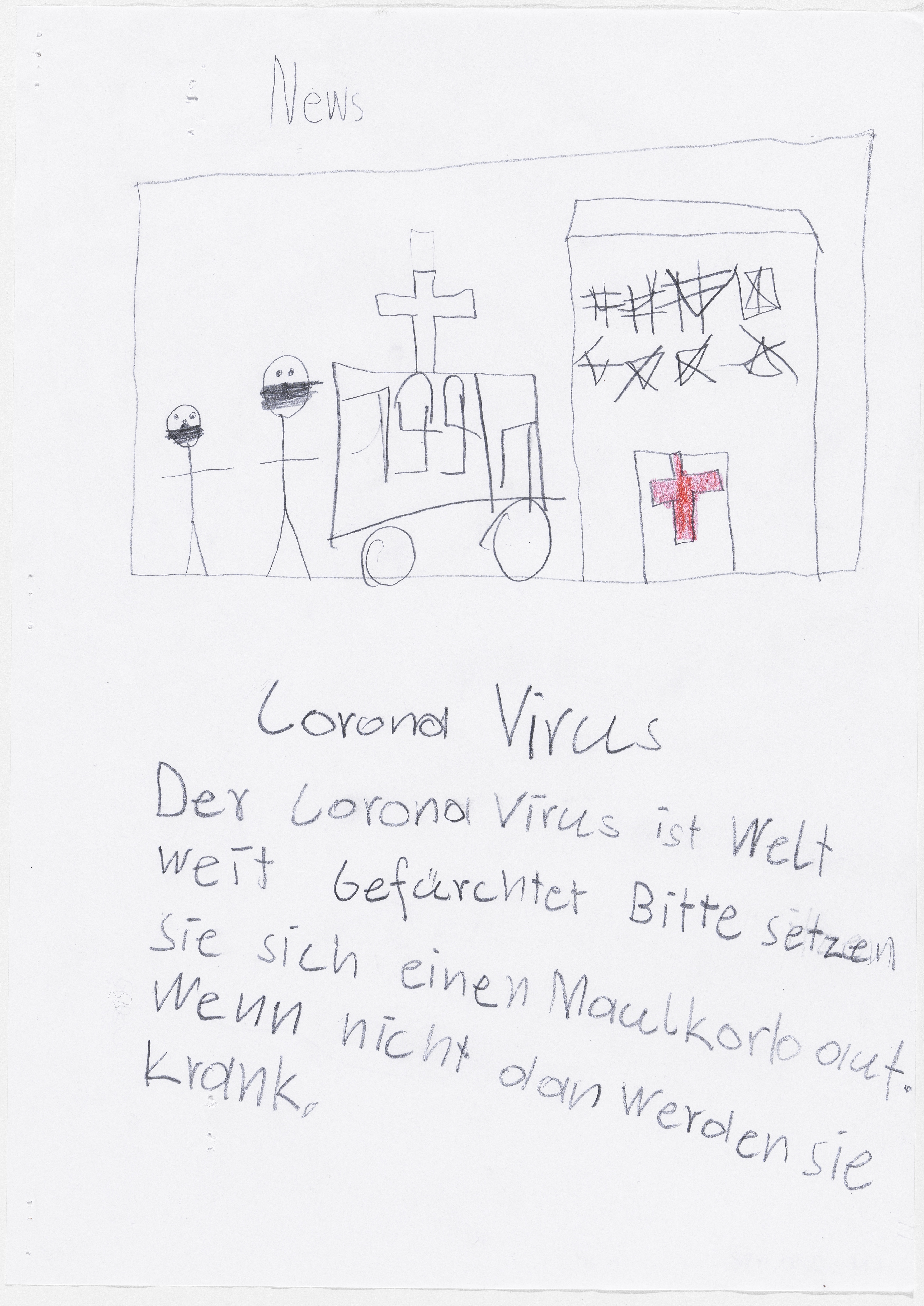 Zeichnung mit Kurztext (“Corona Virus / Der Corona Virus ist Welt weit befürchtet. Bitte setzen Sie sich einen Maulkorb auf. Wenn nicht dan werden sie krank.”; Schreibfehler im Original), gezeichnet und verfasst vom achtjährigen Janusch U. während des ersten Corona-Lockdowns im Frühjahr 2020, für eine gemeinsam mit Schulfreund*innen gebastelte Schülerzeitung. Text und Zeichnung setzen sich mit der Bedrohung durch das Virus und mit Mund-Nasen-Schutzmasken als Form des Übertragungsschutzes auseinander.