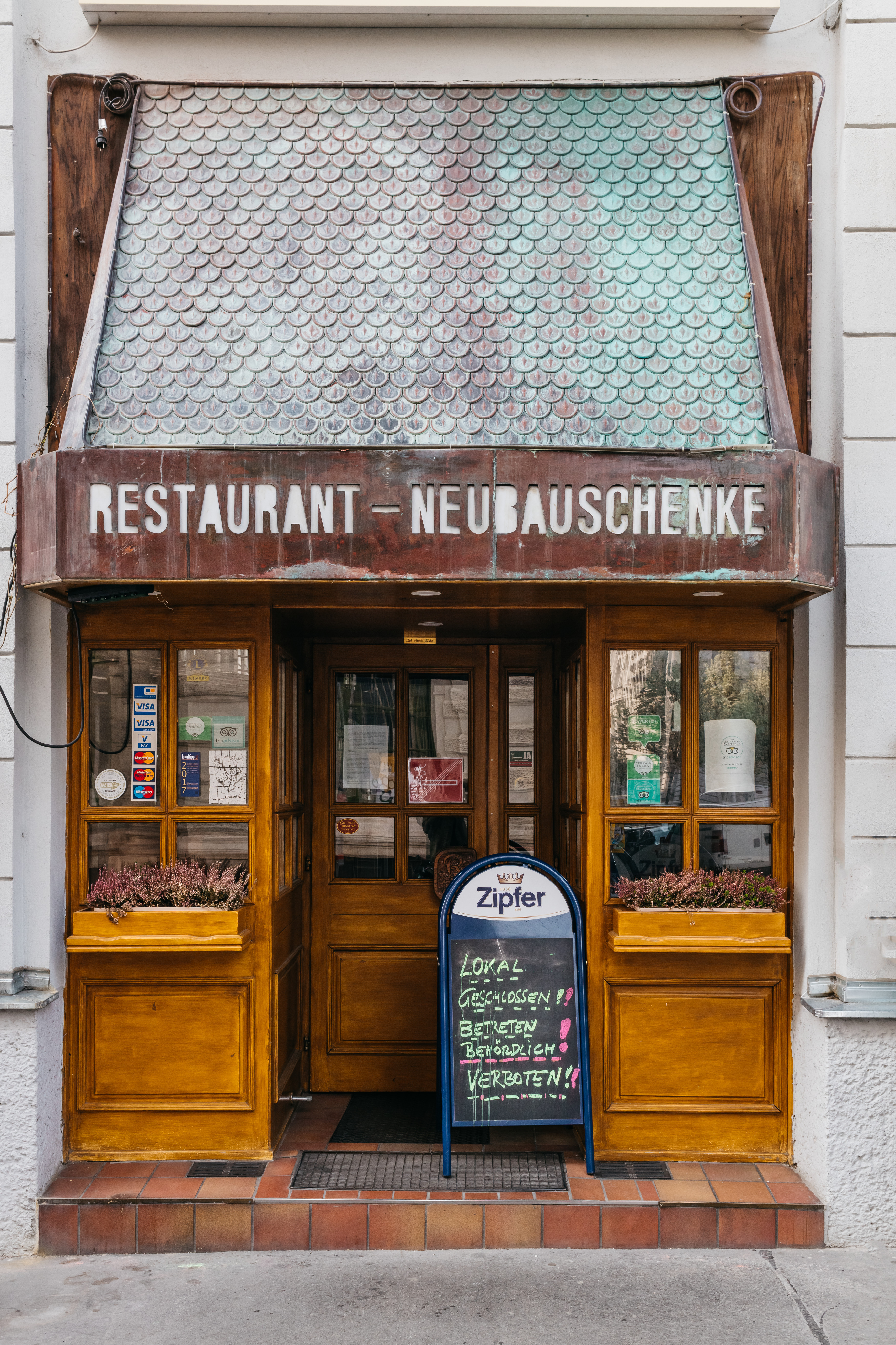 "Wien im Zeichen des Corona-Virus": Tafel mit Kreidebotschaft "Lokal geschlossen!! Betreten behördlich! verboten!!" vor dem "Restaurant Neubauschenke" (7., Zieglergasse 25)