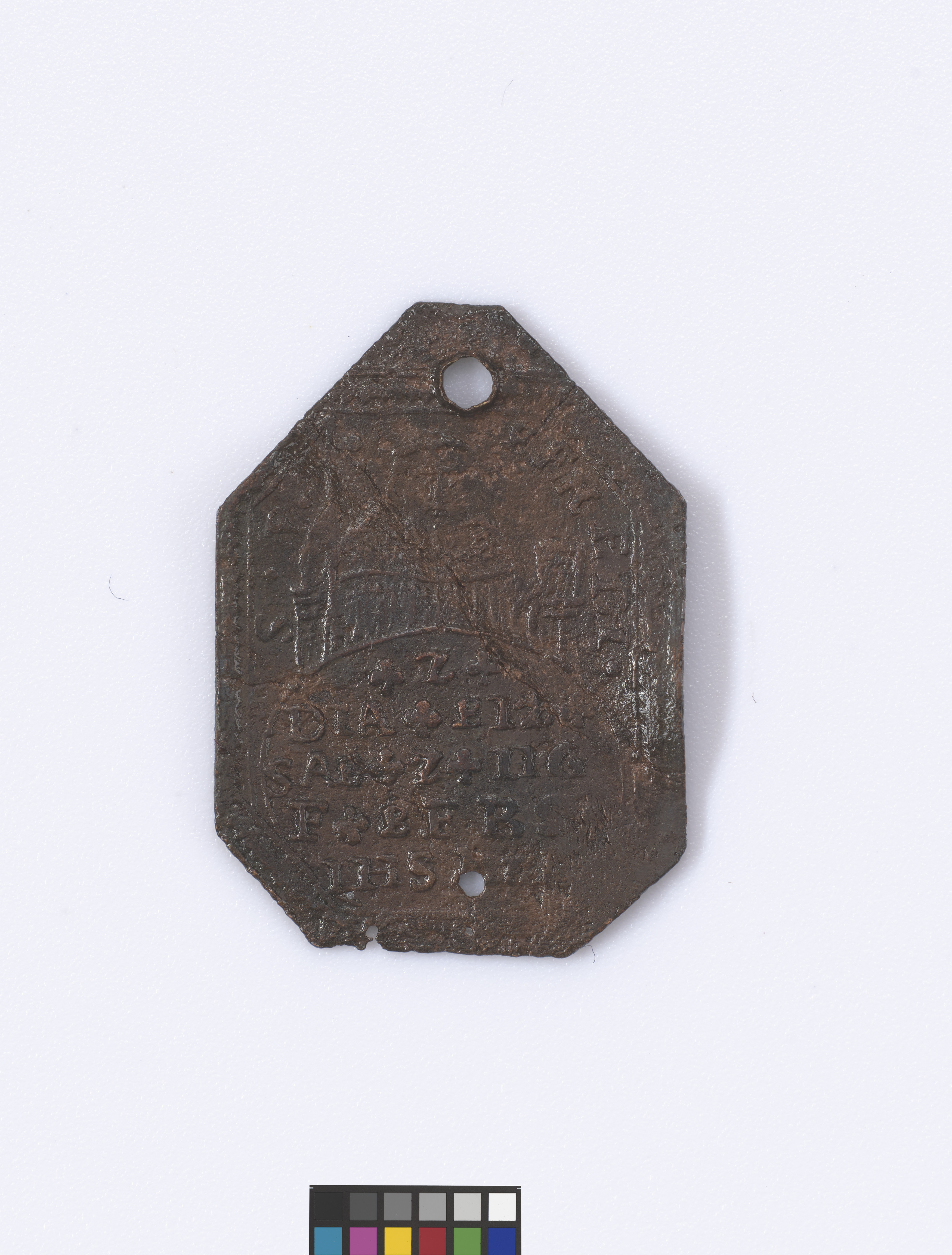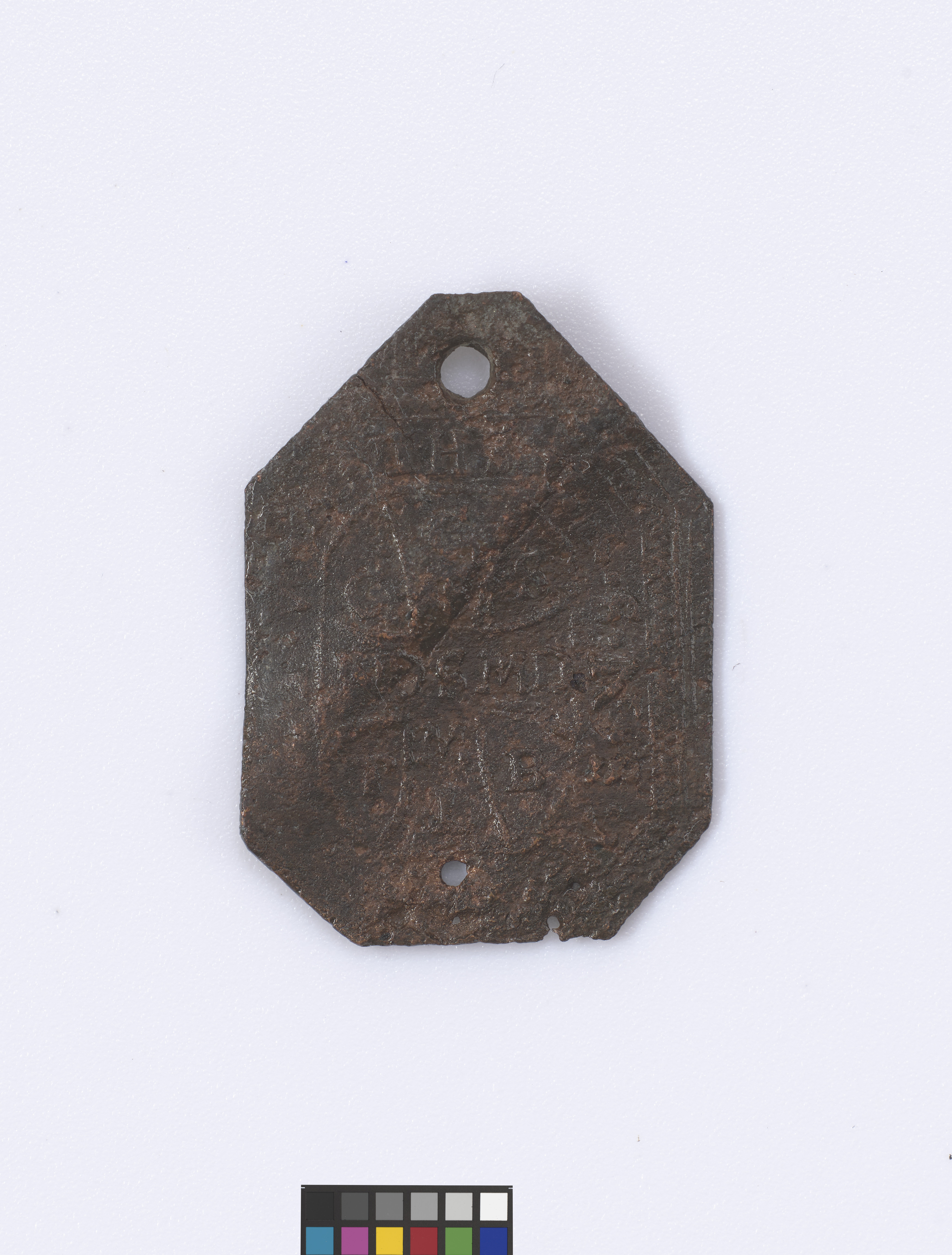 Öse am oberen und unteren Ende. Auf der Vorderseite in der oberen Hälfte des Bildfeldes nicht näher identifizierbare Darstellung, darunter flachovaler Schild mit dem Zachariassegen + Z + DIA + BIZ + SAB + Z + HGF + BFRS und dem Nomen sacrum IHS.