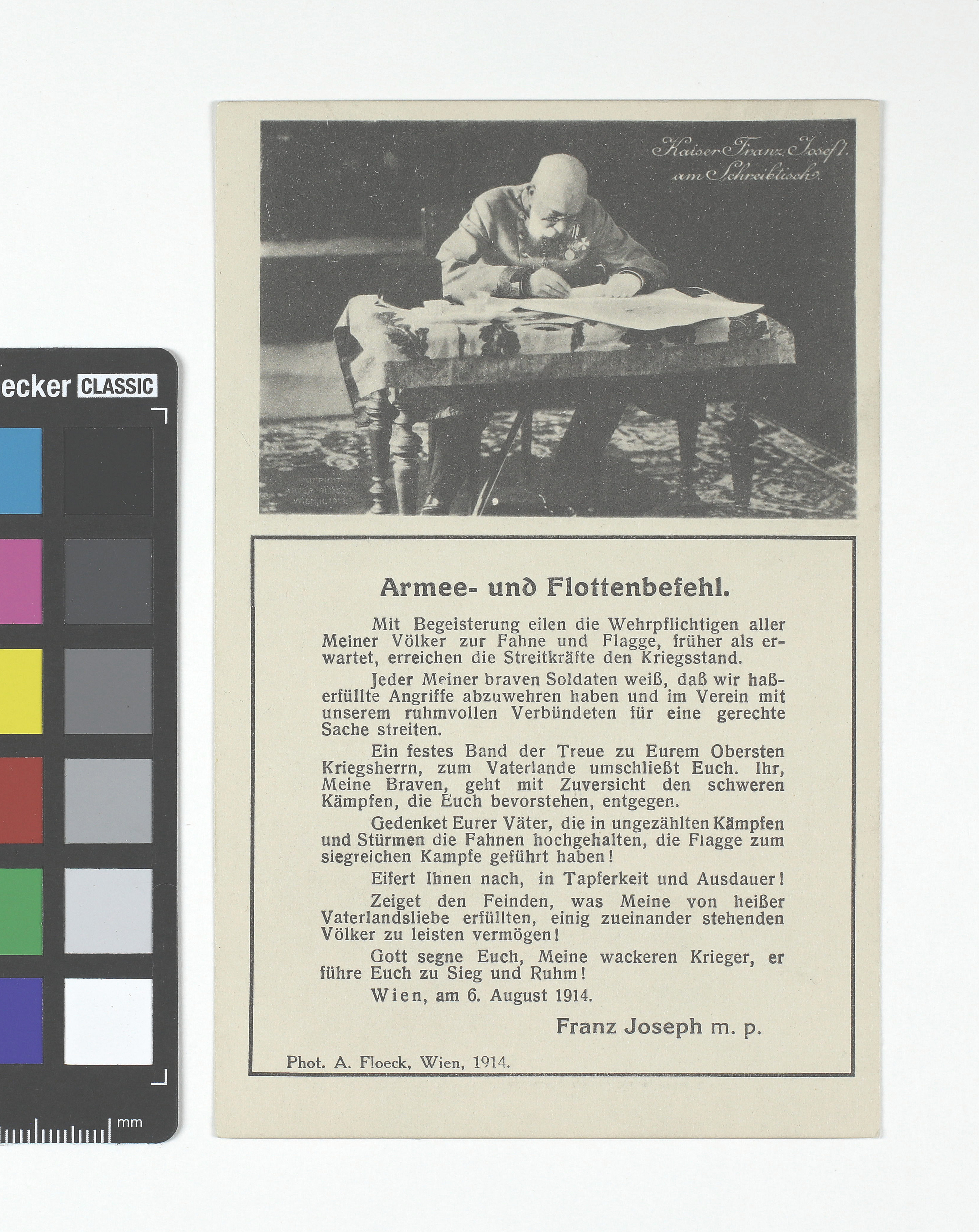 Kriegspostkarte: "Armee- und Flottenbefehl." Kaiser Franz Josef I. am Schreibtisch