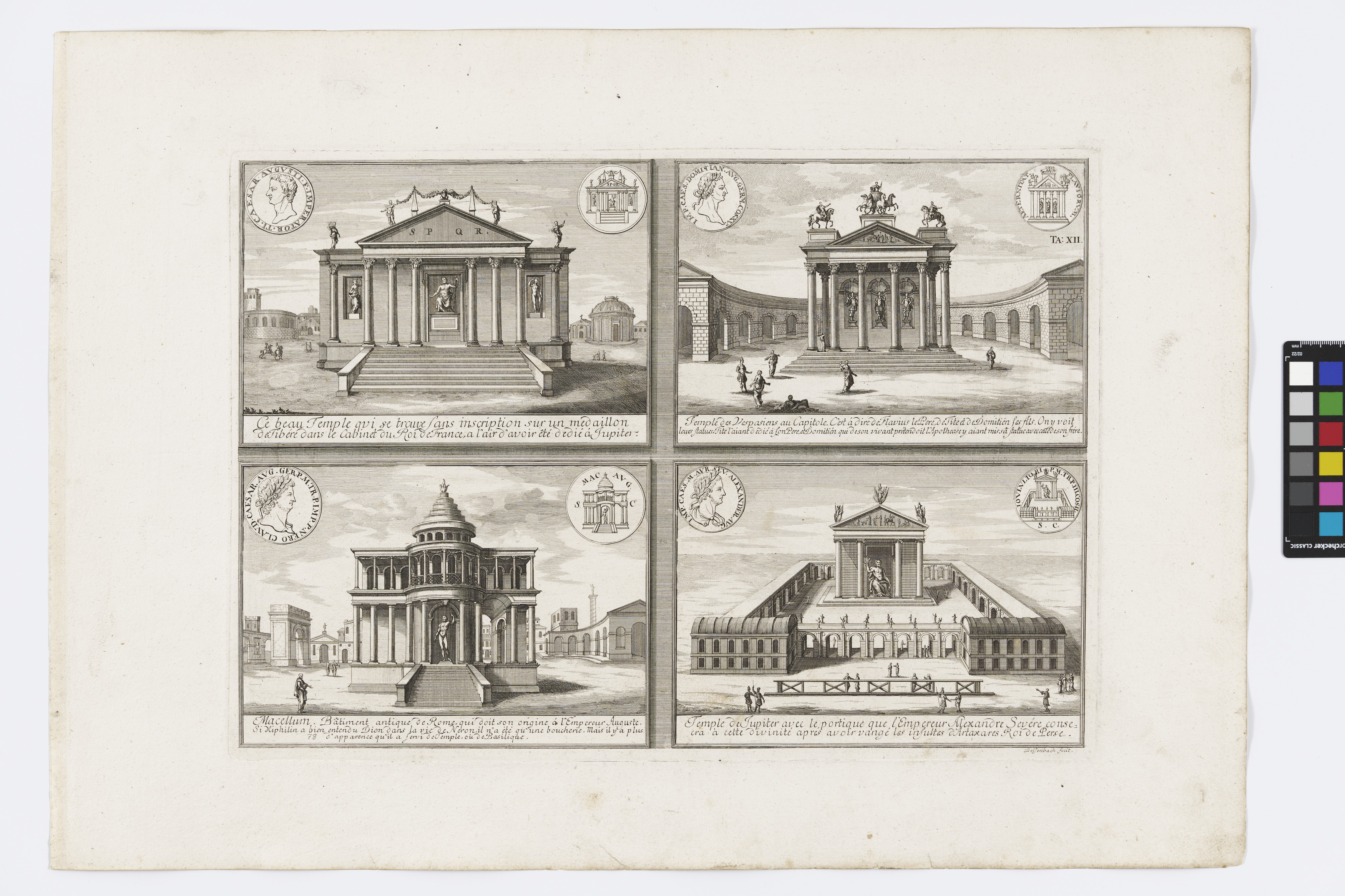 - Ce beau Temple qvi se trouve sans inscription sur un medaillon de Tibére dans le Cabinet du Roi de France, a l´air d´avoir êté dedié á Jupiter. / Temple des Vespasiens au Capitole. C´est á dire de Flavius le Pere, de Tite et de Domitién les fils. On y voit leurs Statues; Tite l´aiant dedié a son Pere, et Domitién qui de son vivant prétendoit l´Apothease y aiant mis sa Statue avec cette de son frére. / Macellum. Bâtiment antique de Rome, qui doit son origine á l´Empereur Auguste. Si Xiphilin a bien entendu Dion dans la vie de Neron il n´a été qu´une boucherie. Mais il y a plus d´apparence qu´il a servi de Temple, où de Basilique. / Temple de Jupiter avec le portique que l´Empereur Alexandre Sevére consecra à cette divinité aprés avoir vangé les infuites d´Artaxares Roi de Perse.