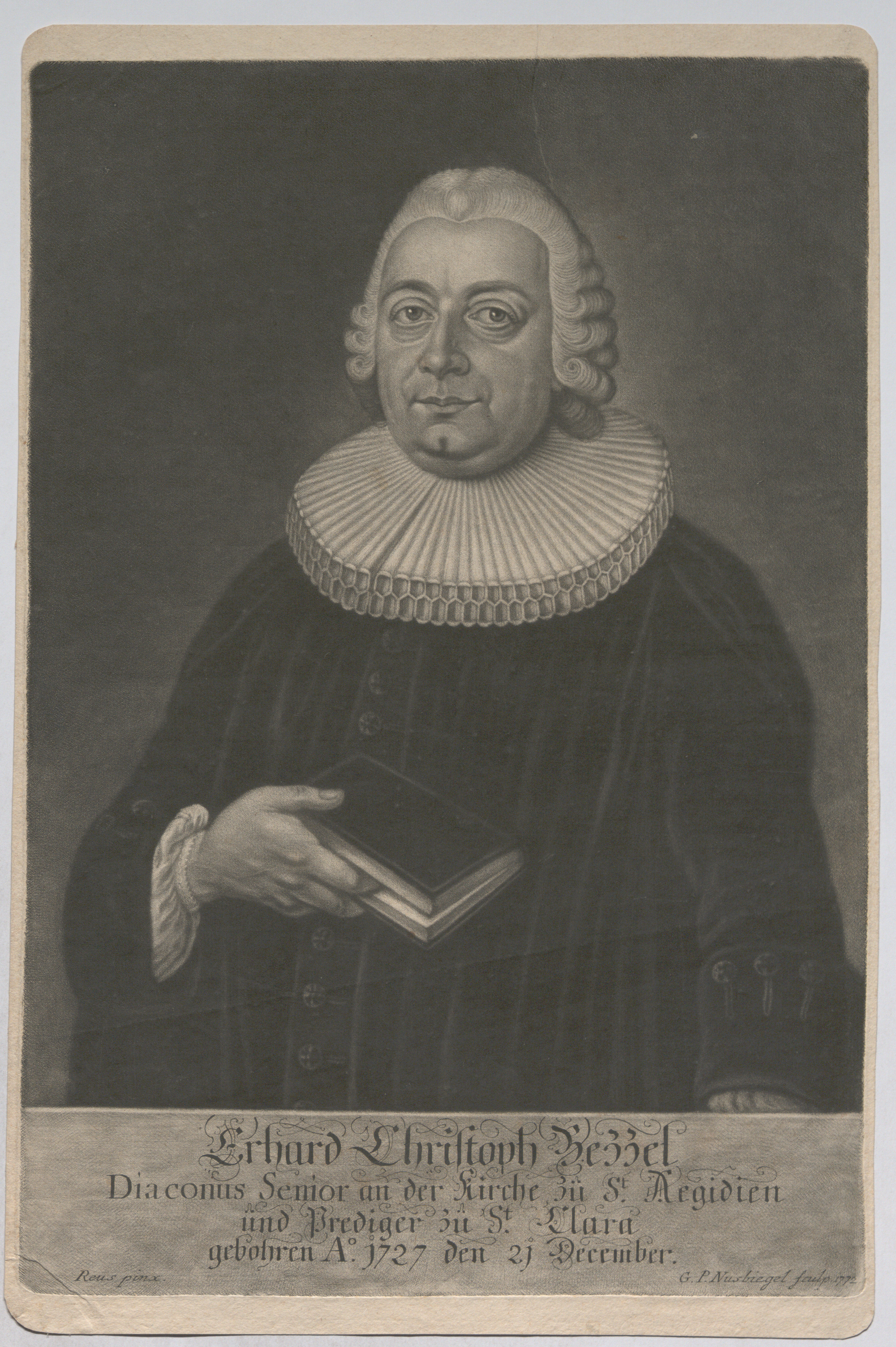 "Erhard Christoph Bezzel; Diaconus Senior an der Kirche zu St. Aegiden und Prediger zu St. Clara, gebohren Ao. 1727 den 21 December."