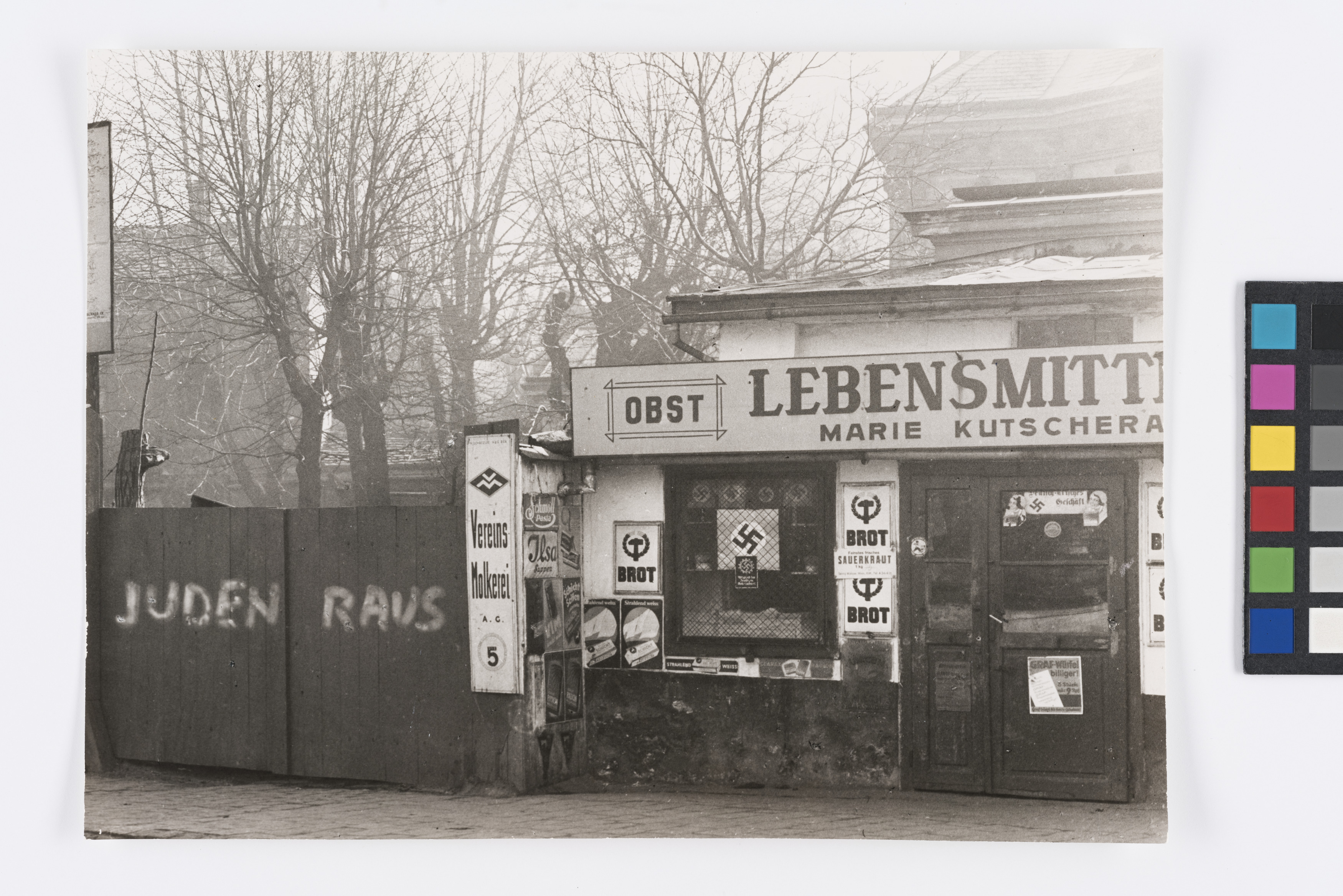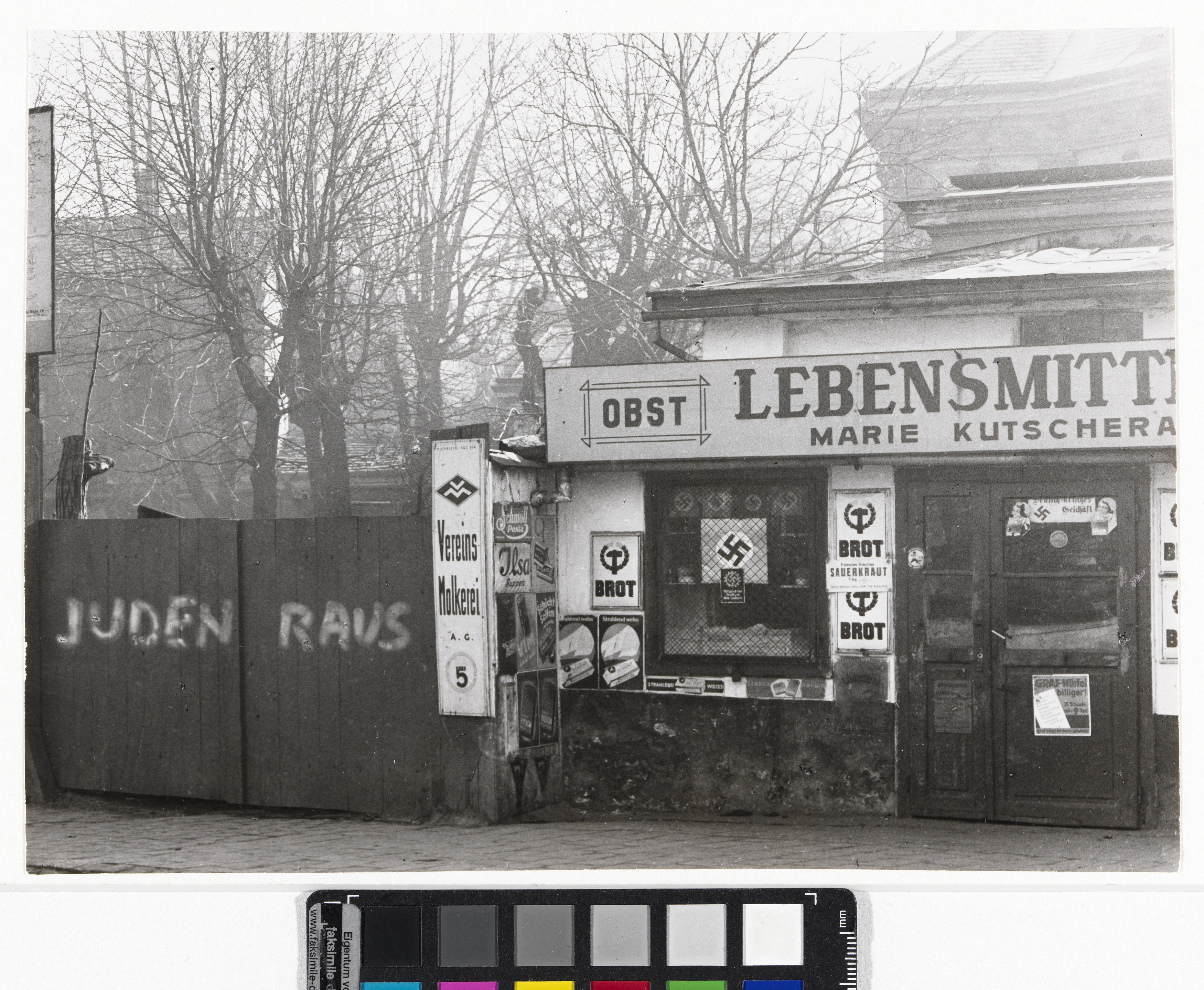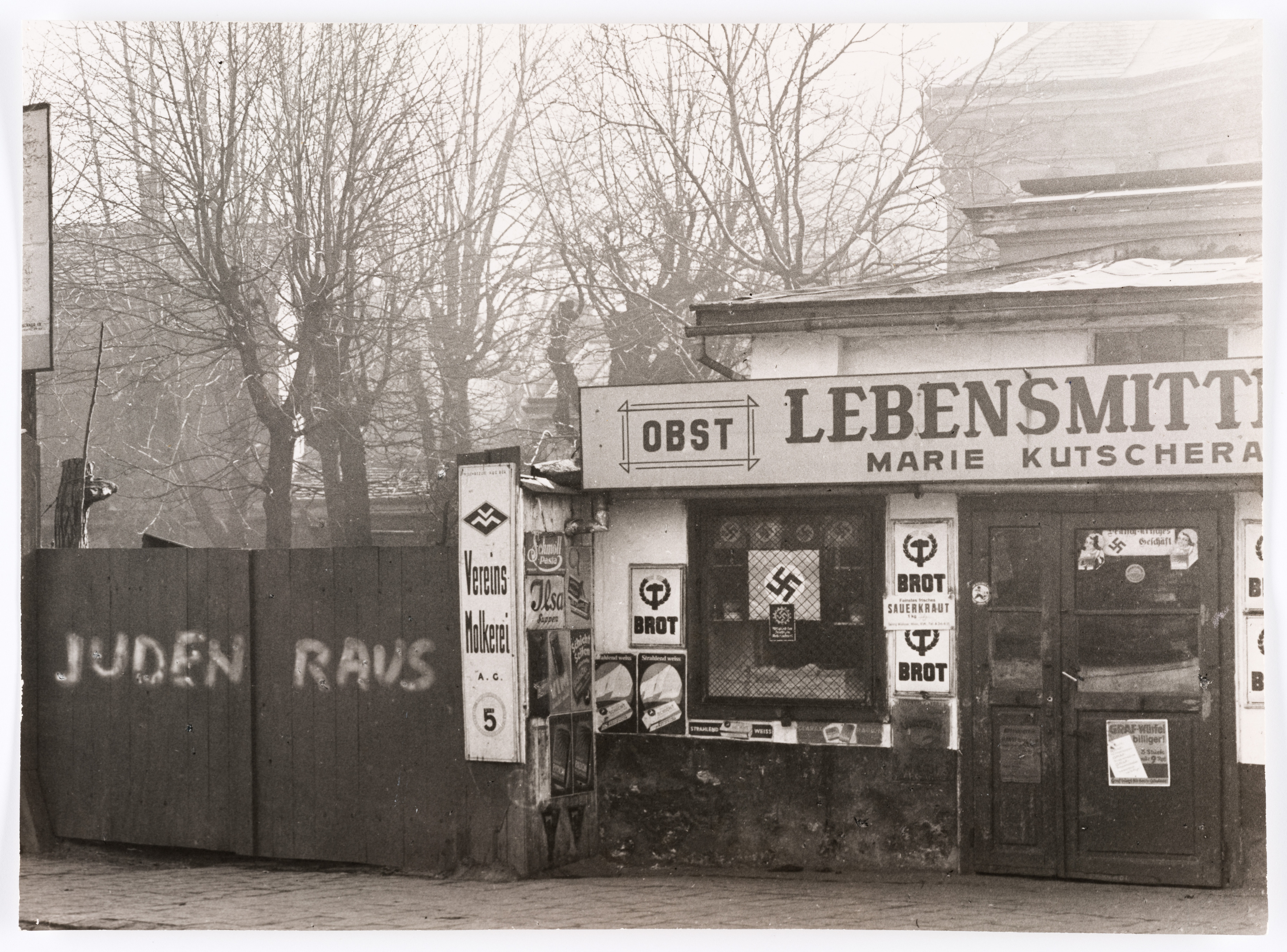 "Arisches" Lebensmittelgeschäft mit Hakenkreuzen und eine "Juden Raus"-Parole in 19., Billrothstraße