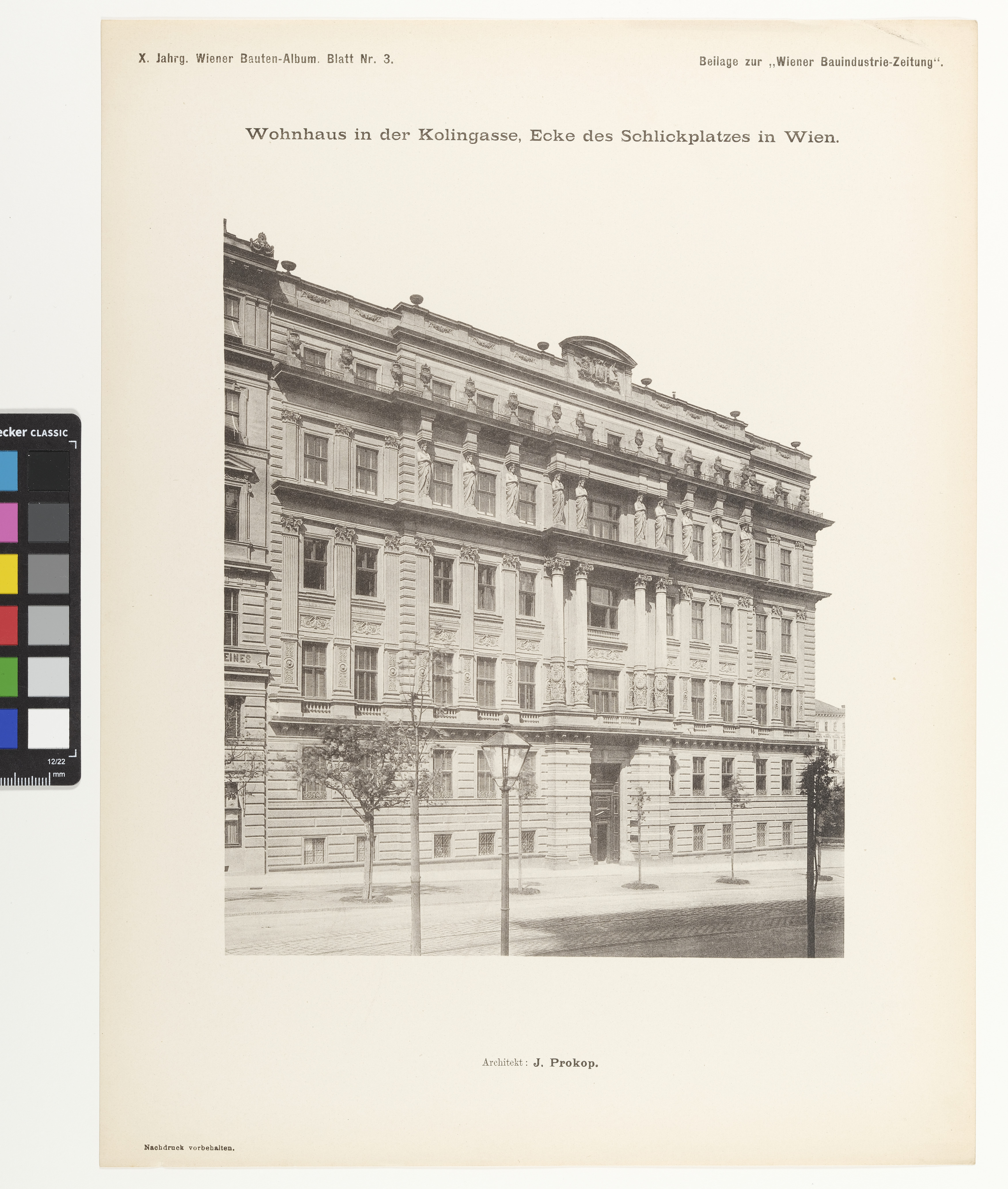 - X. Jahrg. Wiener Bauten-Album. Blatt Nr. 3. Beilage zur “Wiener Bauindustrie-Zeitung.” / Wohnhaus in der Kolingasse, Ecke des Schlickplatzes in Wien. / Architekt: J. Prokop. / Nachdruck vorbehalten.