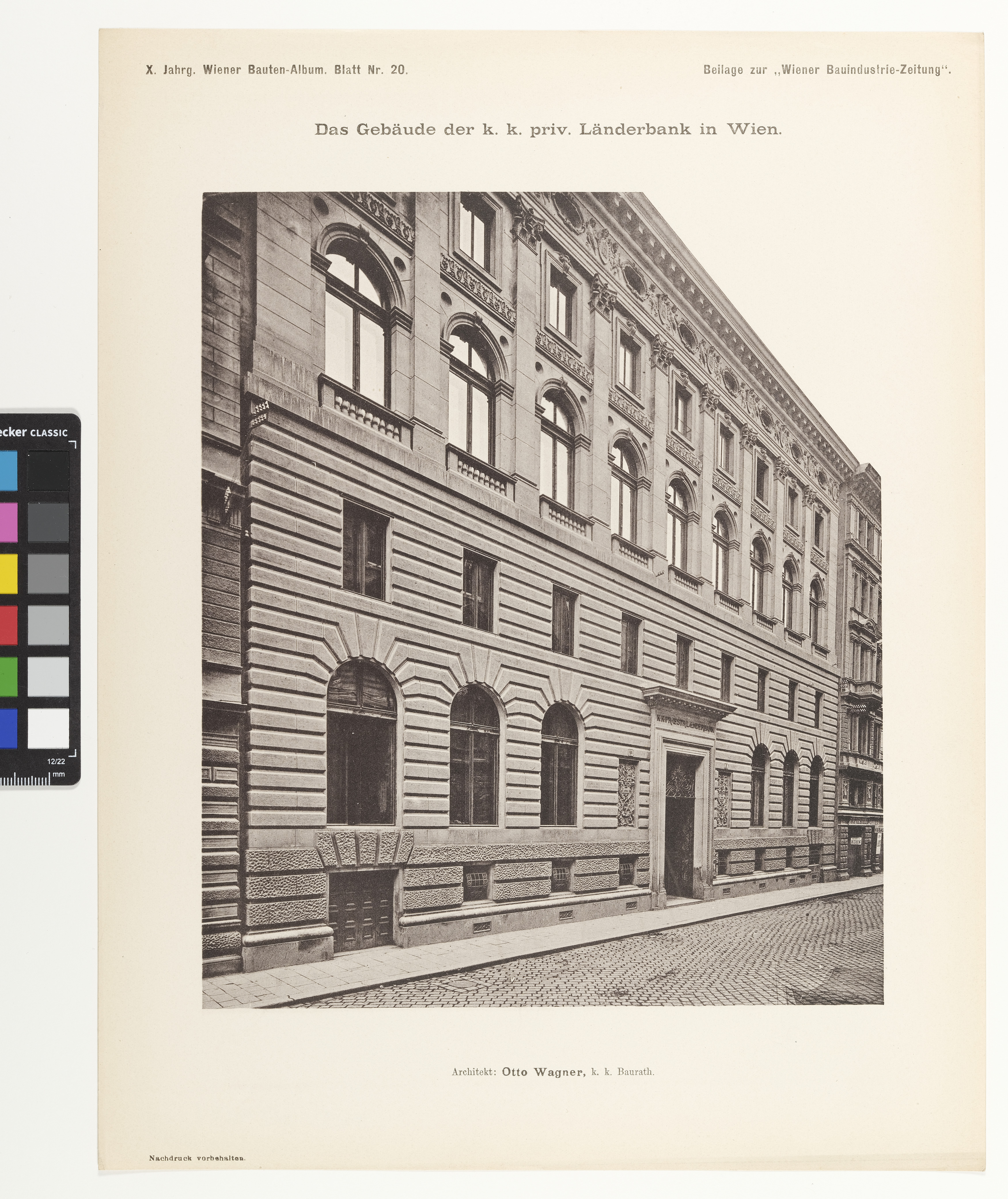 - X. Jahrg. Wiener Bauten-Album. Blatt Nr. 20. Beilage zur “Wiener Bauindustrie-Zeitung.” / Das Gebäude der k. k. priv. Länderbank in Wien. / Architekt: Otto Wagner, k. k. Baurath. / Nachdruck vorbehalten.