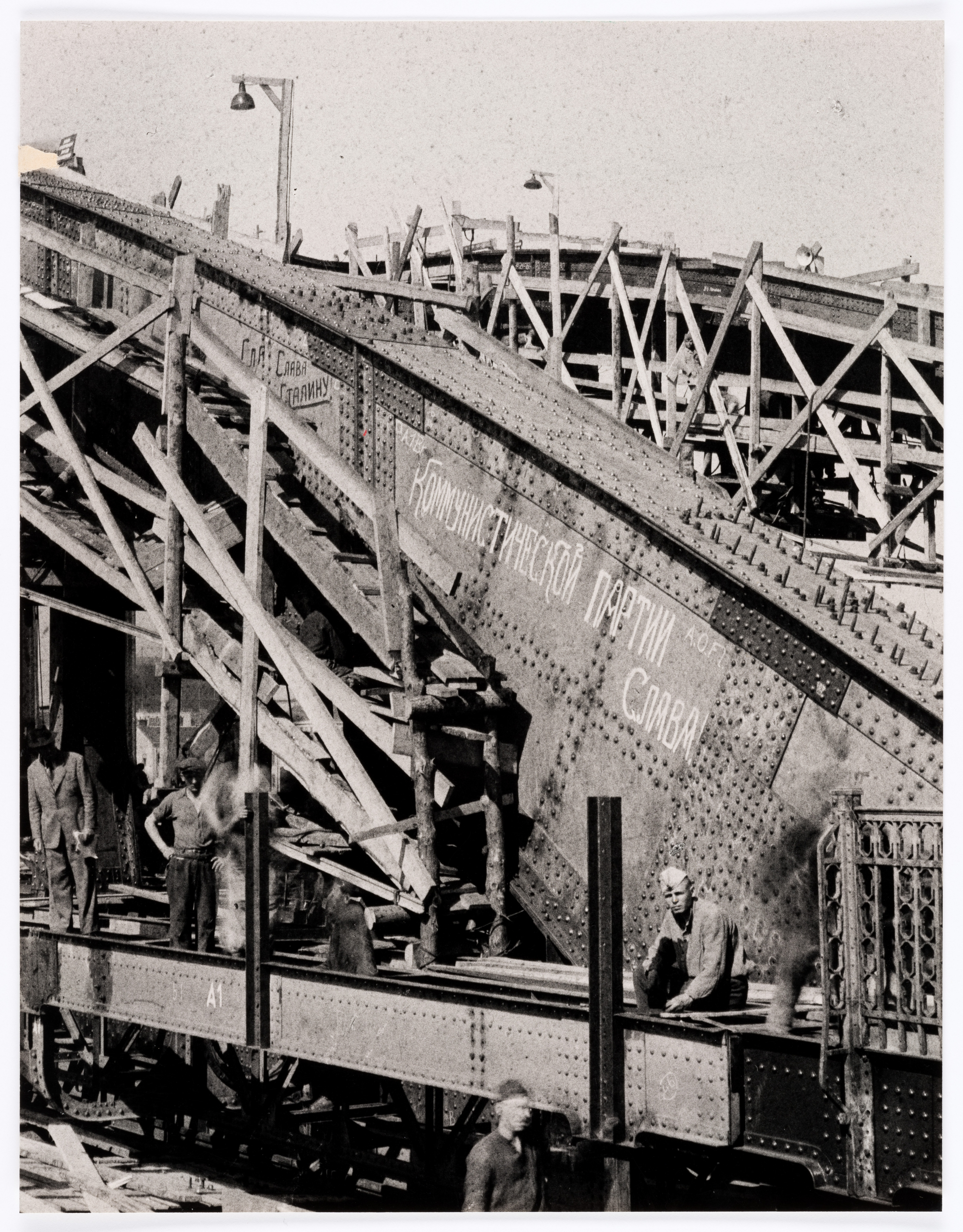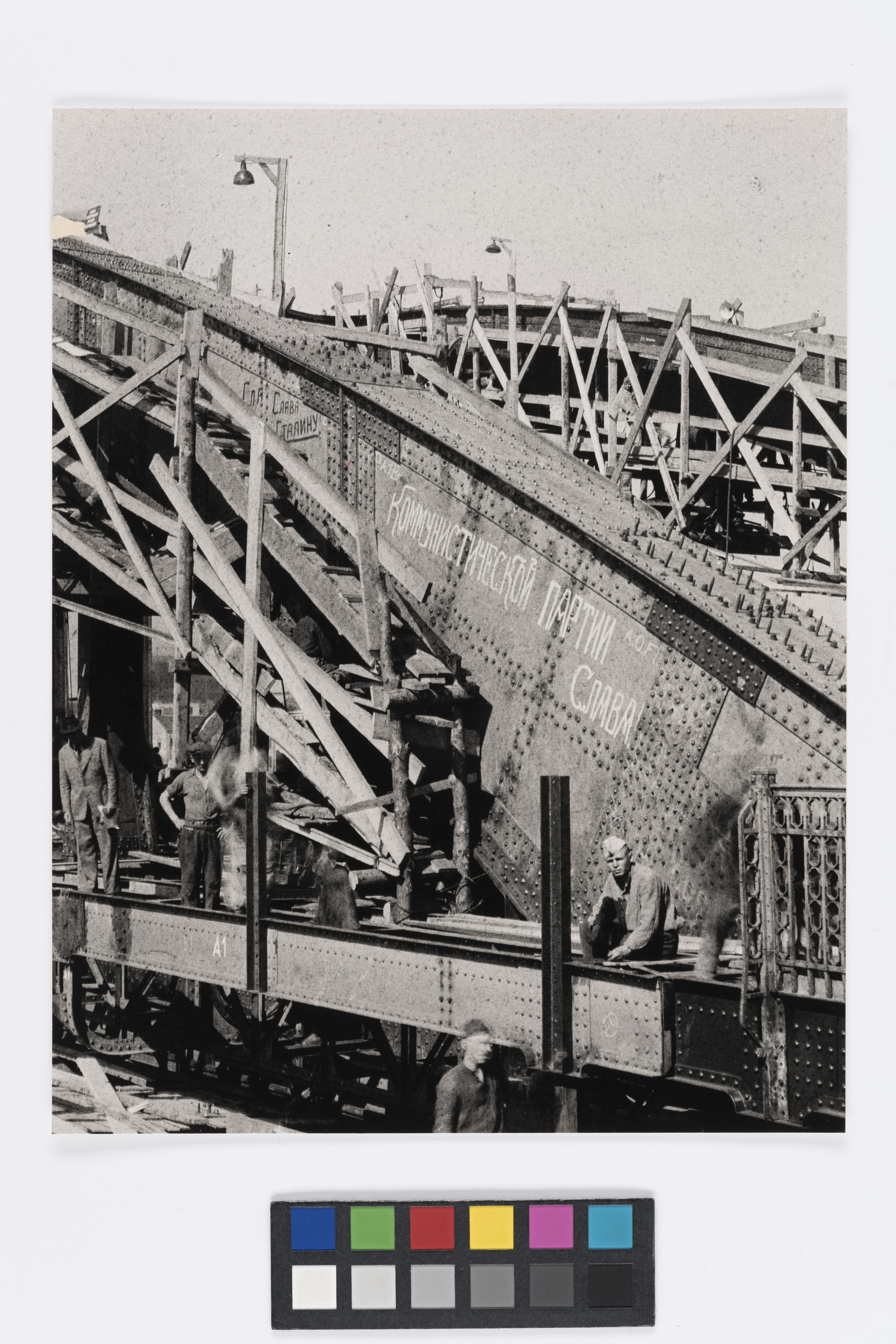 - Arbeiter beim Bau der Floridsdorfer-Brücke: Holz- und Eisenkonstruktionen: russische Aufschriften