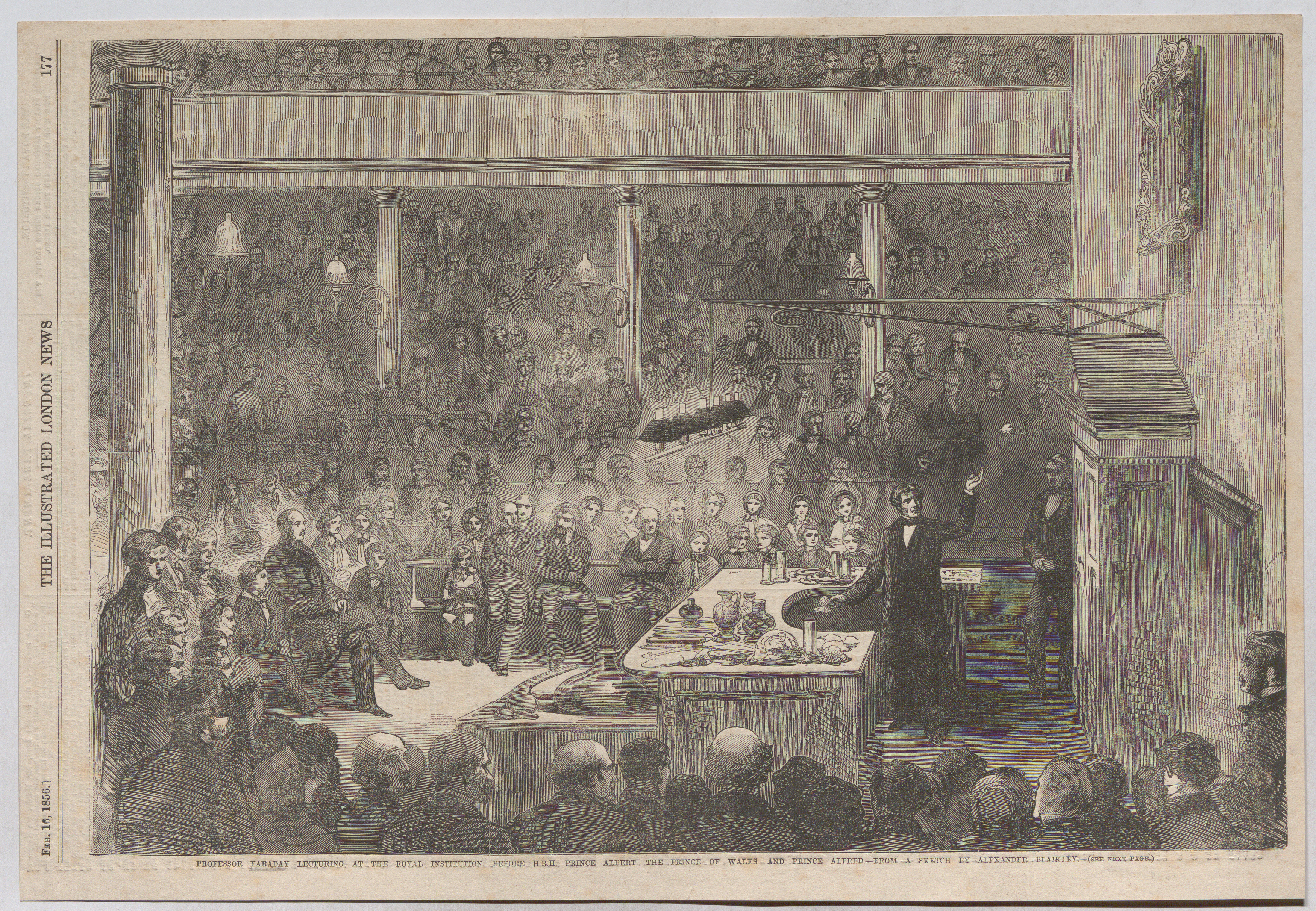 - Michael Faraday hält vor Prinz Albert, dem Prinzen of Wales, und Prinz Alfred einen Vortrag in der Royal Institution (aus "The Illustrated London News")