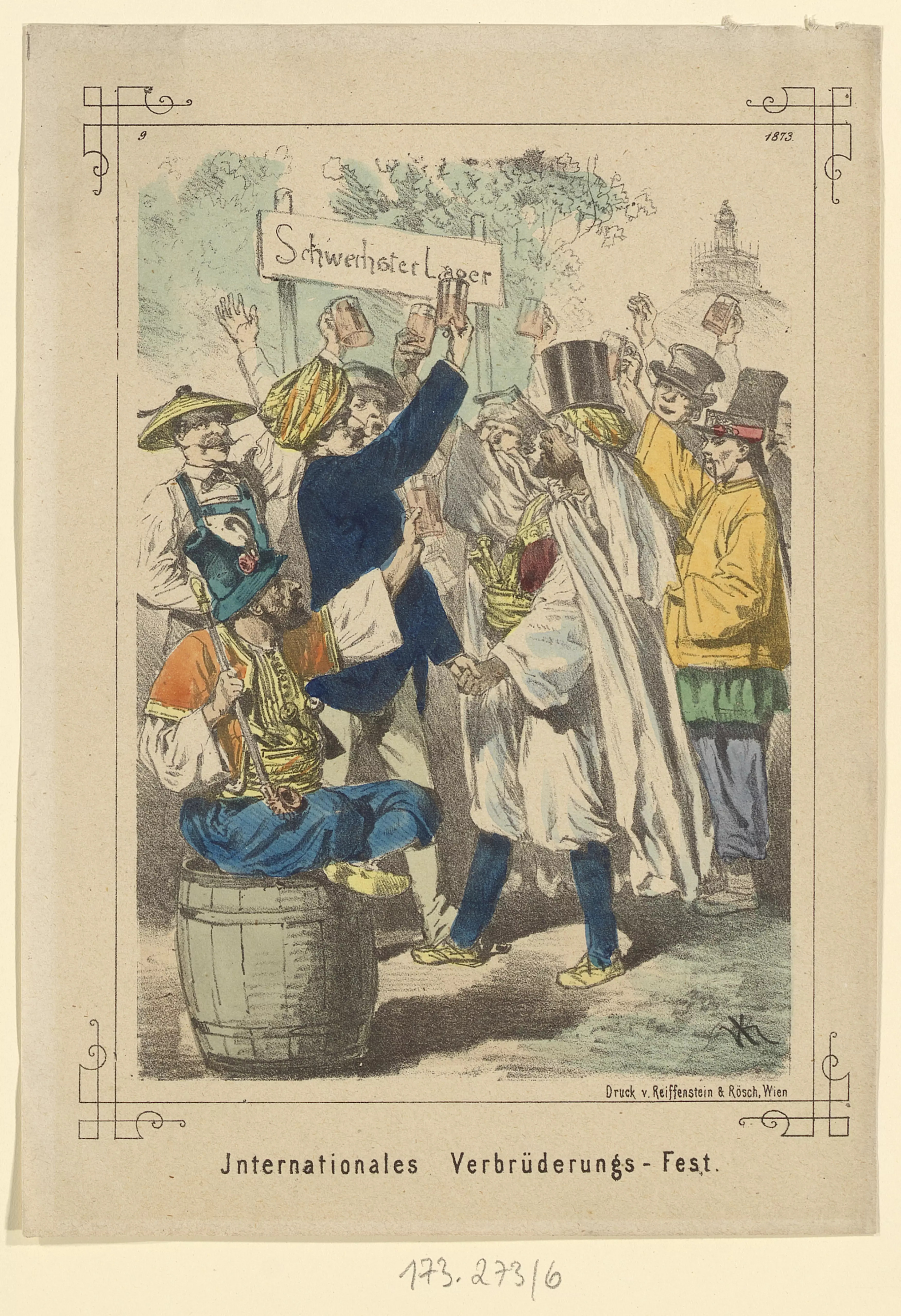 "Internationales Verbrüderungsfest" (Karikatur zur Wiener Weltausstellung, Bildbeilage zu "Hans Jörgel")