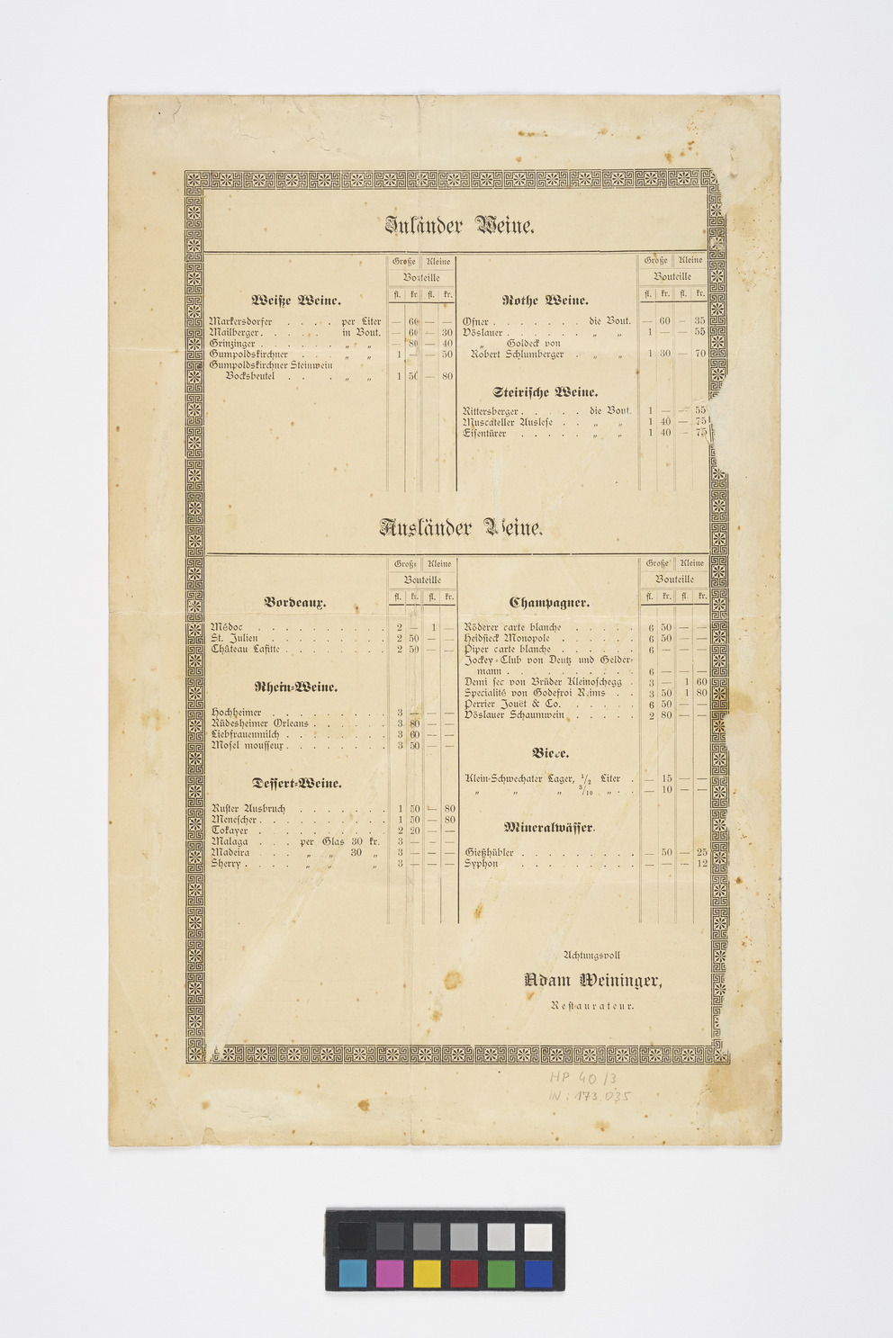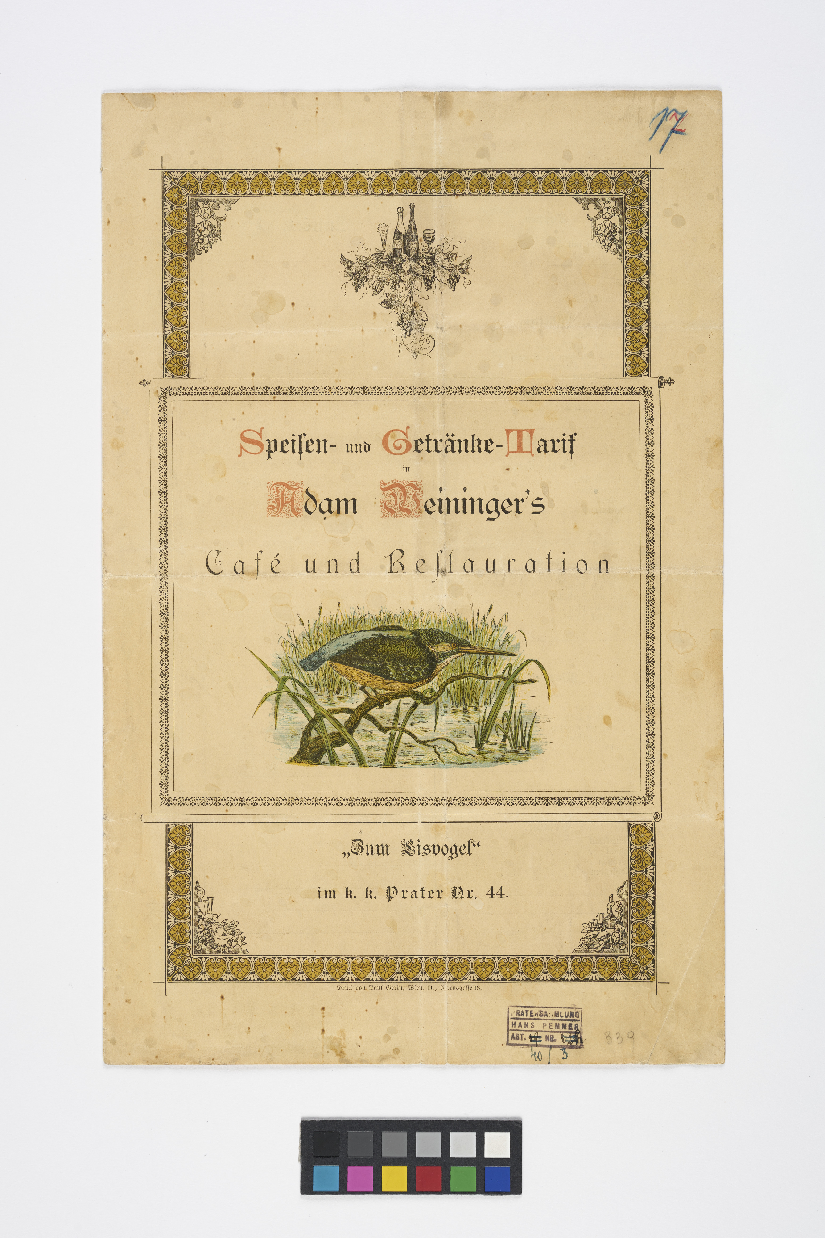 - "Speisen- und Getränke-Tarif/ in/ Adam Weininger's/ Café und Restauration/ <Zum Eisvogel>/ im k.k. Prater Nr. 44."