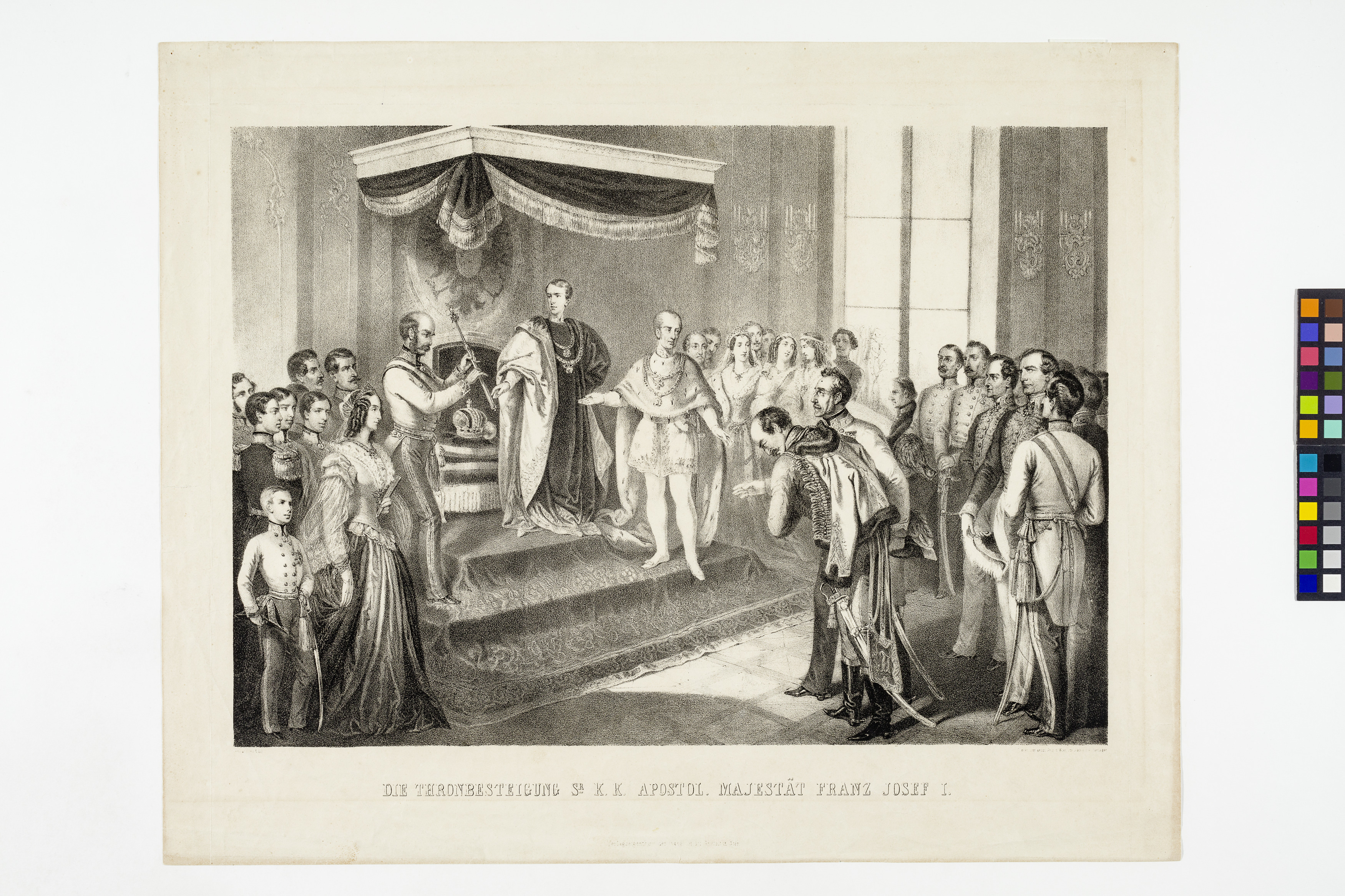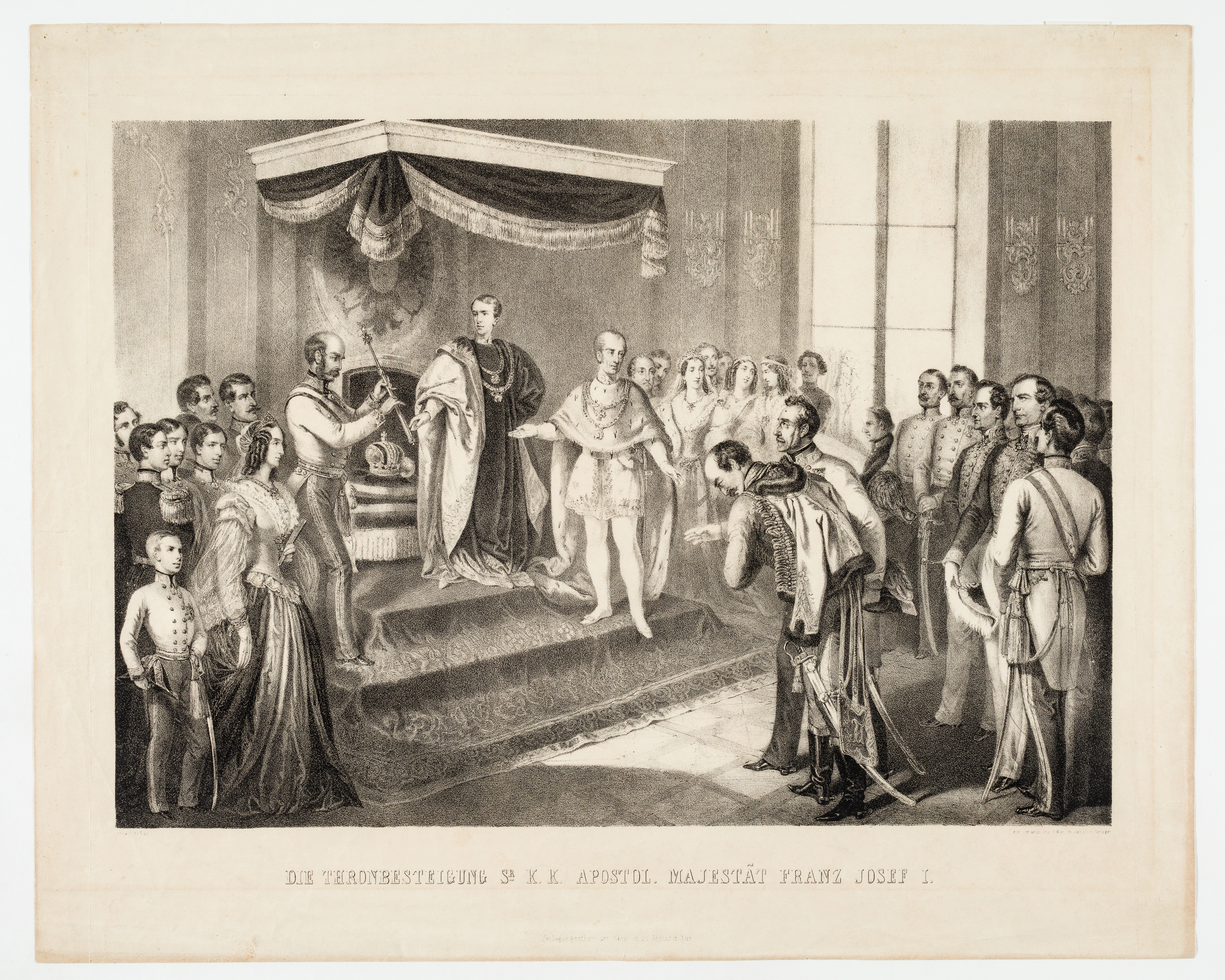 "DIE THRONBESTEIGUNG SR K. K. APOSTOL. MAJESTÄT FRANZ JOSEF I." (am 2. Dezember 1848) (unter den Dargestellen Erzherzog Franz Karl, Erzherzogin Sophie, Jelačić und Windischgrätz)