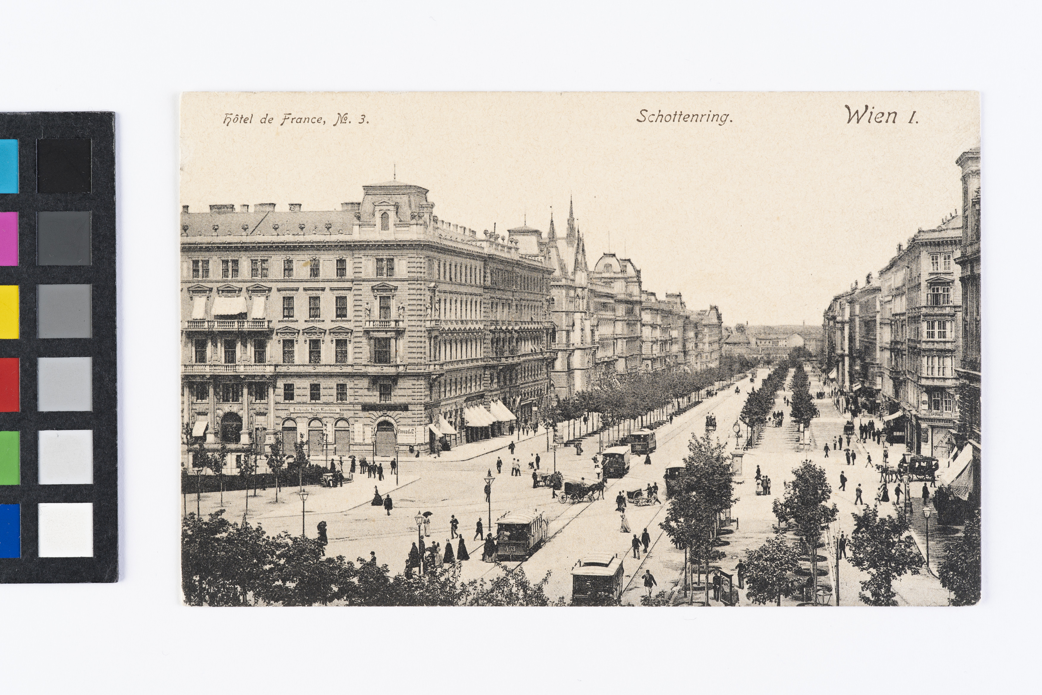 1., Schottenring / Universitätsring / Schottengasse - Blick von Höhe Ephrussipalais über die Schottenkreuzung entlang der Ringstraße in Richtung Donaukanal, Ansichtskarte