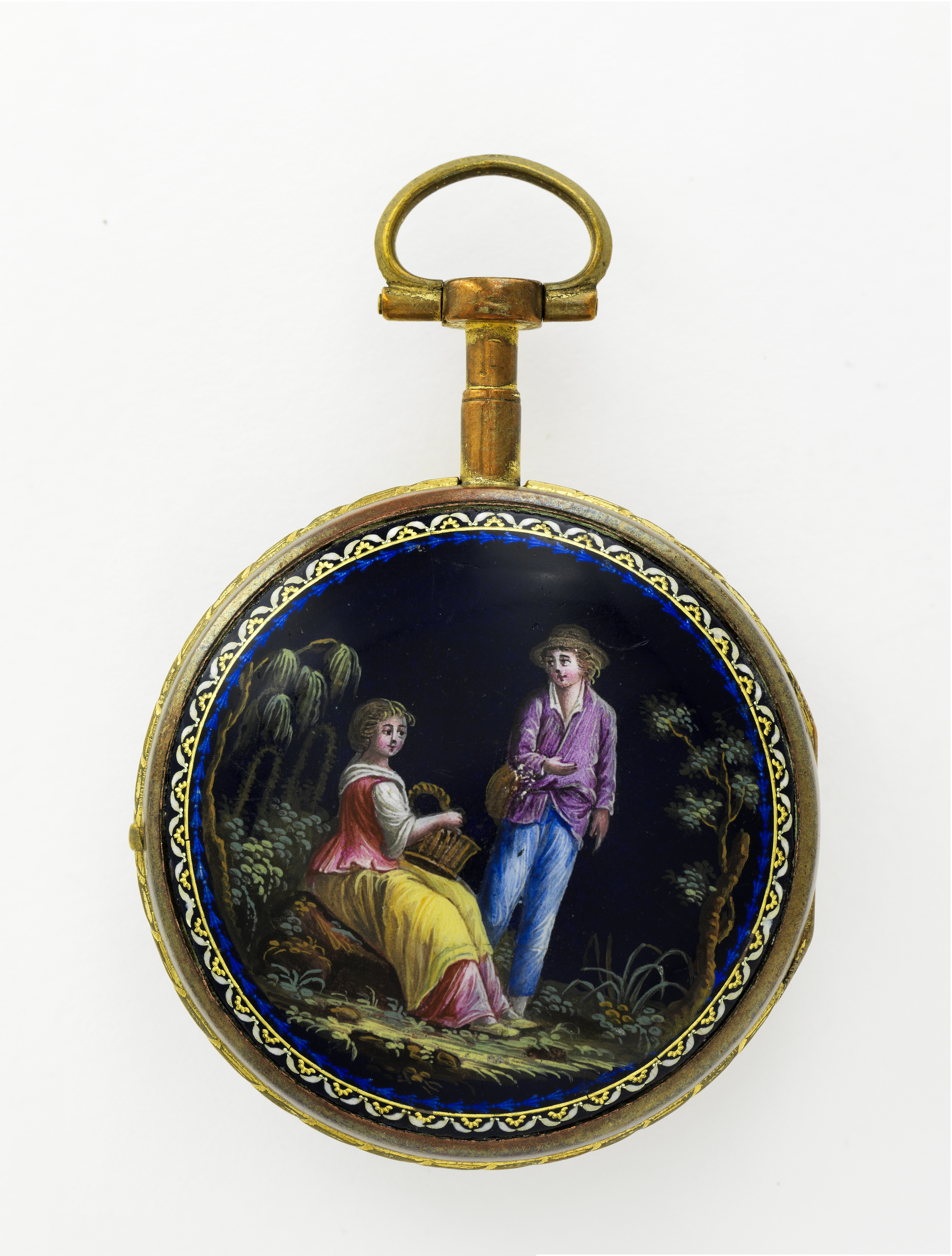 Gehäuse ist graviert, Gehäuserückseite emailliert. Abgebildet ist ein Pärchen auf blauem, opakem Grund zwischen Bäumen und Sträuchern. Die Frau sitzt und hält einen Korb auf dem Schoß, der Mann steht und trägt eine Tasche unter dem Arm. Der Aufzug erfolgt durch das weiße Emailziffernblatt knapp unterhalb der „1“ und „2“. Sowohl Stunden als auch Minutenziffern sind arabisch ausgeführt, die Zeiger durchbrochenem Buntmetall. Die verstifteten Platinen des Uhrwerkes sind graviert und signiert „Anton Hamer a Brün“. Die Spindelbrücke ist graviert und durchbrochen. Die Zapfen lagern in Messing, der Unruhzapfen ist zusätzlich mit einem polierten Stahlplättchen versehen. Das Uhrwerk verfügt über Kette und Schnecke sowie eine Spindelhemmung. - Antriebsart