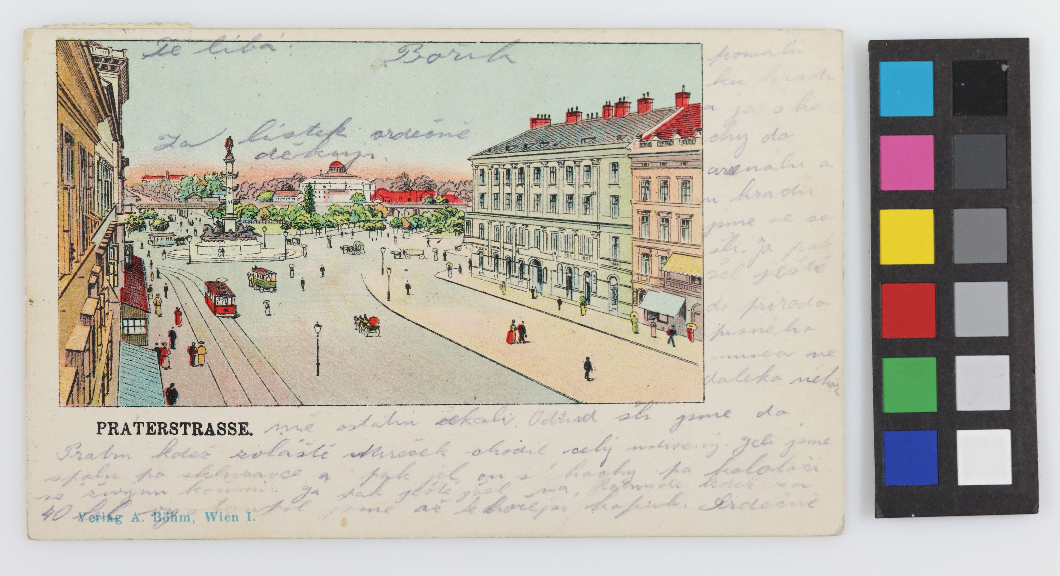 In der Oper, die ich vorgestern besuchte, gefiel es mir sehr, man spielte “Wiener Walzer, die Puppenfee und die Erde und die Sonne”. Gestern waren wir in Schönbrunn, wo es den Buben sehr gefiel. Heute dann ging Mutti mit Mirco/ [Fortsetzung Vorderseite] langsam zur Burg und ich mit den Buben ins Arsenal und bei der Burg trafen wir uns. Dann ging ich noch ins Naturhistorische Museum unweit dessen mich die anderen erwarteten. Von dort gingen wir in den Prater, wo besonders Mireček ganz erstaunt umherspazierte. Zusammen fuhren wir auf der Rutsche und dann fuhr er mit den Buben auf dem Ringelspiel mit lebendigen Pferden. Ich ging dann noch zur Rotunde, wo wir für 40 Heller bis zur höchsten Kuppel hinaufgestiegen sind. Herzlich [Fortsetzung im Bild] küsst Dich [Name]. Für die Karte danke ich herzlich.Transkription / Übersetzung durch Ehrenamtliche im Rahmen der Crowdsourcing Aktion 2021/2022 (nicht überprüft durch das Wien Museum)