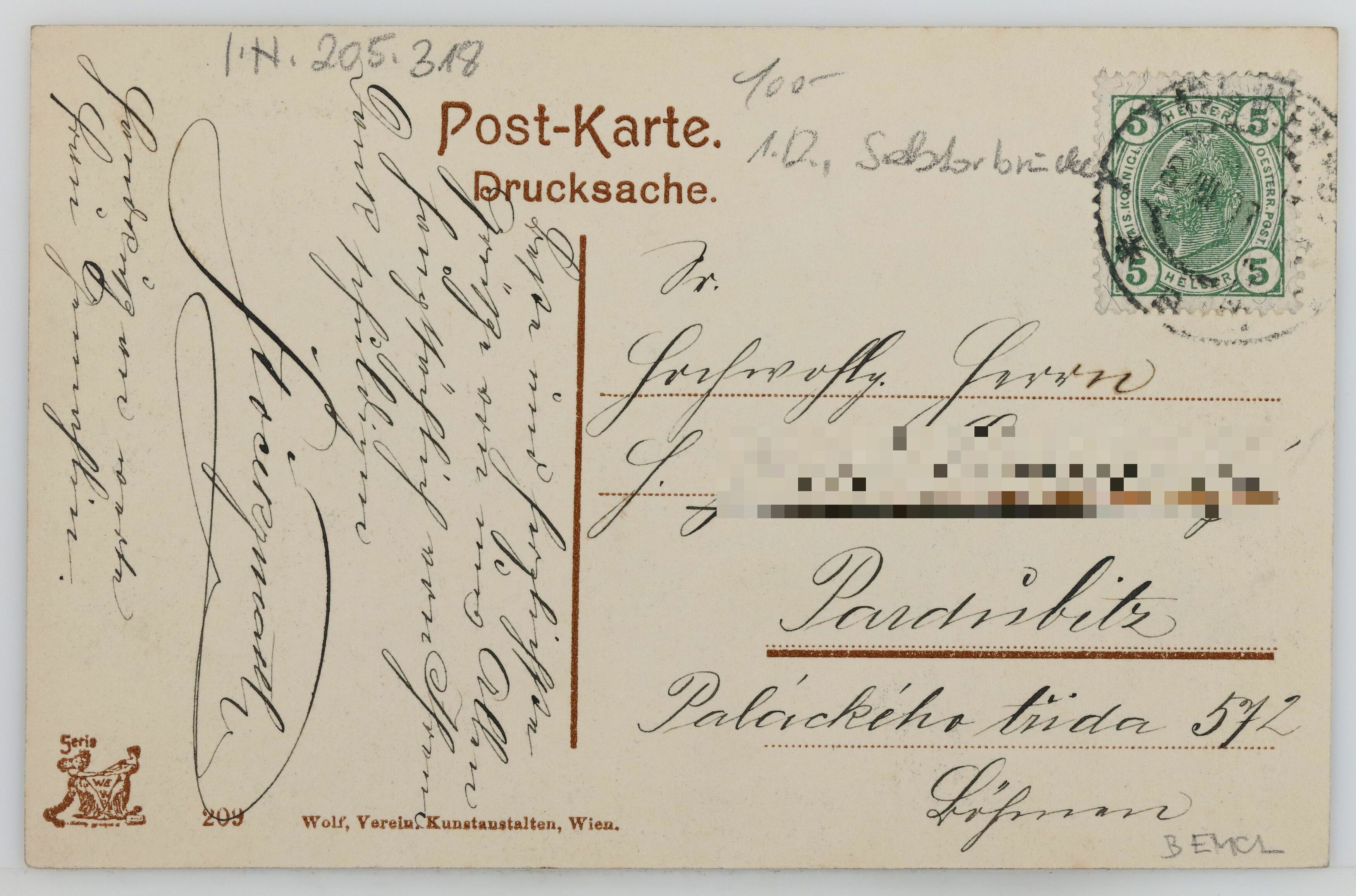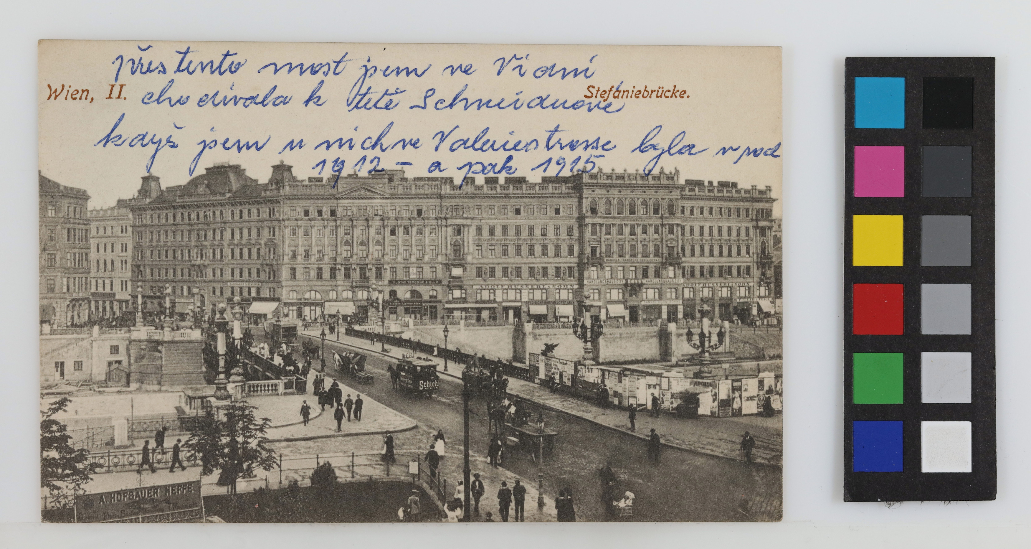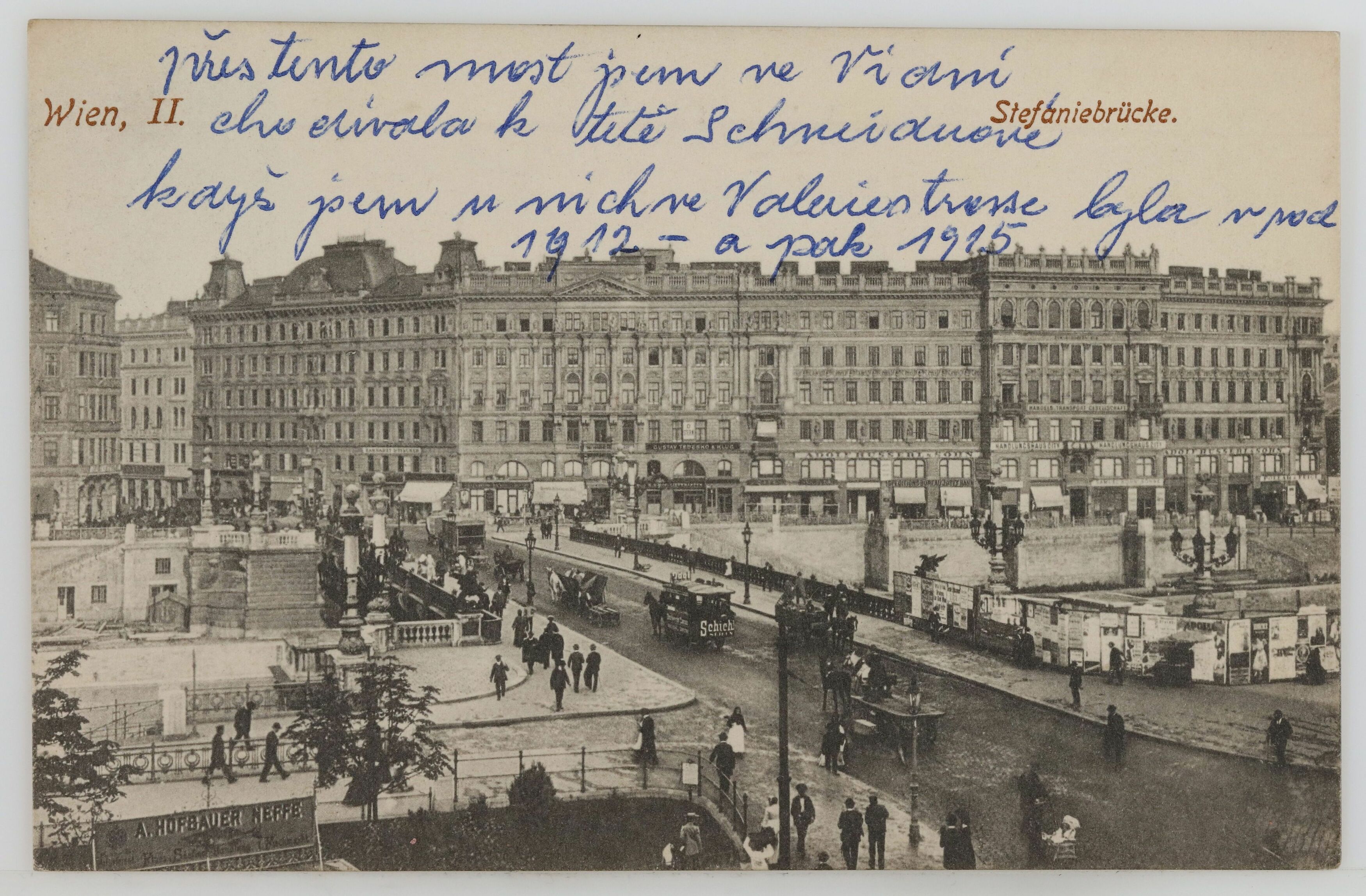 Über diese Brücke bin ich mit Tante Schneider gegangen, als ich im Jahr 1912 und dann 1915 bei ihr in der Valeriestraße war.Transkription / Übersetzung durch Ehrenamtliche im Rahmen der Crowdsourcing Aktion 2021/2022 (nicht überprüft durch das Wien Museum)