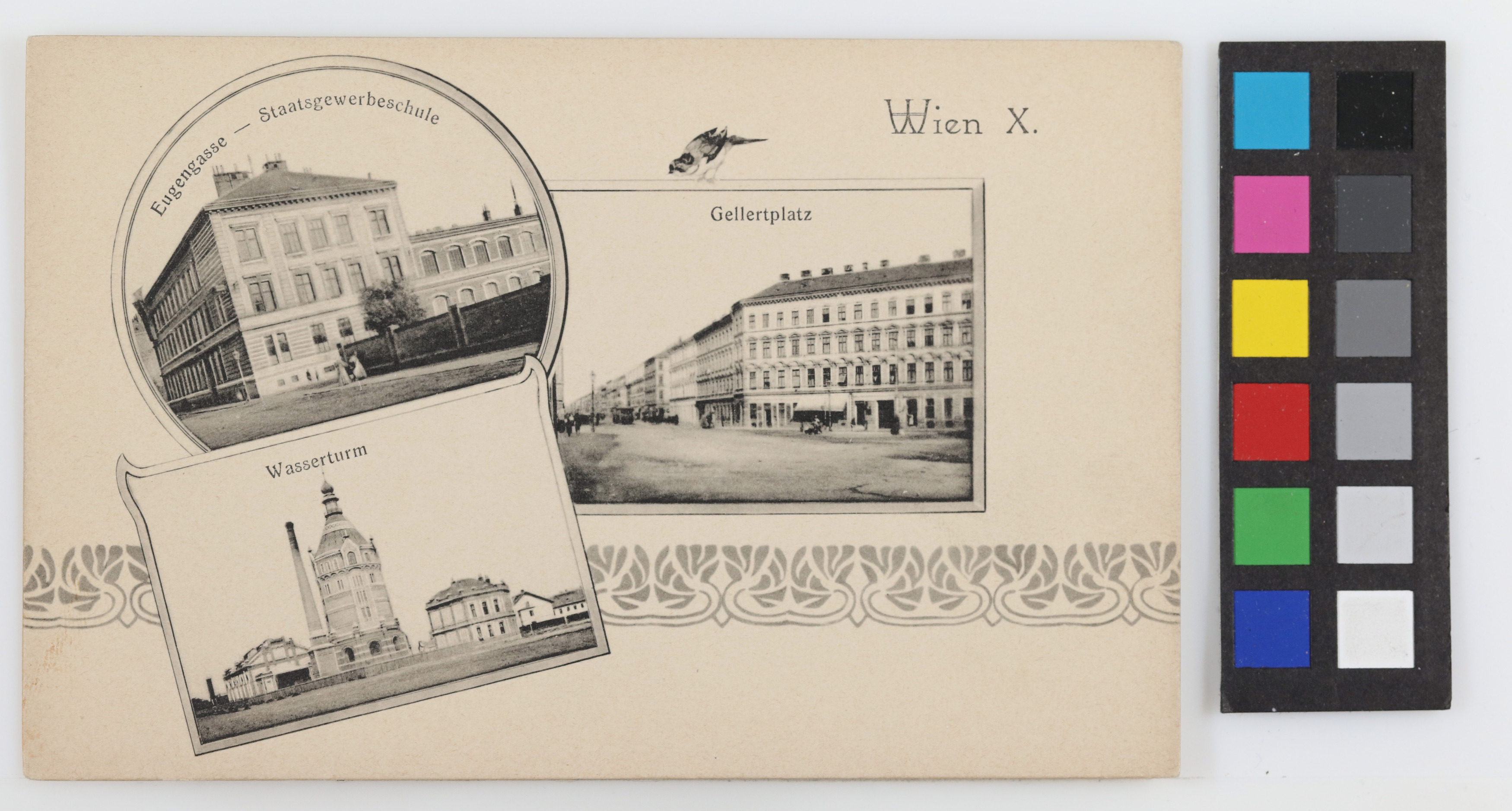 10., Allgemein - Mehrbildkarte: Eugengasse - Staatsgewerbeschule, Gellertplatz und Wasserturm, Ansichtskarte