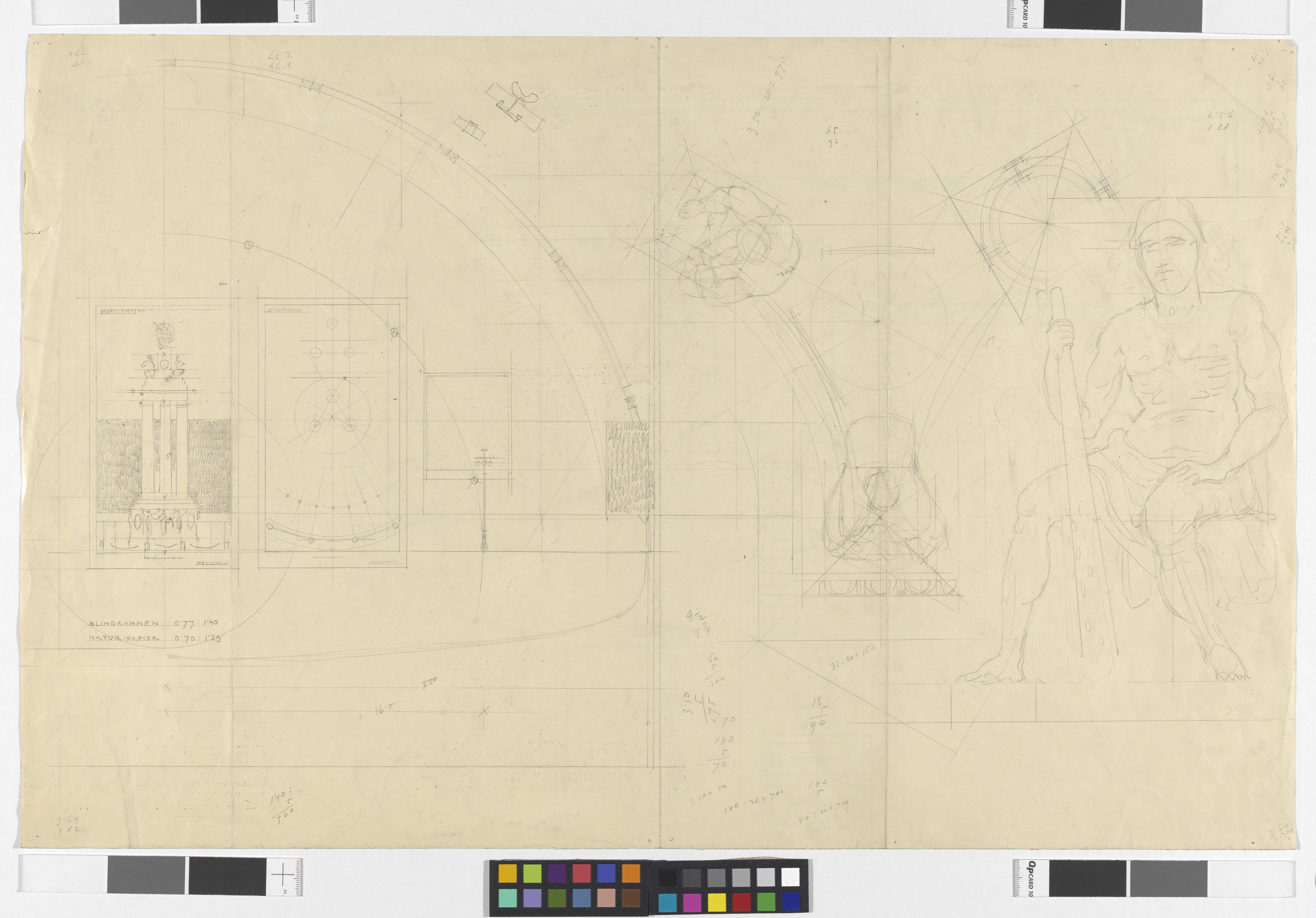 Denkmal vor Schloß Schönbrunn, Aufriss, Draufsicht, Grundriss, Figur / verso: Lupusheim, Dachaufsicht (Druck) und Bleistiftskizzen zur Friedenskirche auf der Schmelz (?)
