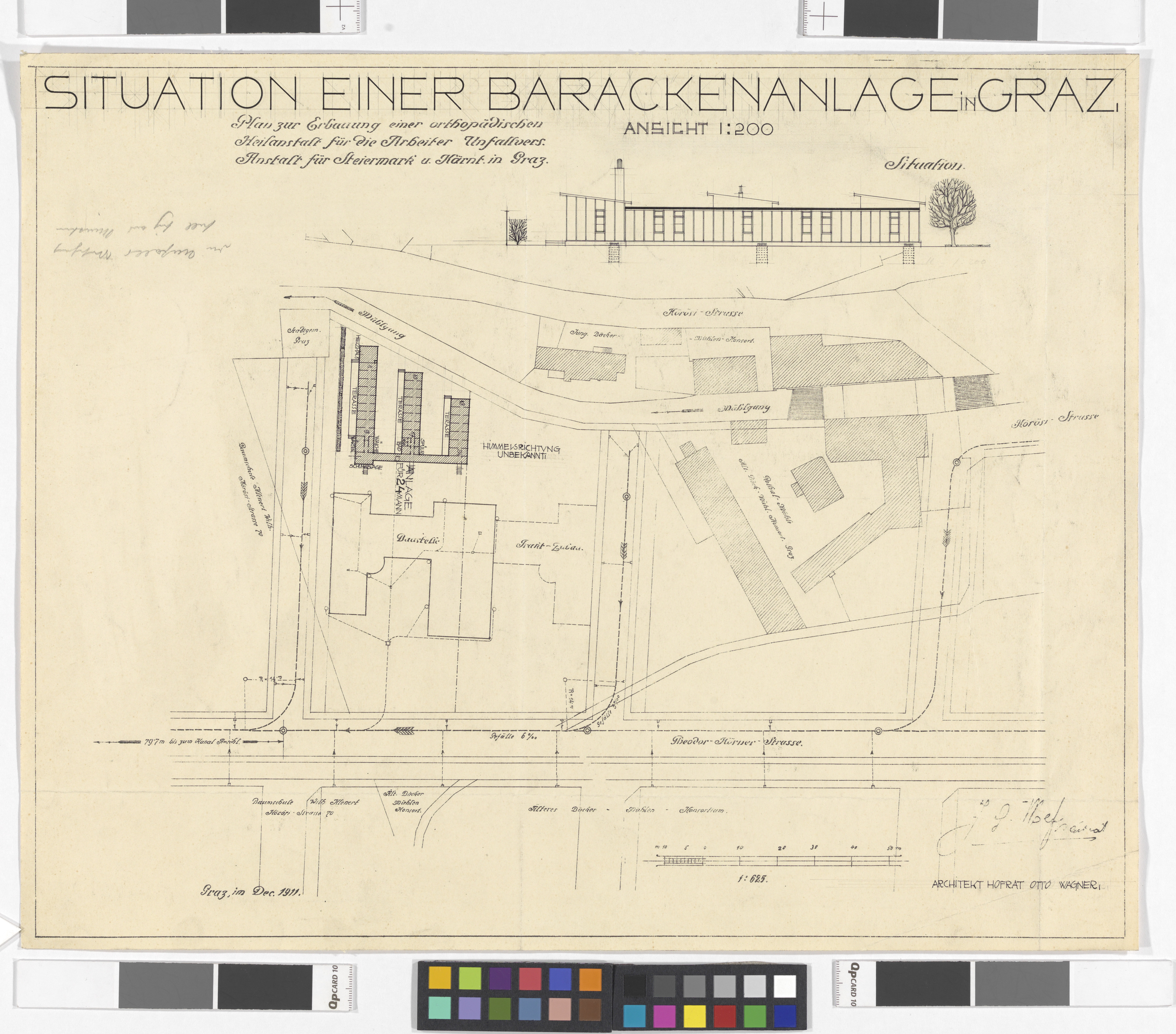 Barackenanlage für die orthopädische Heilanstalt der Arbeiter-Unfallversicherungs-Anstalt in Graz, Situationsplan und Ansicht