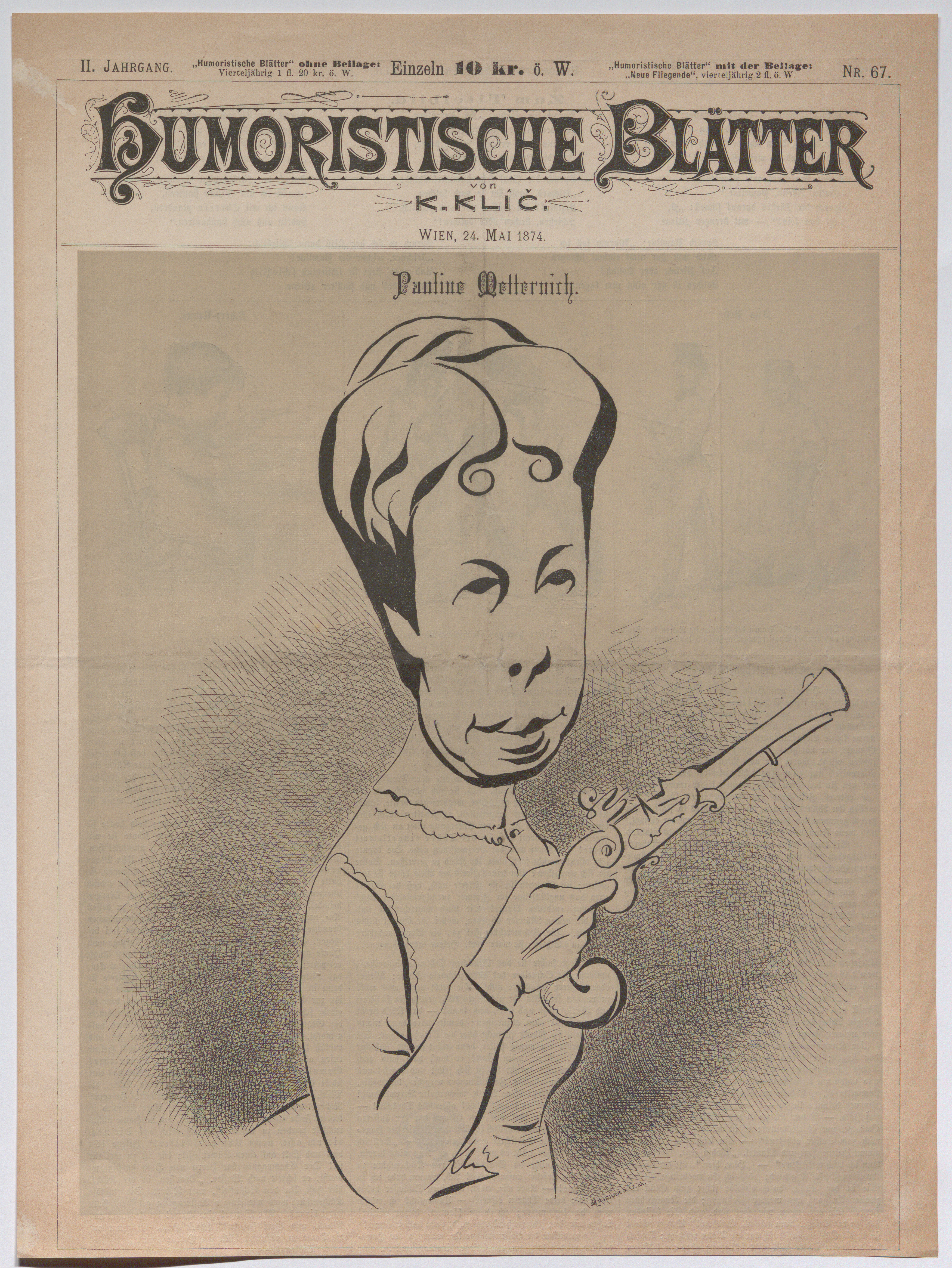 - Pauline Fürstin Metternich-Sándor mit Pistole (Titelblatt von "Humoristische Blätter")