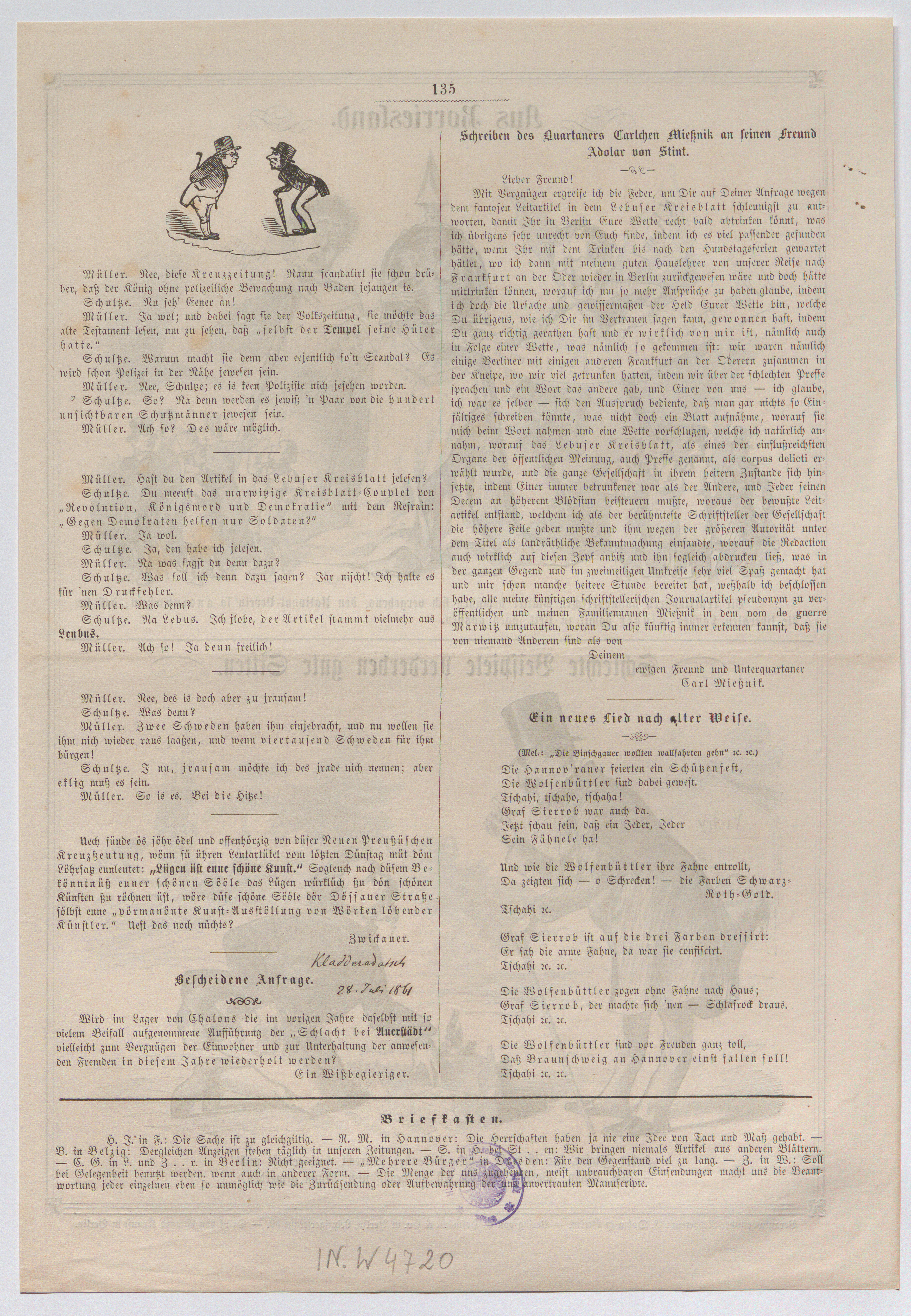 - Die reaktionären hannoveranischen Blätter bemühen sich, den National-Verein auszuputzen; Kaiser Napoleon III. stellt Victor (Hugo ?) wegen der Güter der Bourbonen zur Rede (Karikaturenmit Text aus "Kladderadatsch")