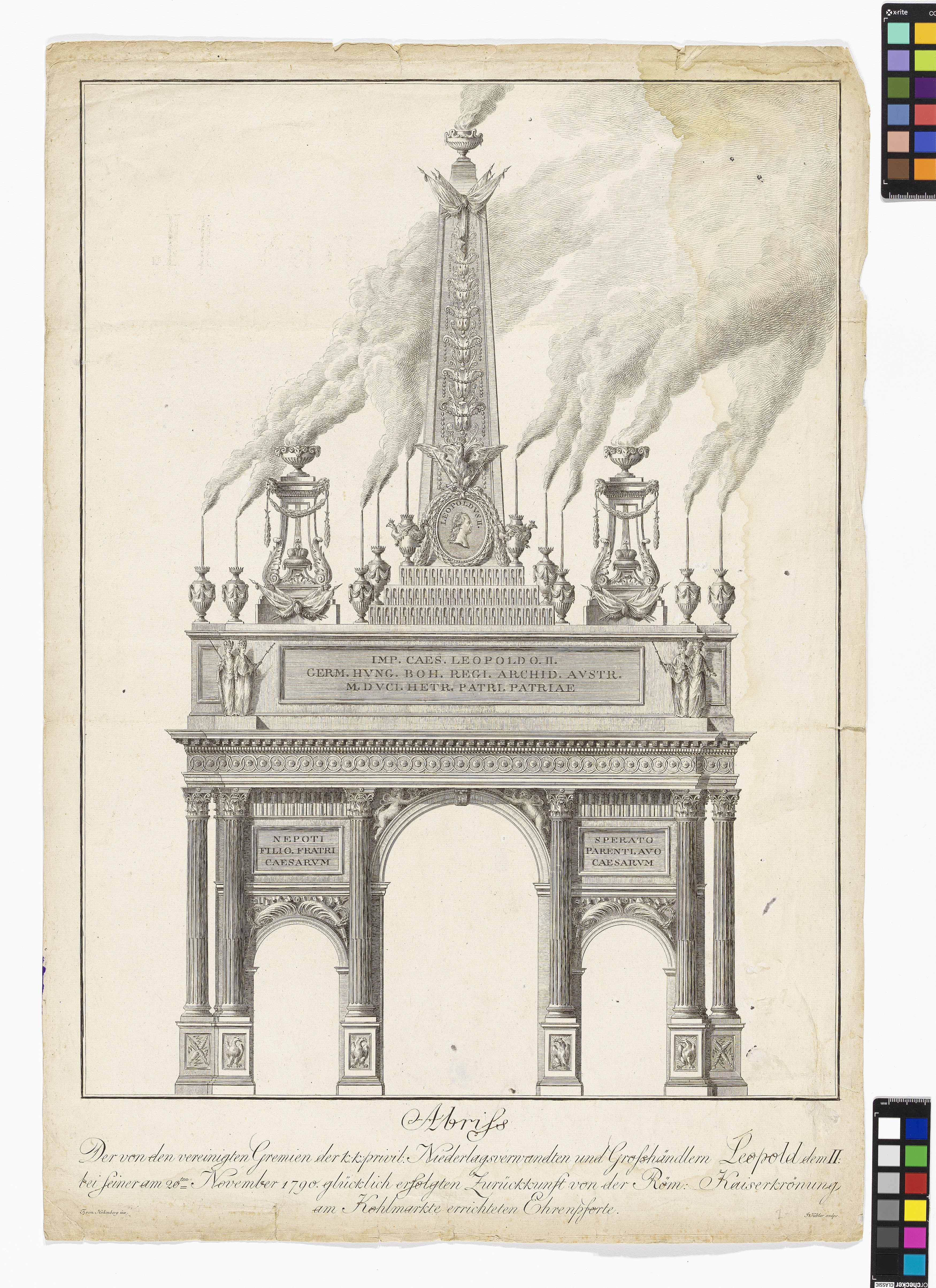 - “Abriss / der von den vereinigten Gremien der k. k. privil. Niederlagsverwandten und Großhändlern Leopold dem II. / bei seiner am 20.ten November 1790 glücklich erfolgten Zurückkunft von der Röm. Kaiserkrönung / am Kohlmartkte errichteten Ehrenpforte”