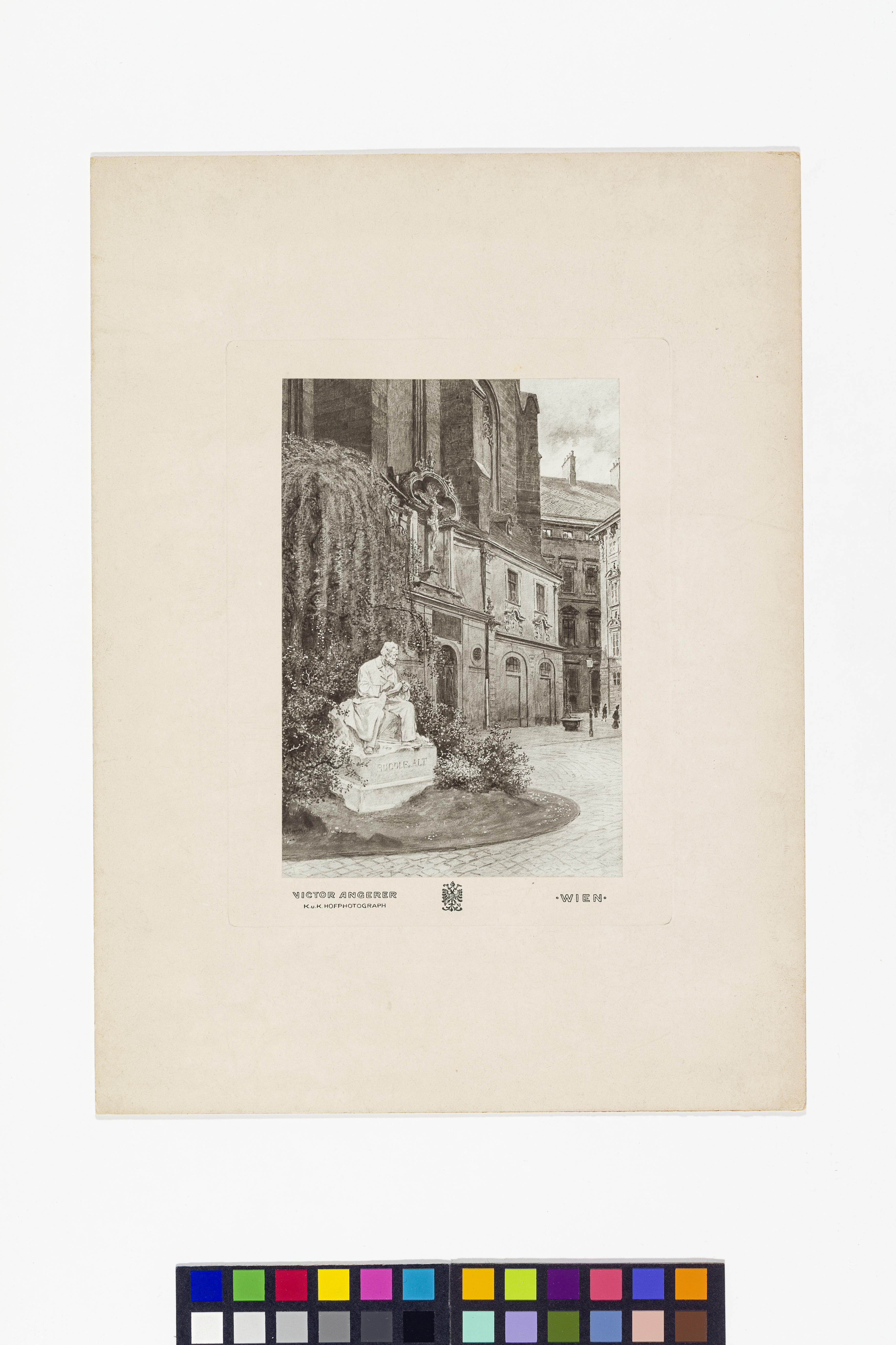 - Untersatzkarton: recto: l.u. " VICTOR ANGERER / K.u.K. HOFPHOTOGRAPH", re.u.:" WIEN" (Druck); verso: re.o. “EINREICHUNGS-PROTOKOLL DES K.K. MINISTERIUMS DES INNEREN”(Stempel) mit einer 30 Heller Marke.