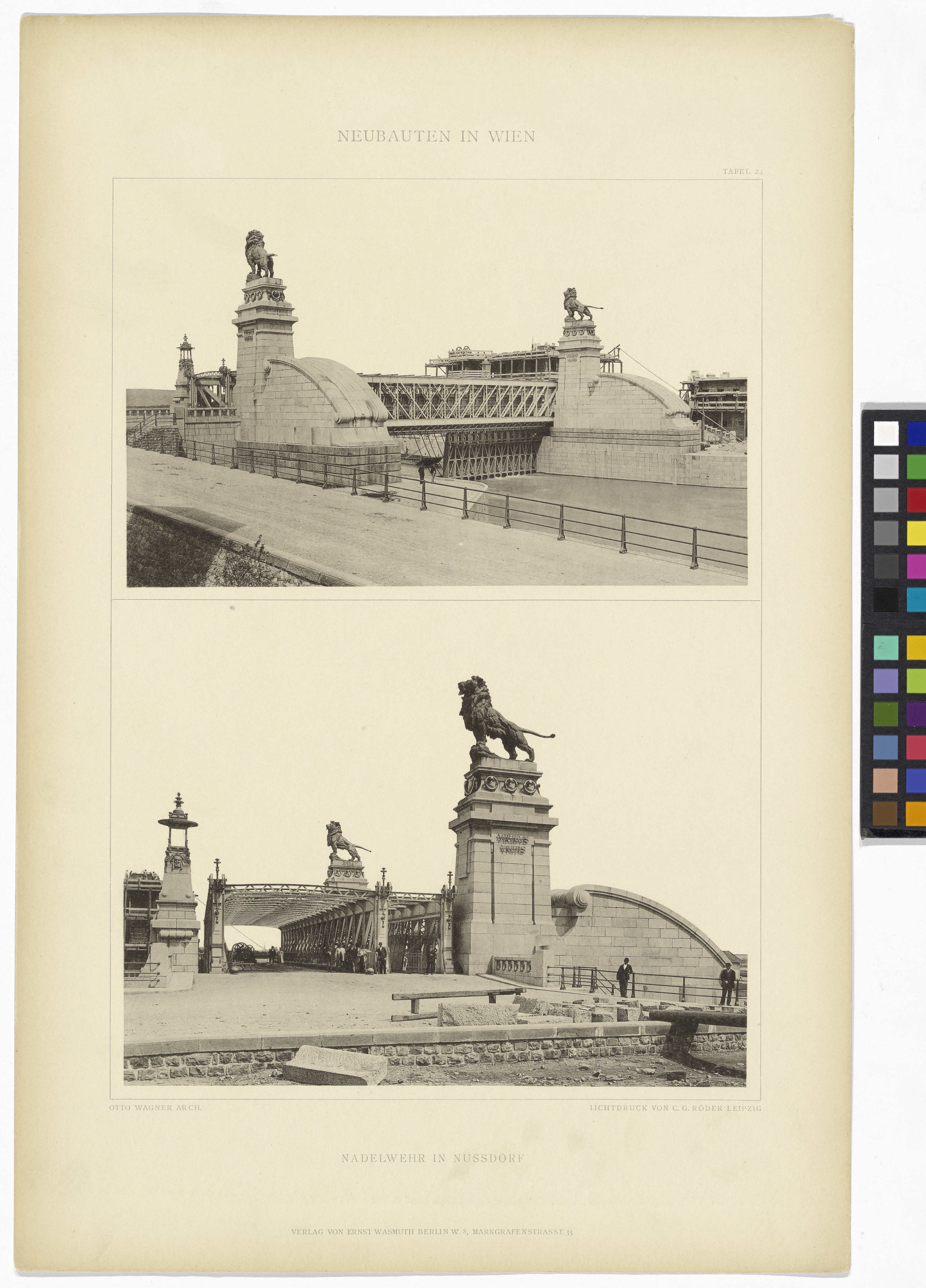 Nadelwehr in Nussdorf, Donaukanal, Nussdorfer Schleuse, Seitenansicht und Durchsicht (Moderne Städtebilder. Abtheilung IV. Neubauten in Wien, Berlin 1900, Tafel 24)