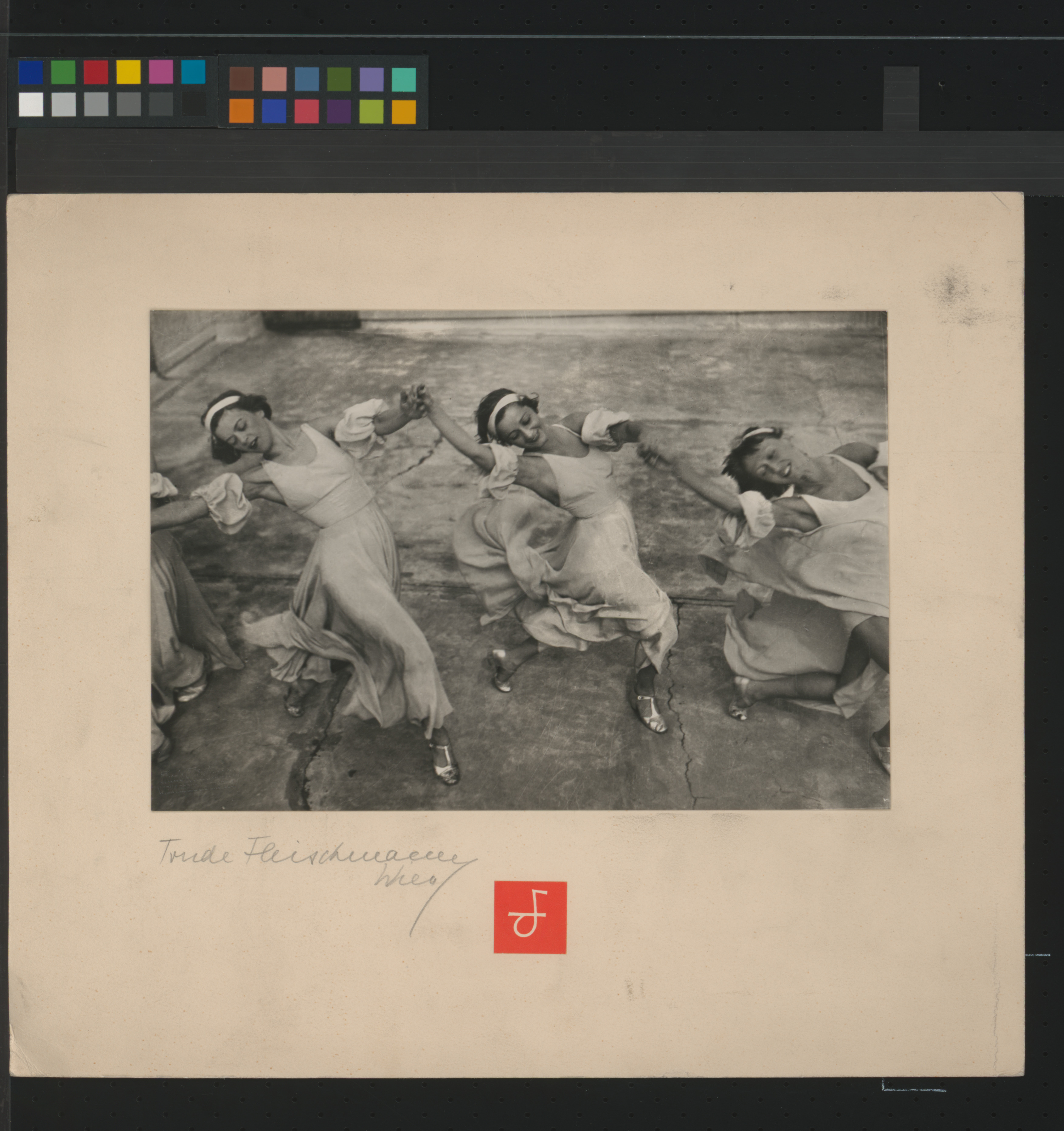 - Fotografie: VS: li. u.: Trude Fleischmann / WIEN I. EBENDORFERSTR. 3 (Prägestempel); Untersatzkarton: RS: Toni Birkmeyer-Balett / “Kaiserwalzer” (Bleistift)